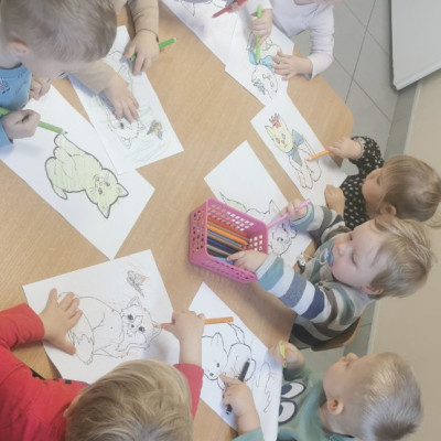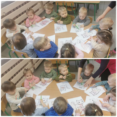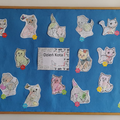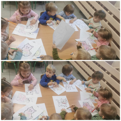 Dzisiaj kontynuując świętowanie "Światowego Dnia Kota" mali podopieczni wykolorowali sylwetki kotków różnokolorowymi kredkami, ćwicząc przy tym motorykę małą oraz nazwy i rozpoznawanie kolorów. Gotowe prace zostały powieszone na tablicy w żłobkowym korytarzu.