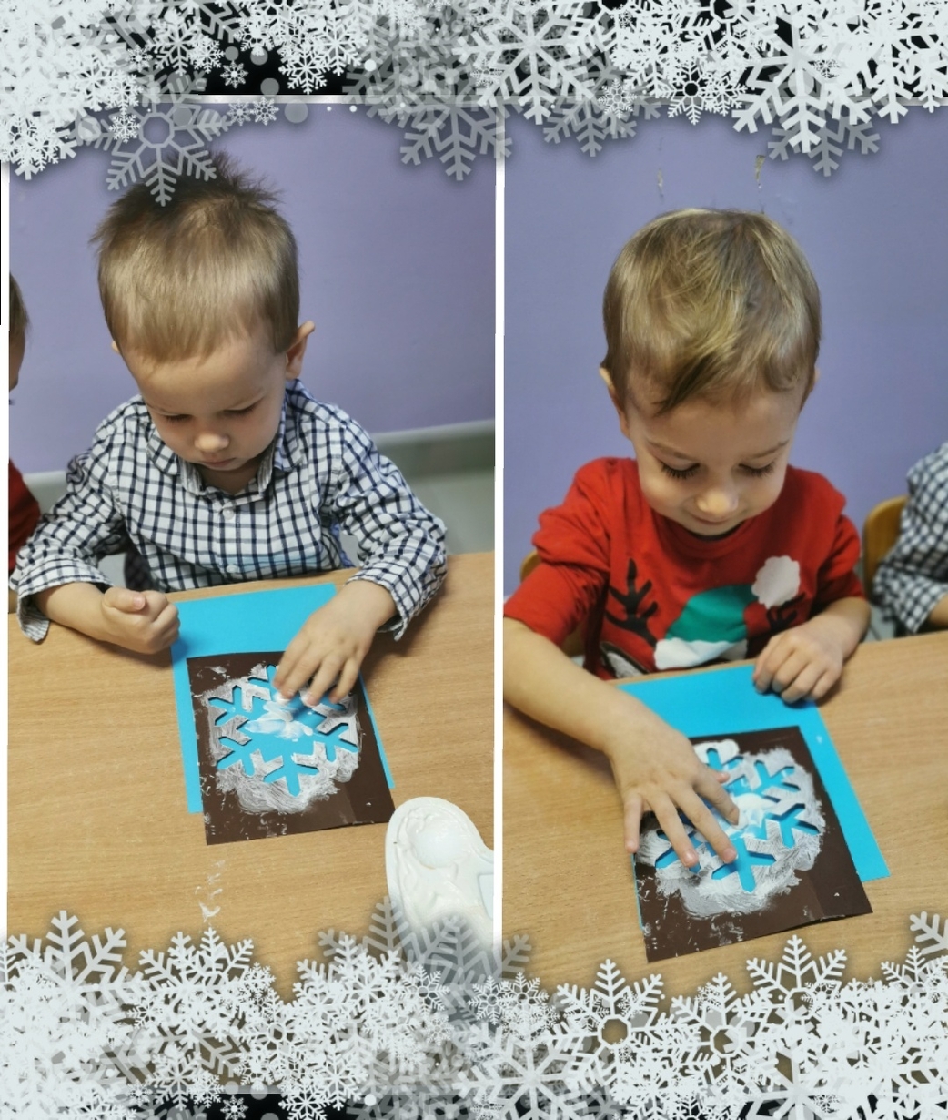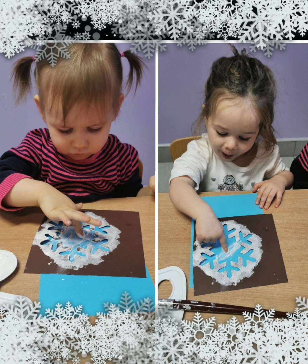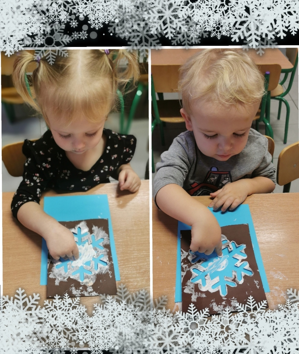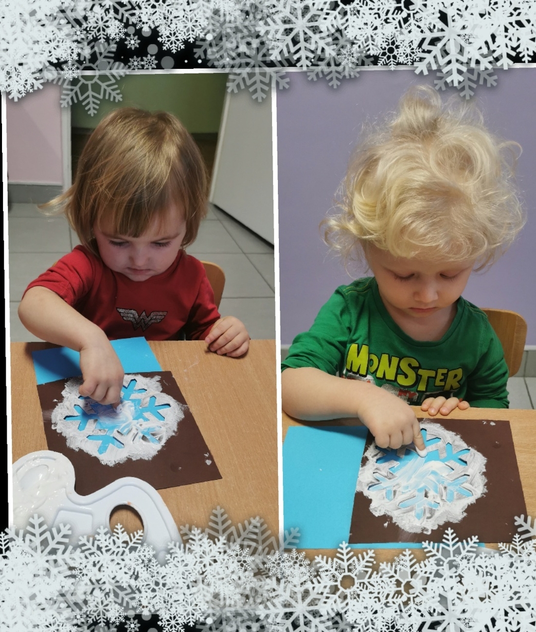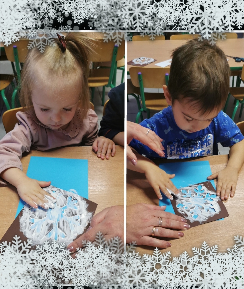Stworzyliśmy je z wykorzystaniem białej farby , którą dzieci rozcierały paluszkami na szablonie przedstawiającym płatki śniegu,
