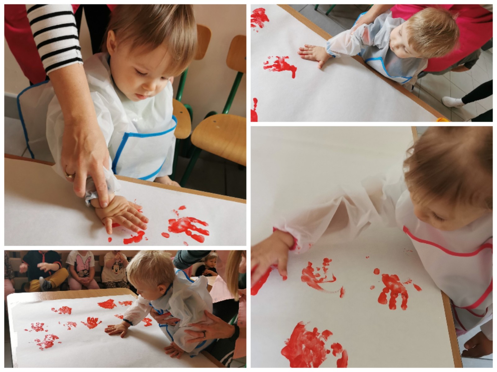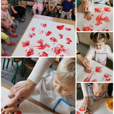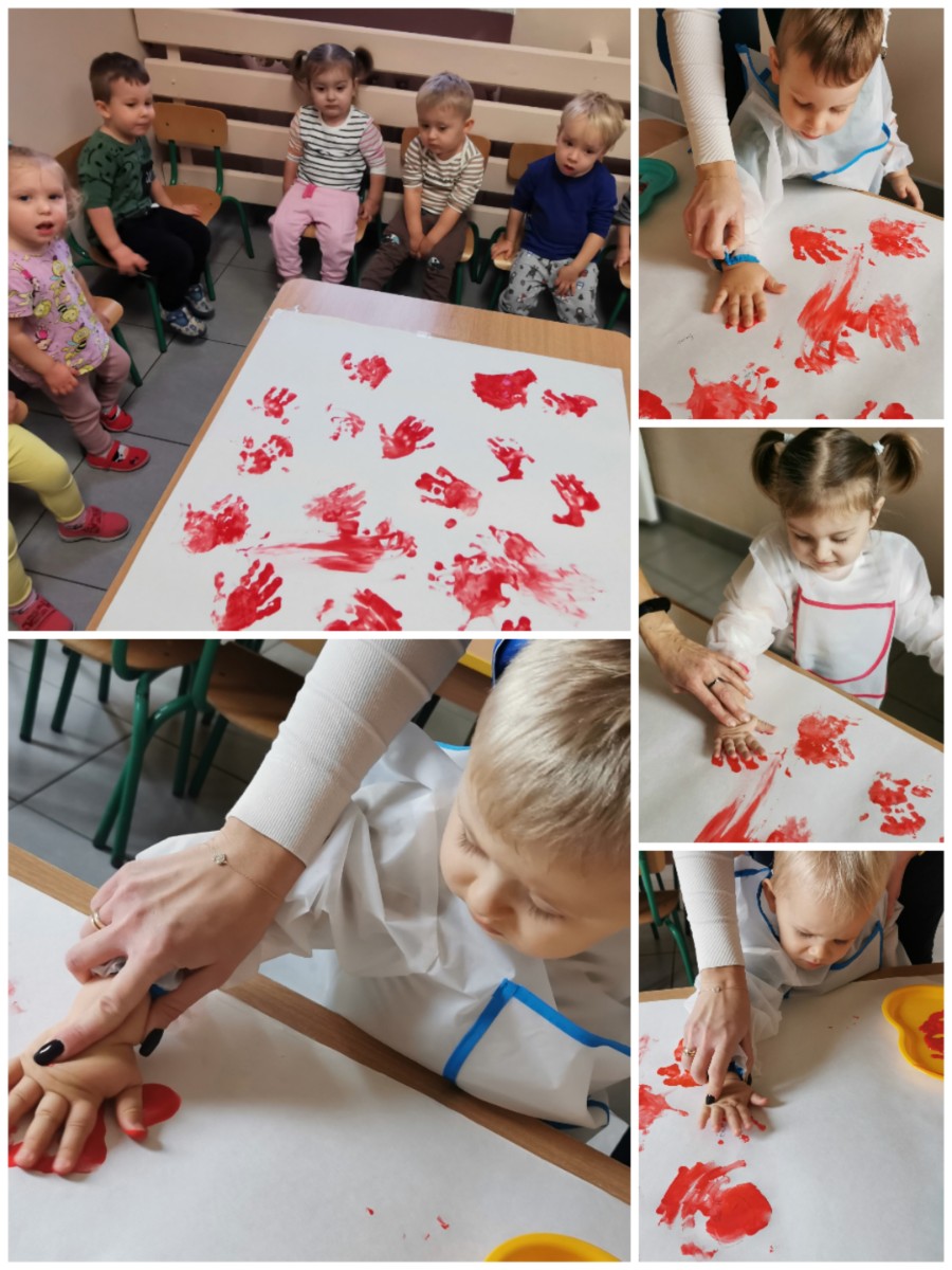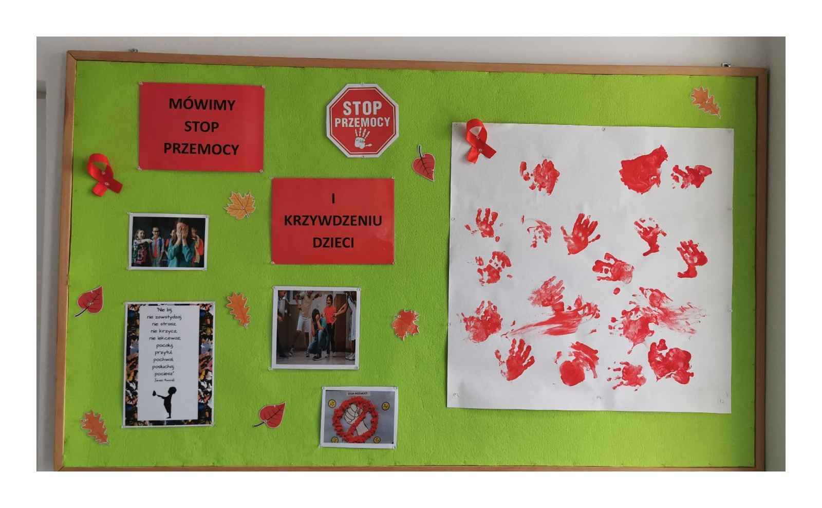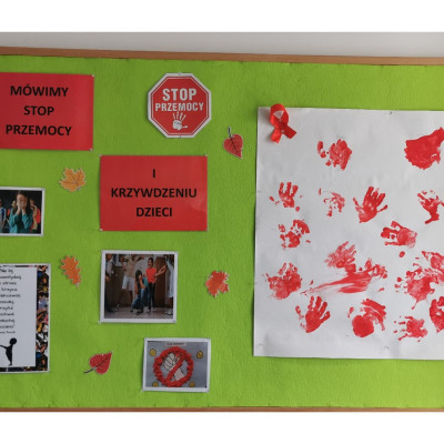 Nasi podopieczni wykonali wspólną pracę, na której odbili rączki czerwoną farbą jako symbol spraeciwu wobec przemocy.