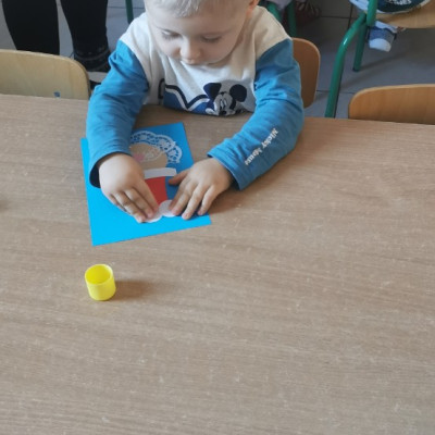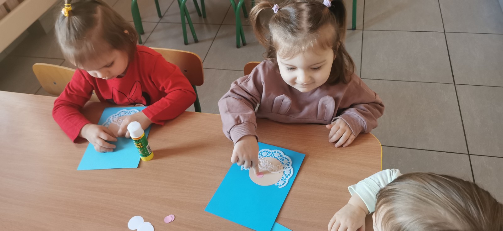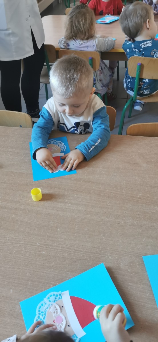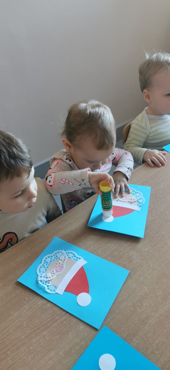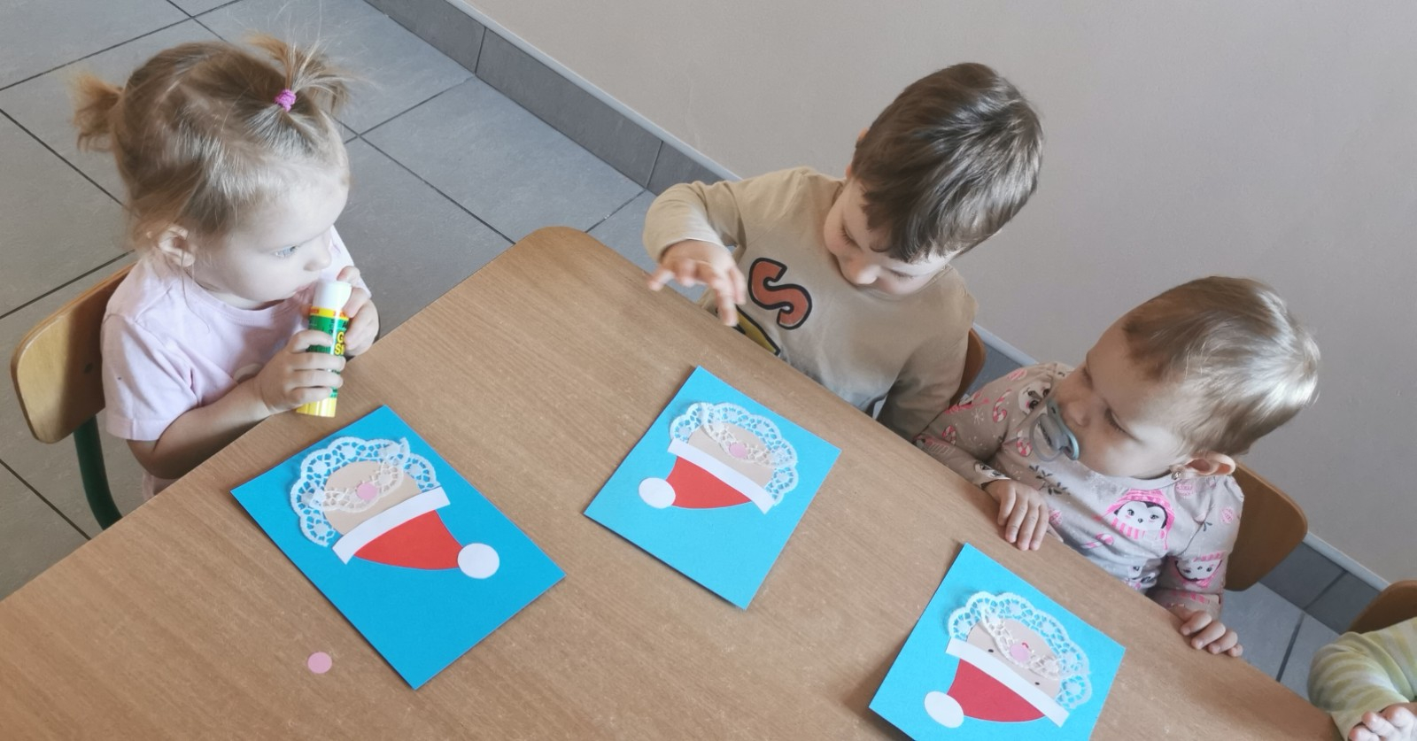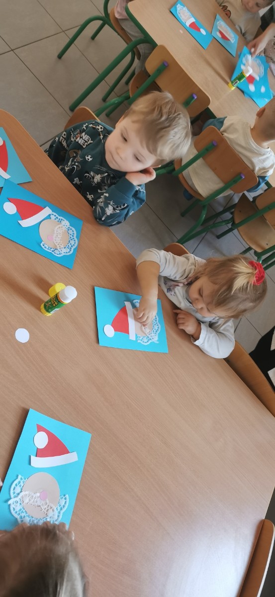 Zdjęcie przedstawia dzieci wykonujące mikołajkowe prace plastyczne.