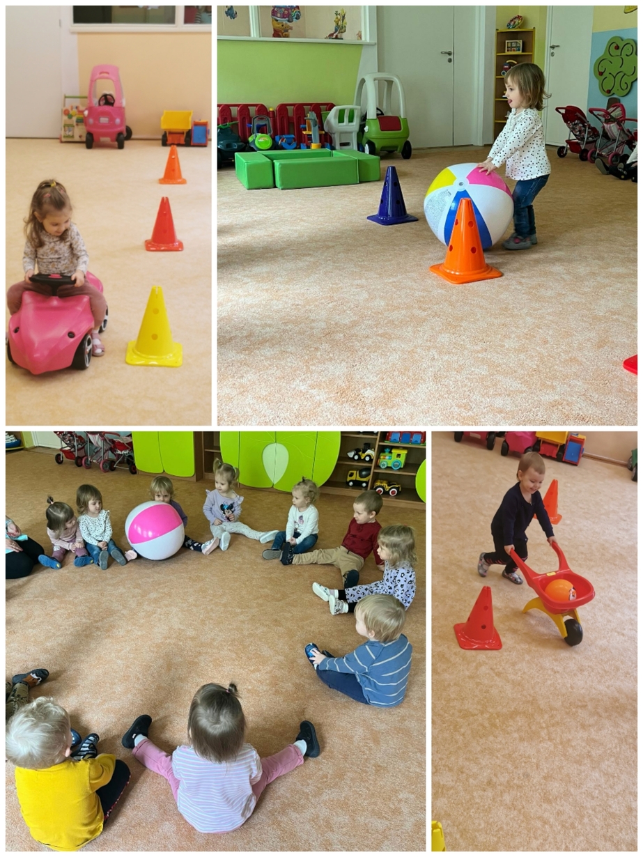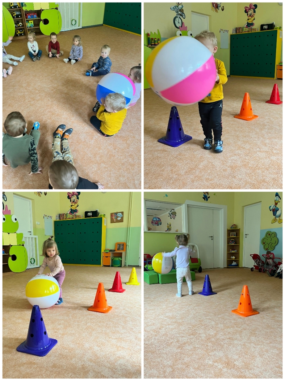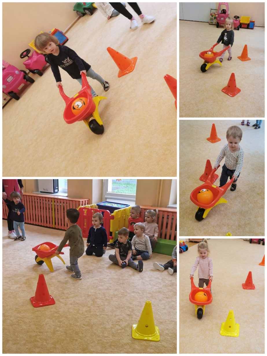 Dzisiaj dzieci aktywnie uczestniczyły w zajęciach ruchowych. Tym razem ciocie stworzyły tor, który dzieci pokonywały kozłując, turlając, bądź trzymając piłkę. Był również marsz z taczkami, rzucanie piłką do celu, czy slalom autkiem. Dzień upłynął nam aktywnie i wesoło.