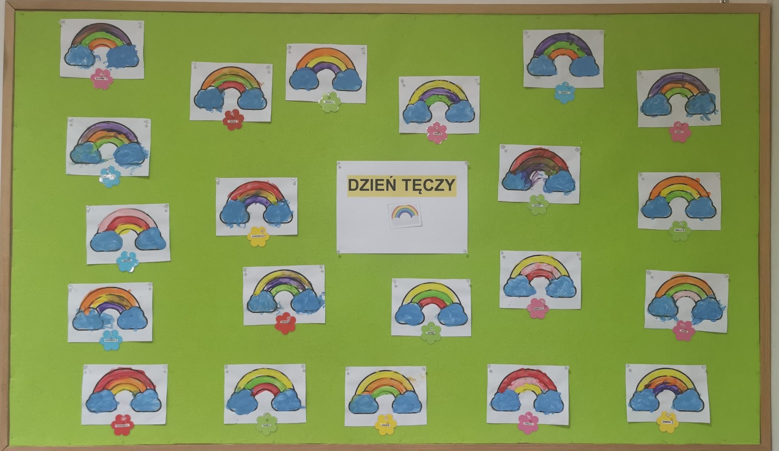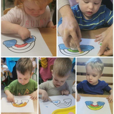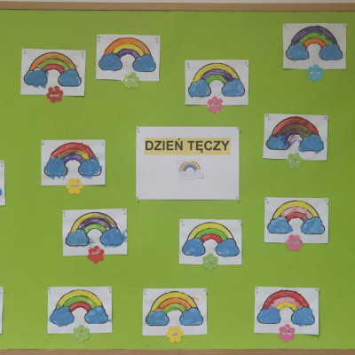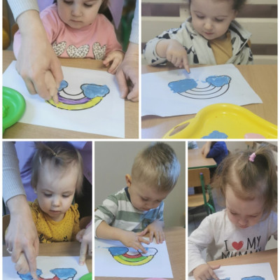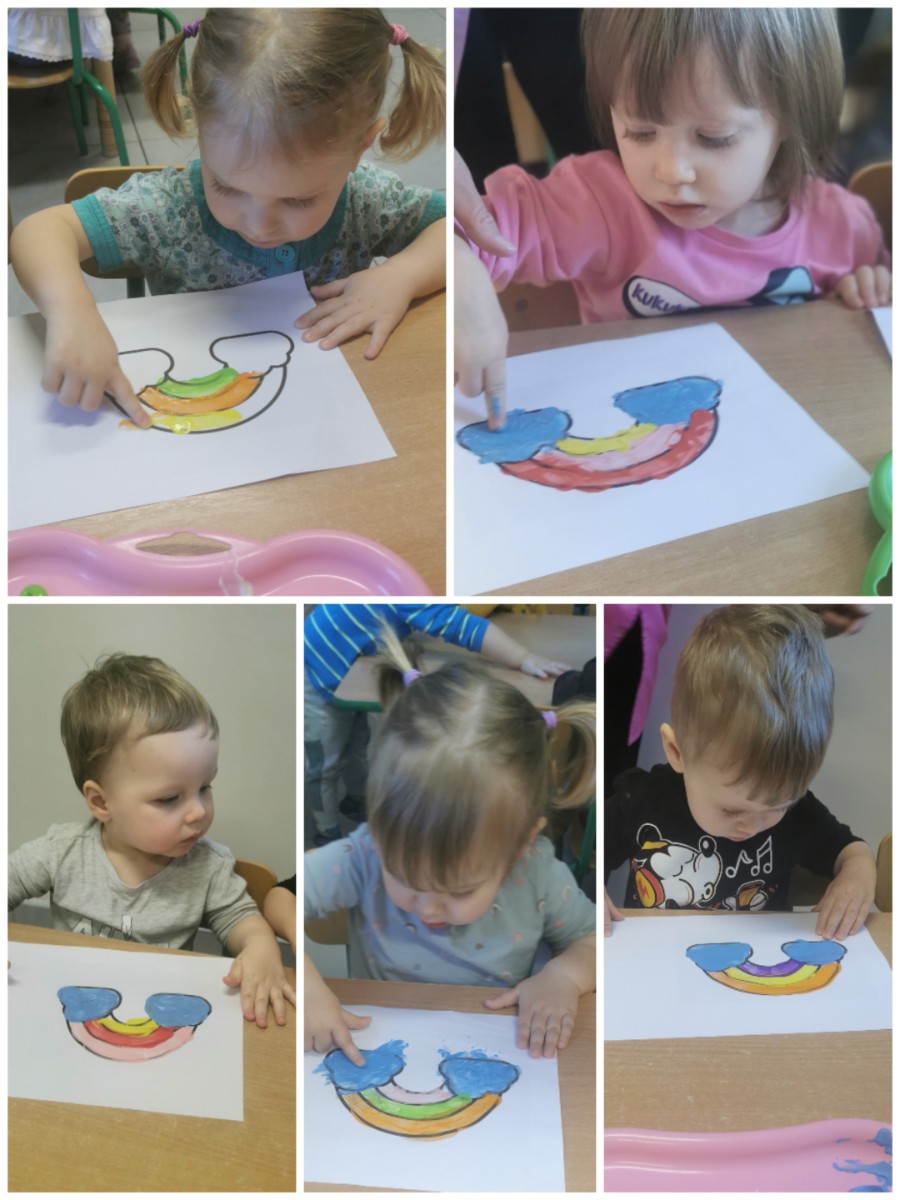 Dzisiaj u nas tęczowo i radośnie. Nasze uzdolnione Biedroneczki wykonały kolejne prace plastyczne, których tematem była tęcza. Dzieci ćwicząc motorykę małą malowały tęczę kolorowymi farbkami paluszkami. Precyzję i talent naszych milusińskich można podziwiać na żłobkowej tablicy oraz na załączonych zdjęciach.