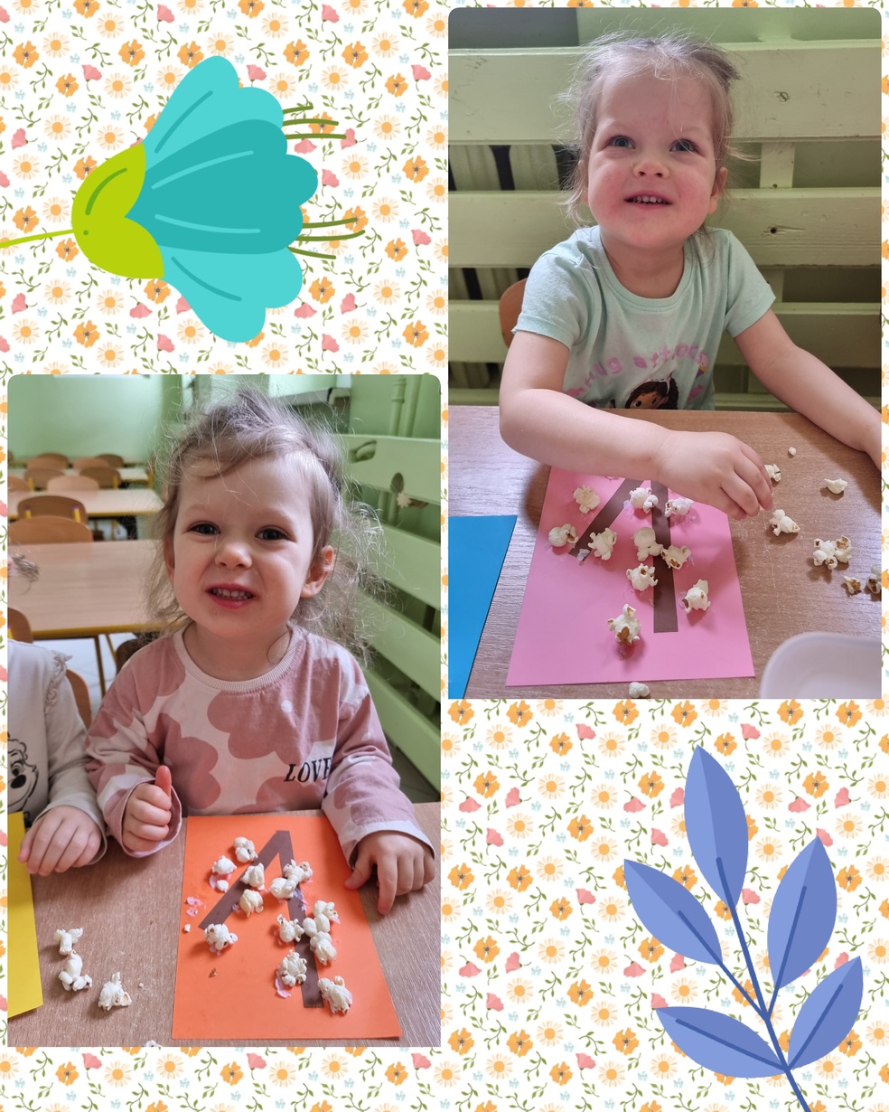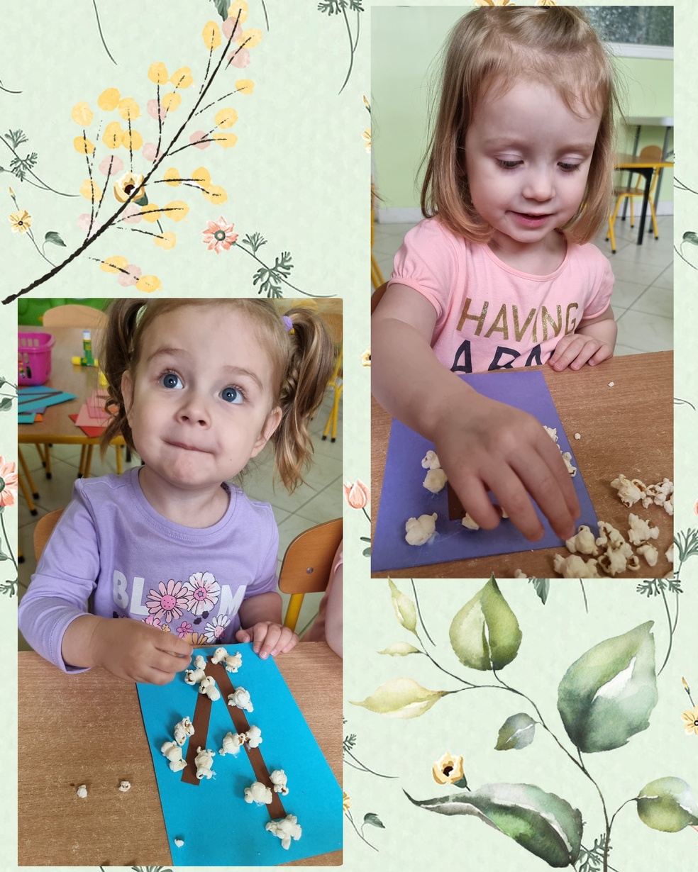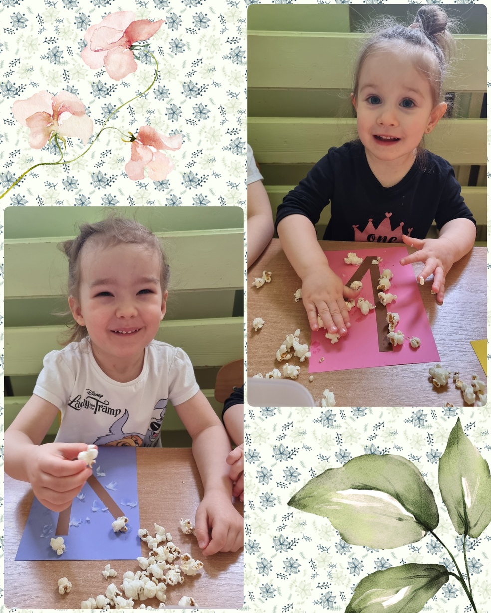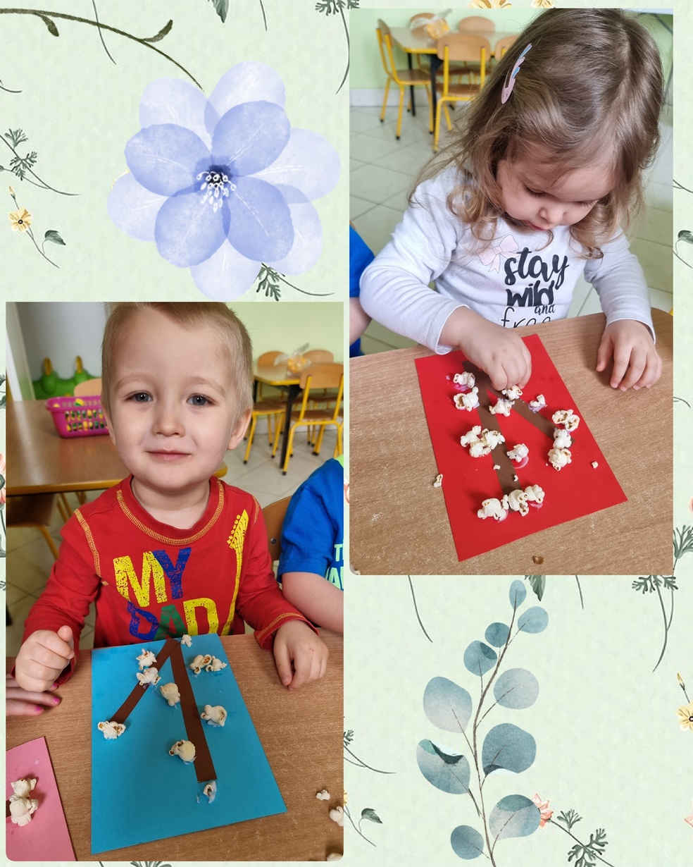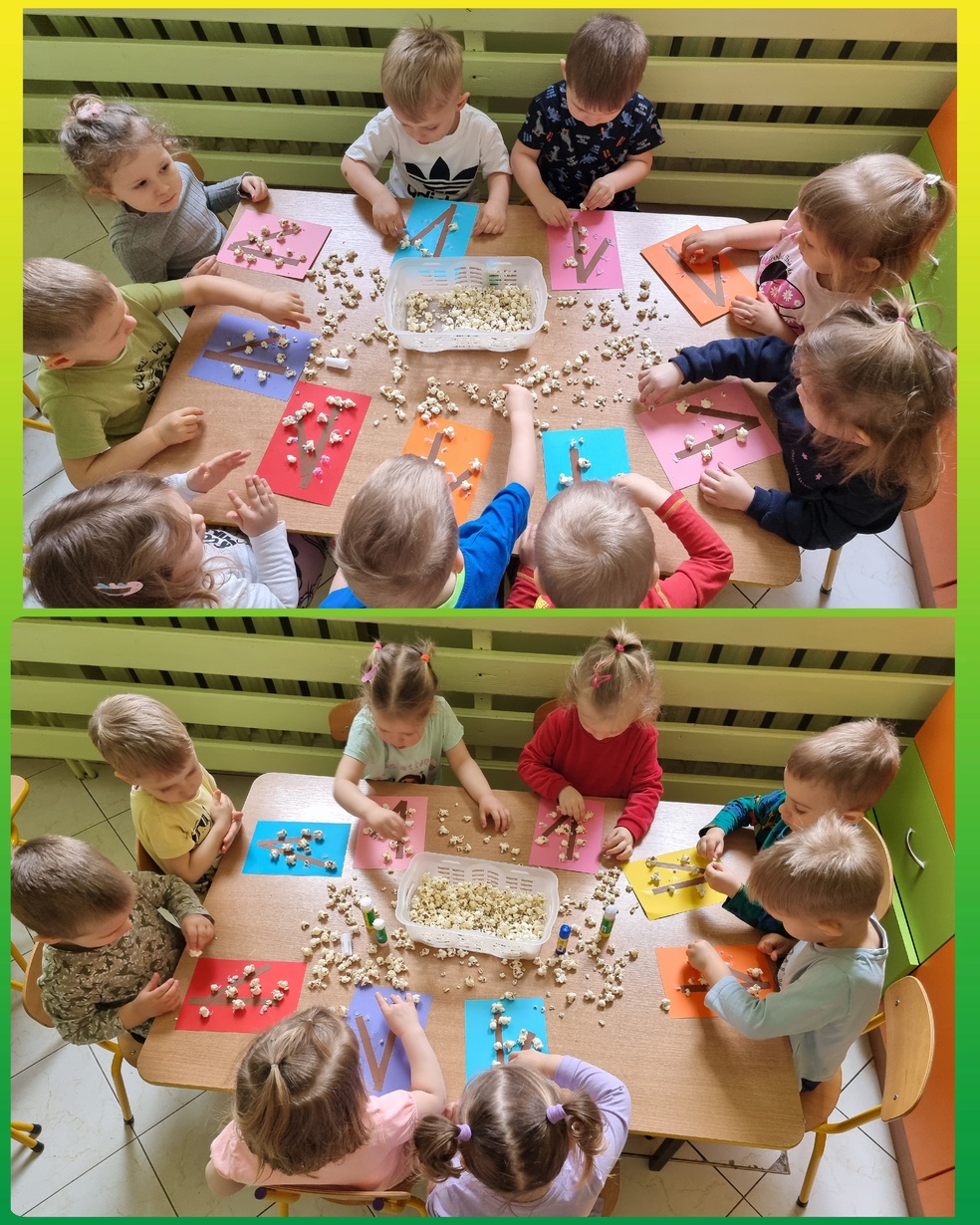 (Na kolorowej kartce papieru przyklejały klejem popcorn ).