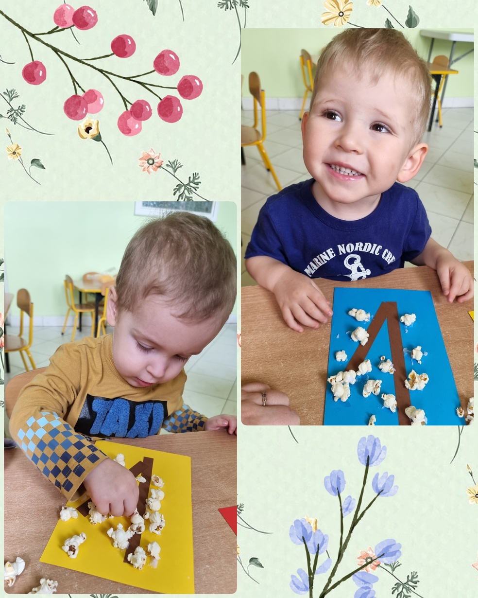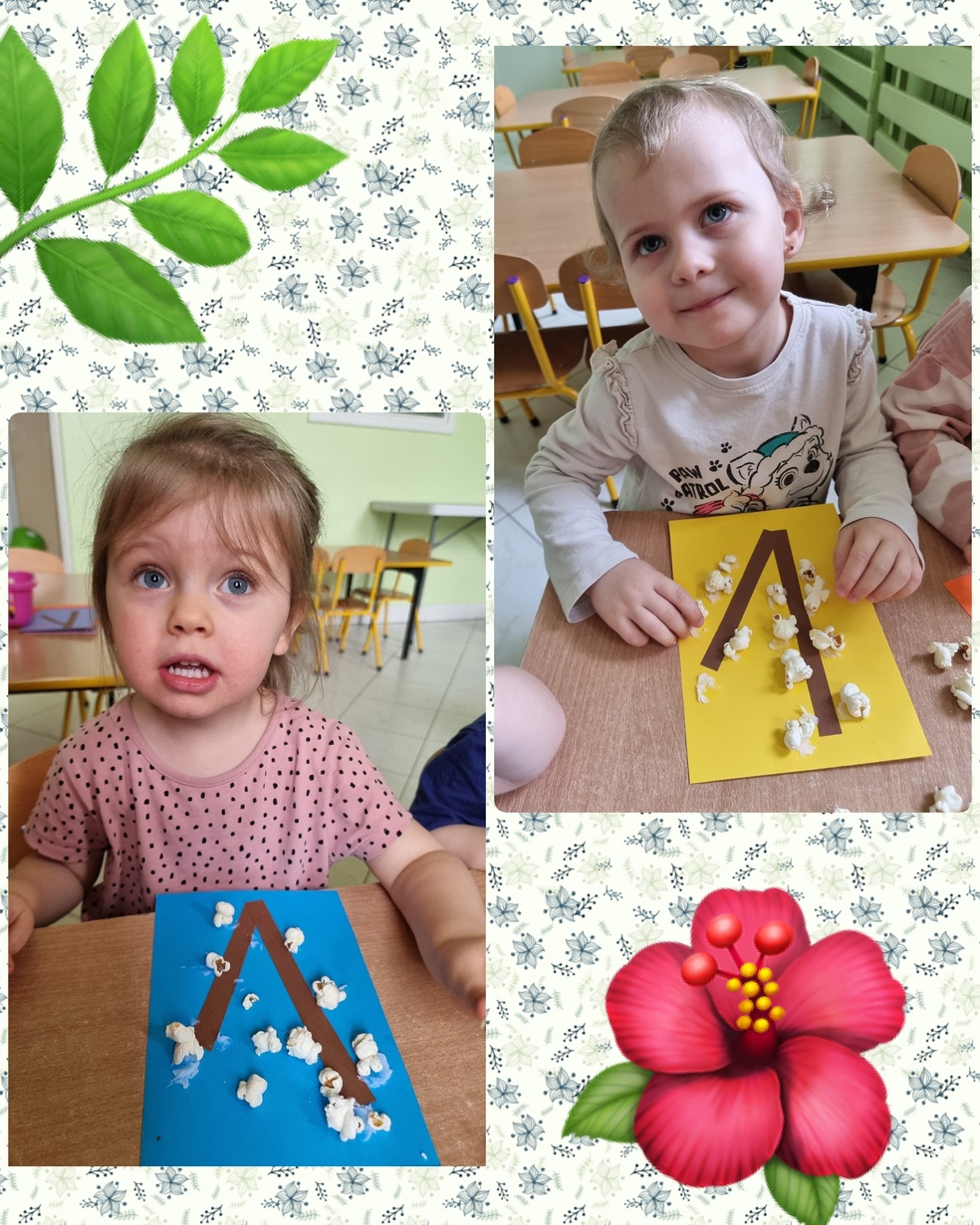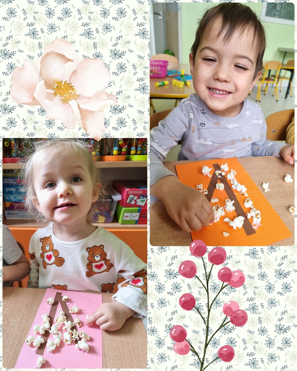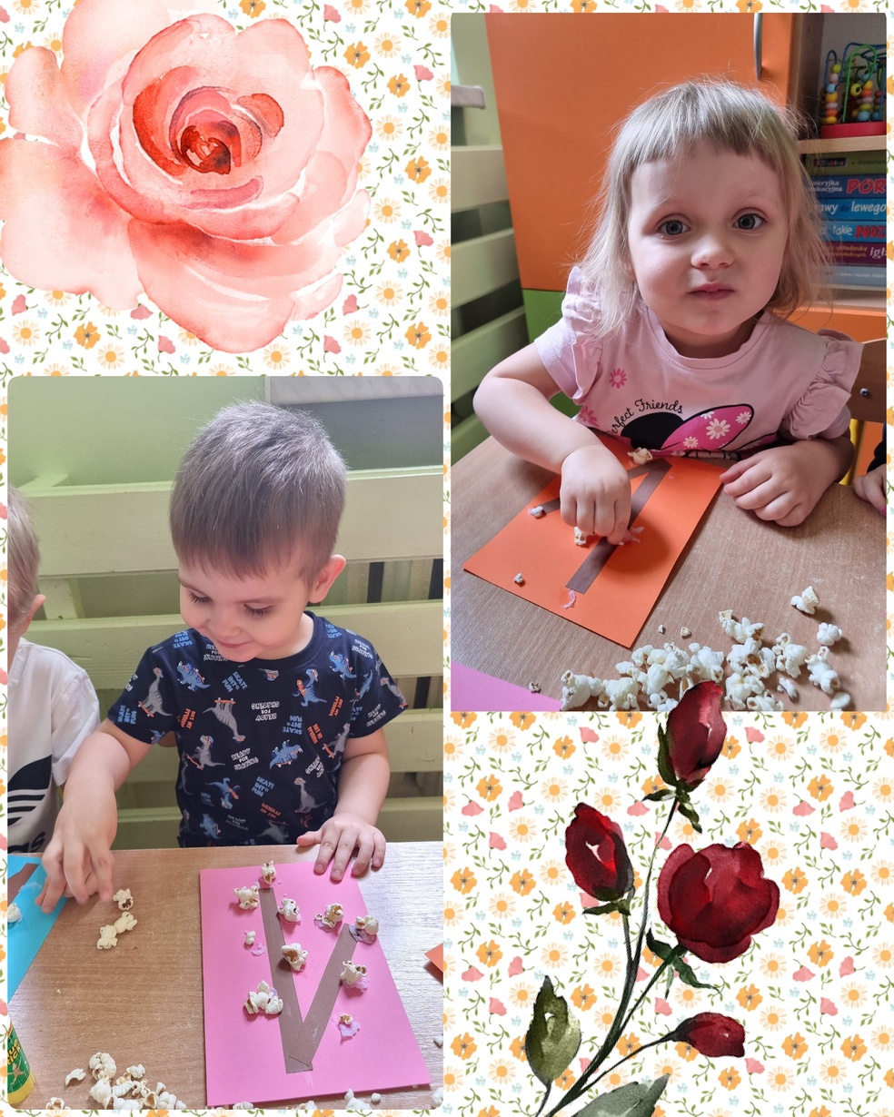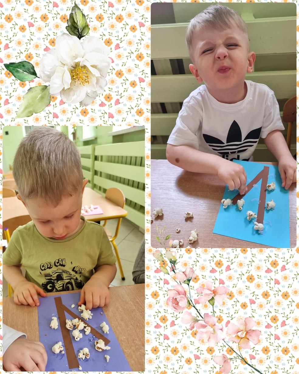 (Na kolorowej kartce papieru przyklejały klejem popcorn ).