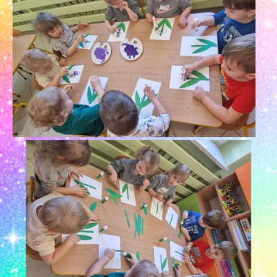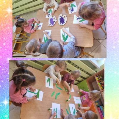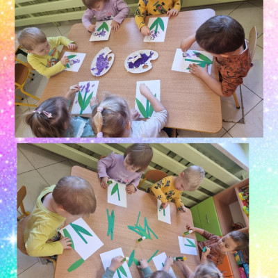 Najpierw dzieci przyklejały liście następnie patyczkami zamoczonymi w farbie odbijały kwiatki.