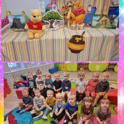 Zdjęcia przedstawiają dzieci świętujące Dzień Puchatka.