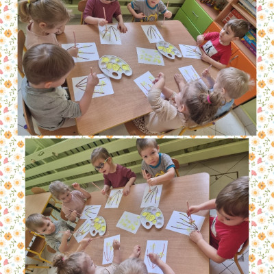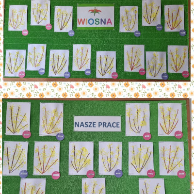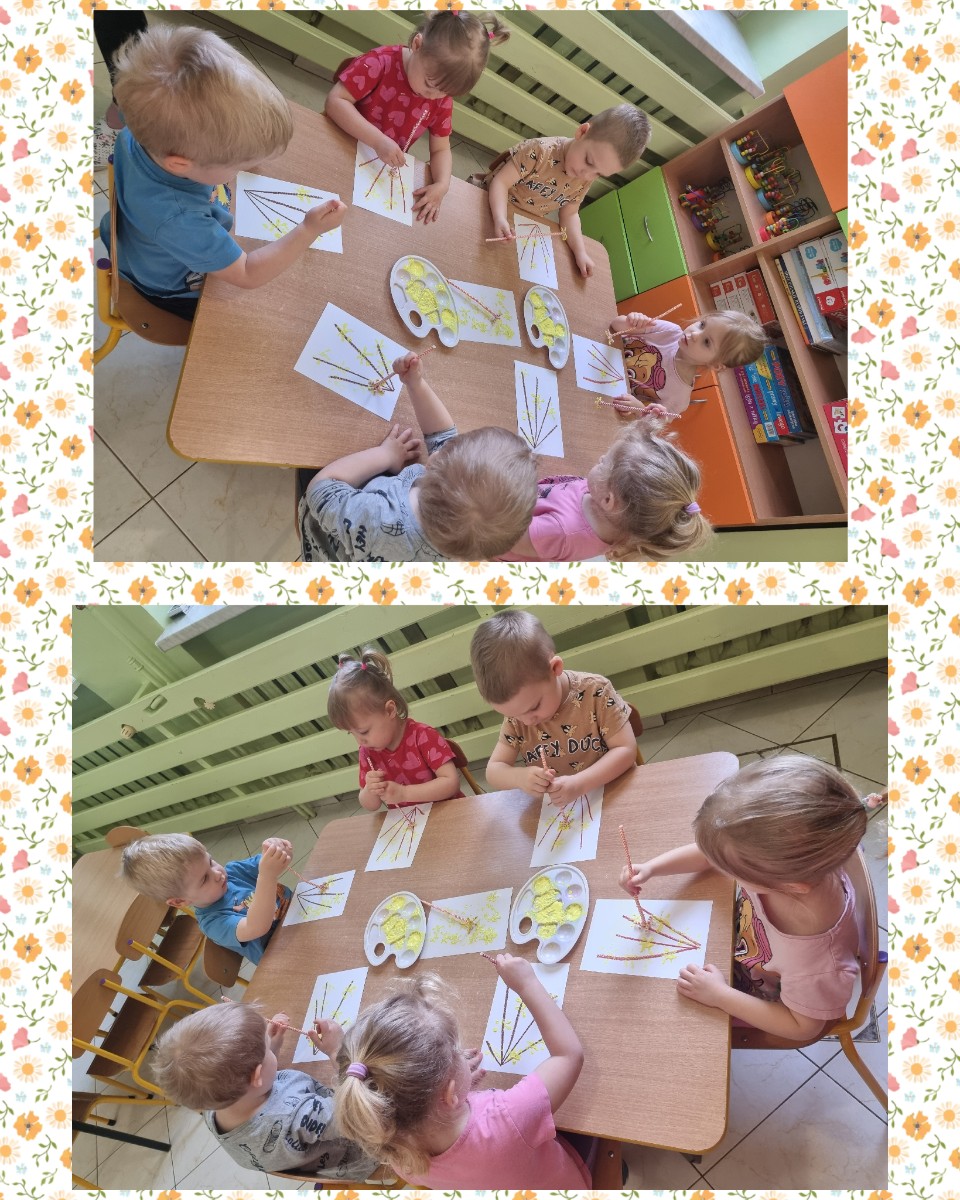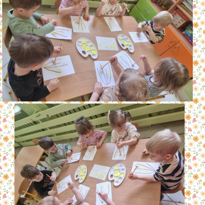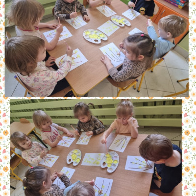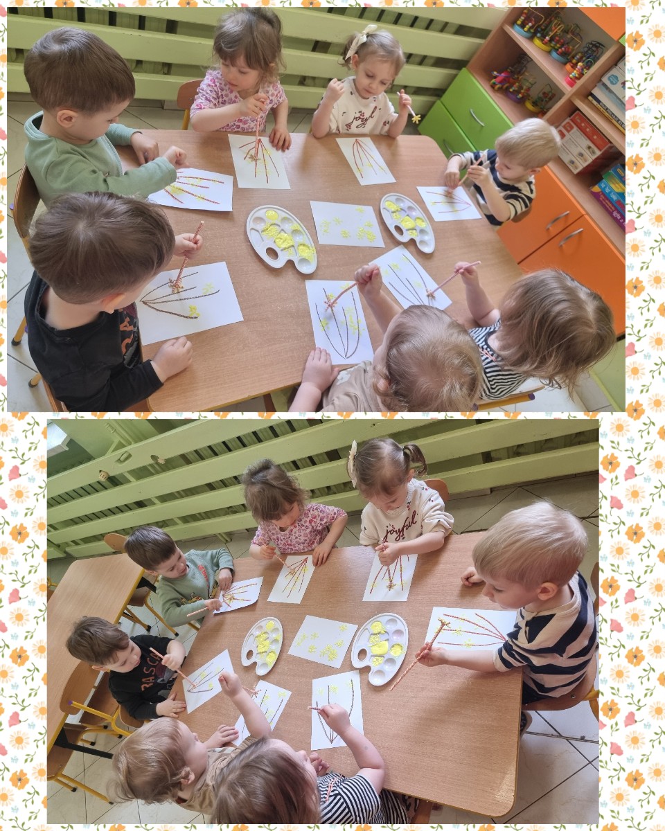 Nasze  Żabki ćwicząc motorykę małą i sprawność rączek, namalowały piękne forsycje używając słomek i farby.