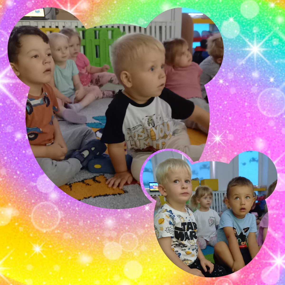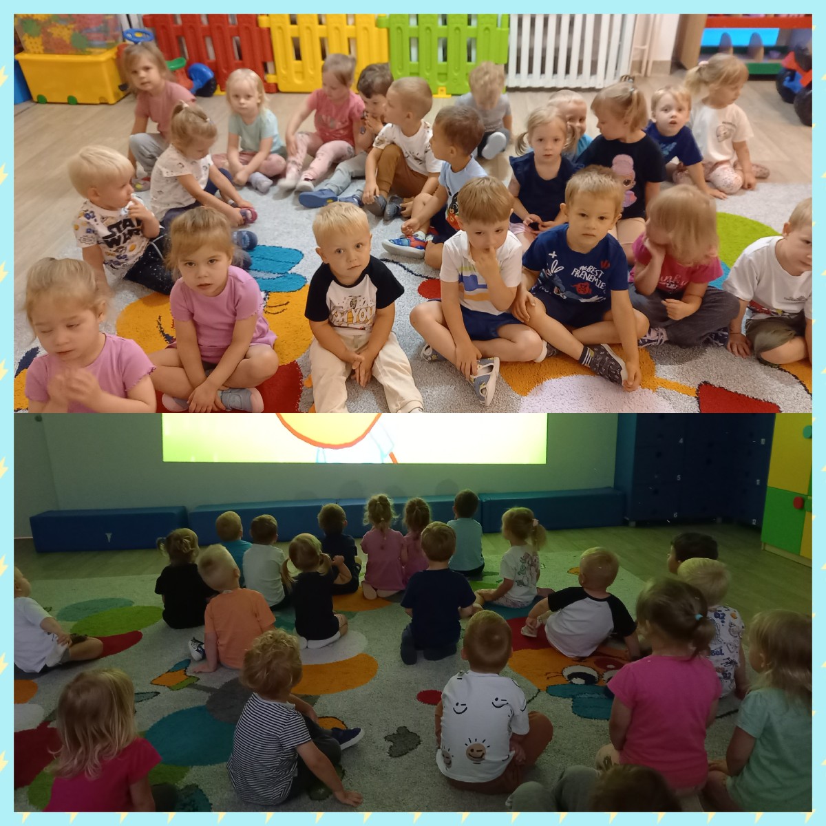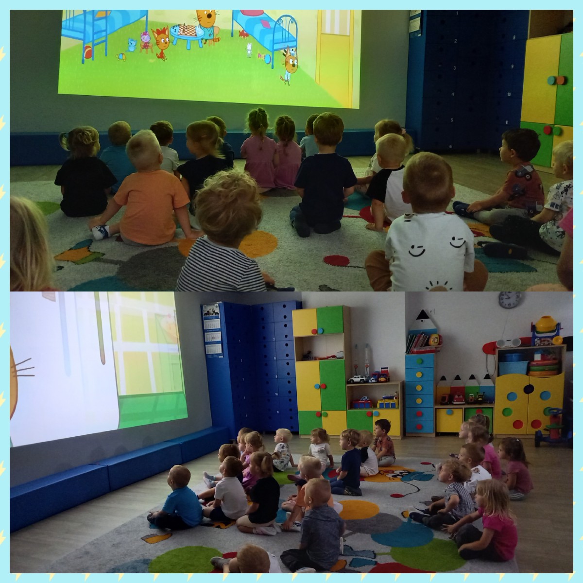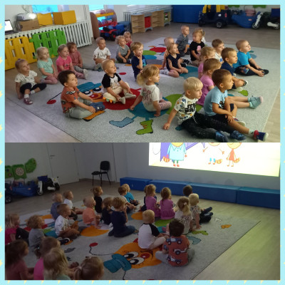 Zdjęcia przedstawiają dzieci podczas seansu bajkowego.