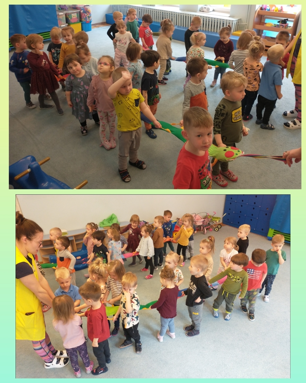 Dzieci ćwiczyły również swoją koordynacje ruchową gdy szły na spacer z materiałowym wężem.