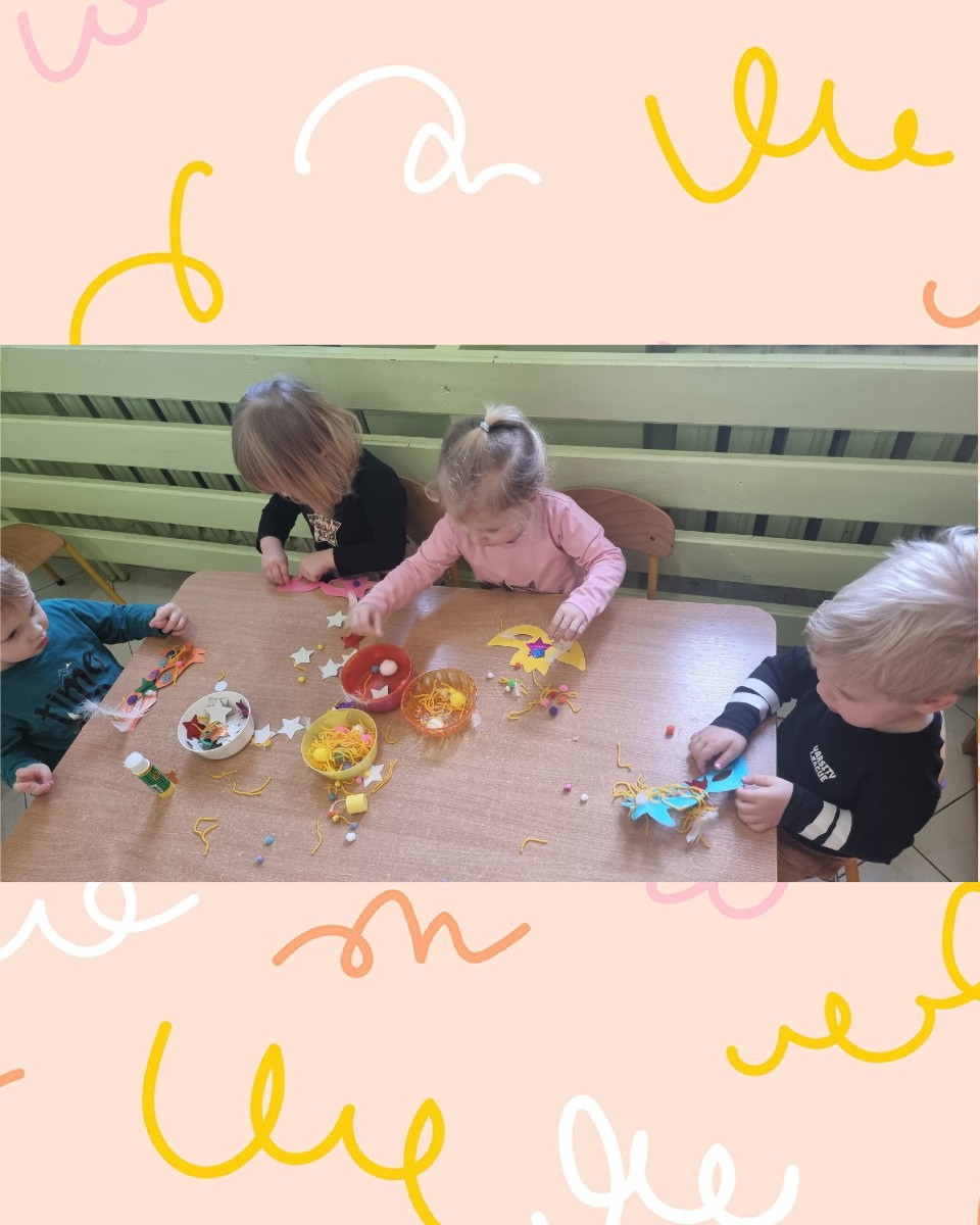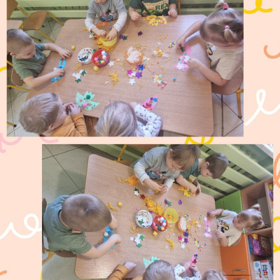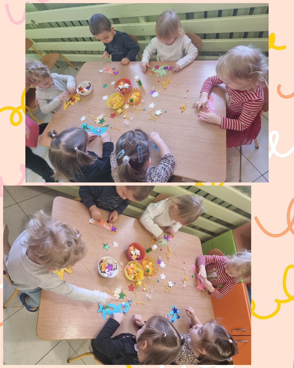 Zdjęcia przedstawiają dzieci wykonujące prace plastyczną.