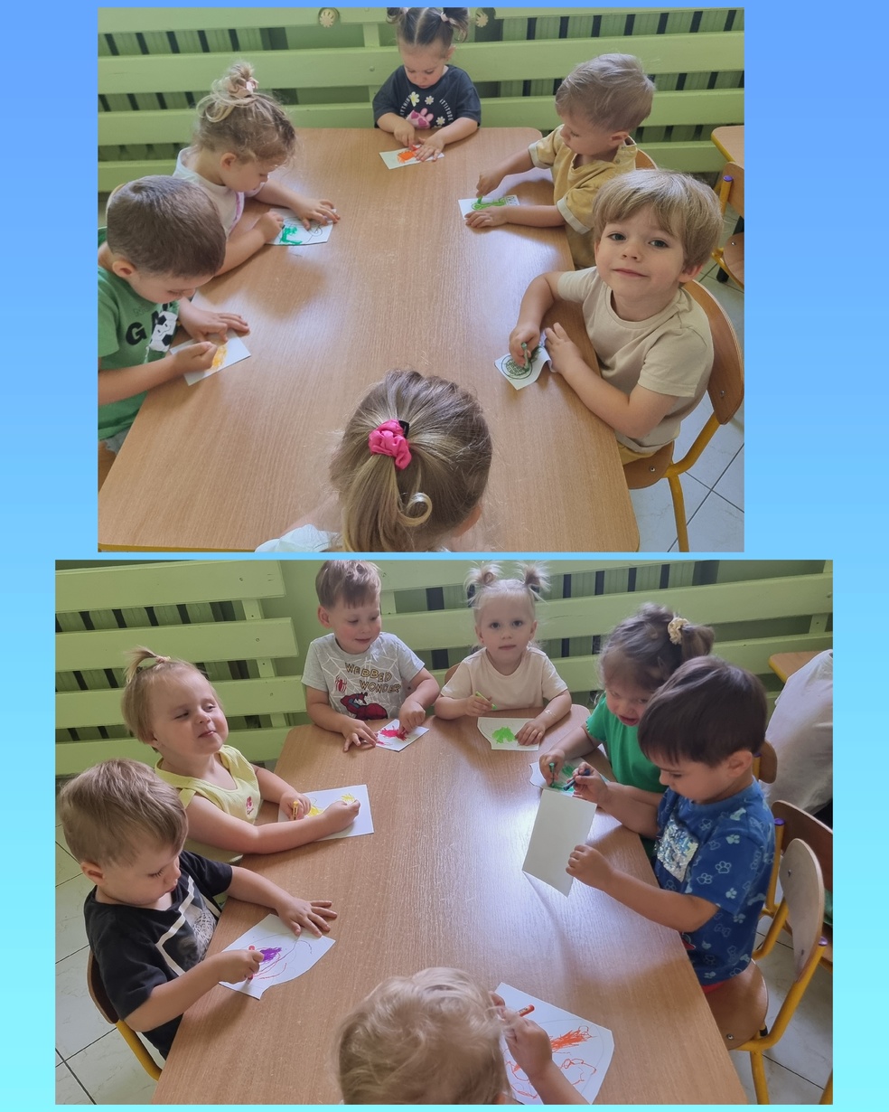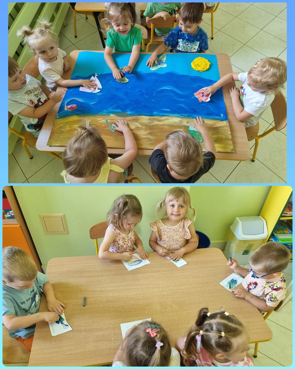 Dzieci z grupy żabek odśpiewały piosenkę " lato ,lato " a następnie wykolorowały obrazki o tematyce morza puźniej  przykleiły obrazki na namalowany obraz przez ciocie .