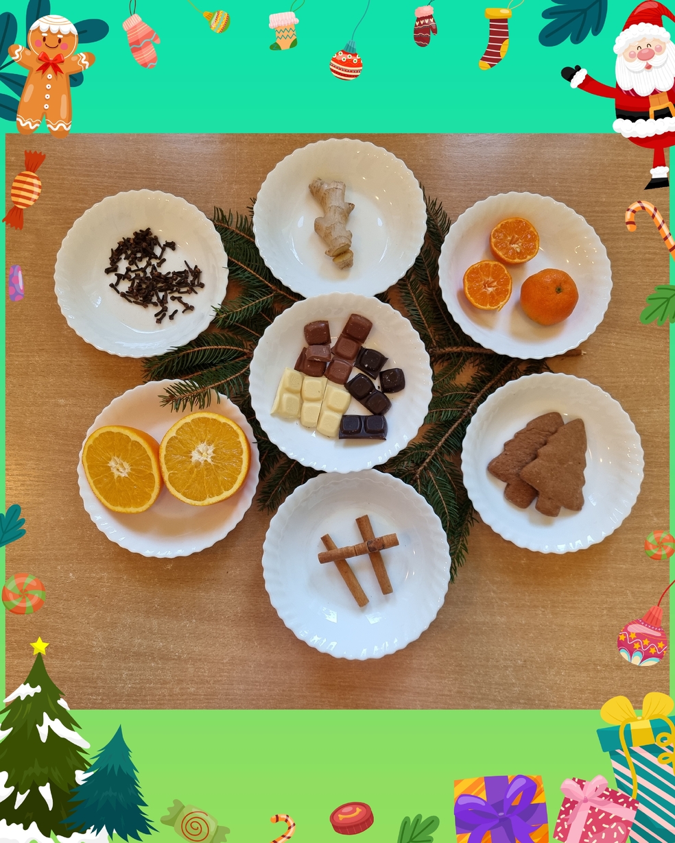 Na rozłożonych talerzykach znalazły się: pomarańcze, suszone przyprawy (cynamon, goździki), korzeń imbiru, czekolada, świerk, pierniczki.