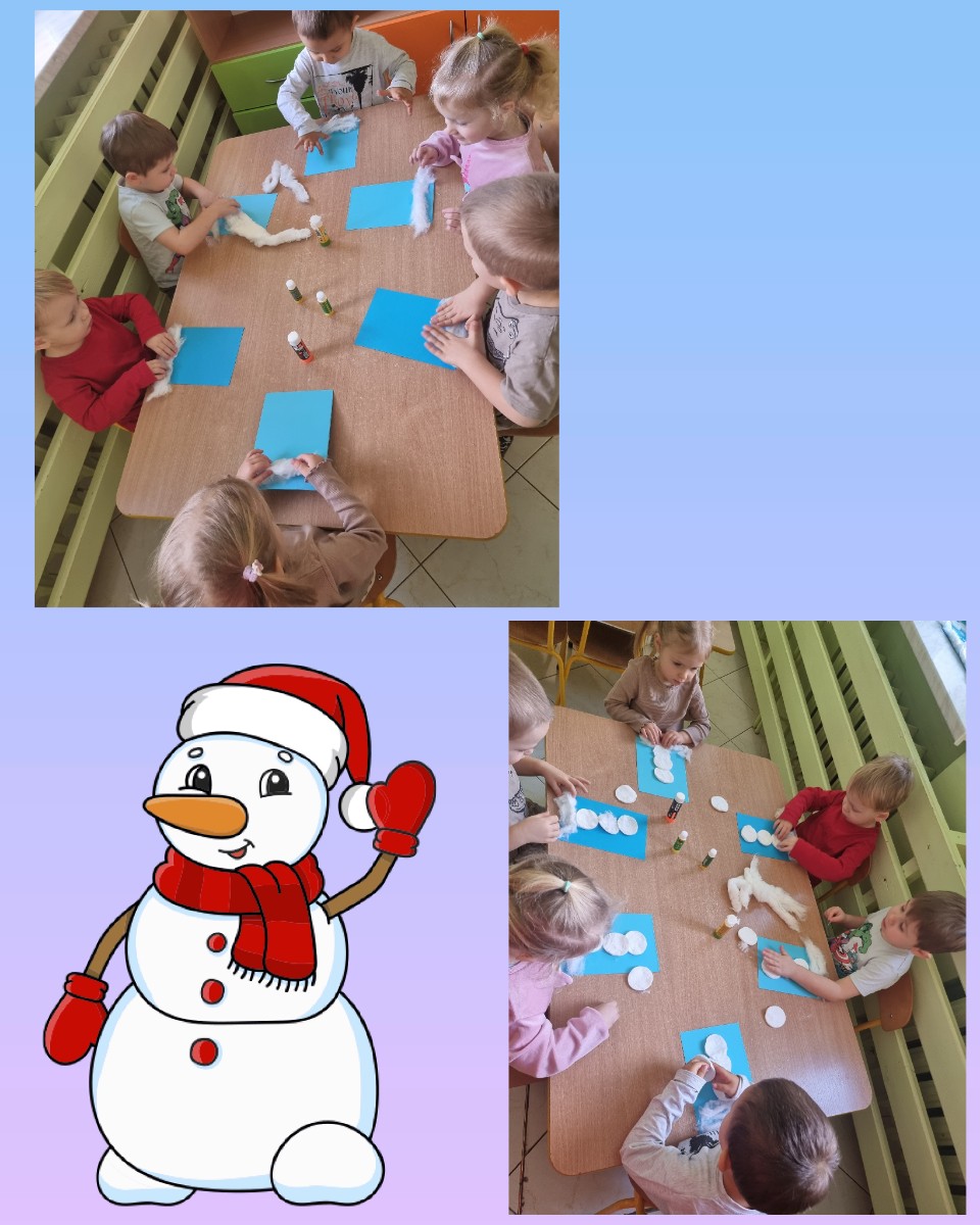Każde dziecko w wielkim skupieniu przyklejało waciki kosmetyczne ,czapeczki,watę tworząc zimowe bałwanki.