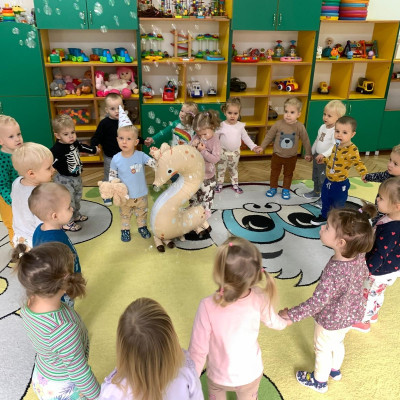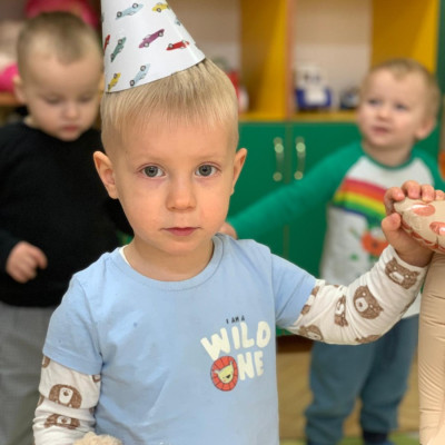 Zdjęcie przedstawia dzieci świętujące urodziny kolegi z grupy
