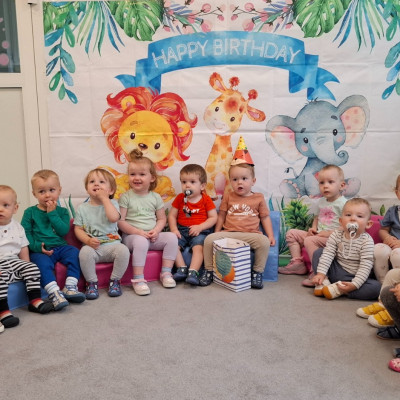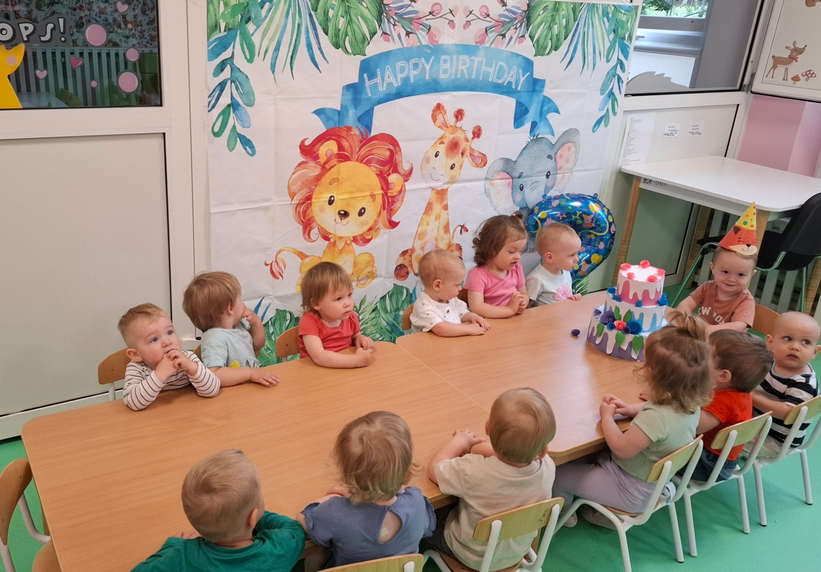 Zdjęcie przedstawia dzieci świętujące urodziny kolegi