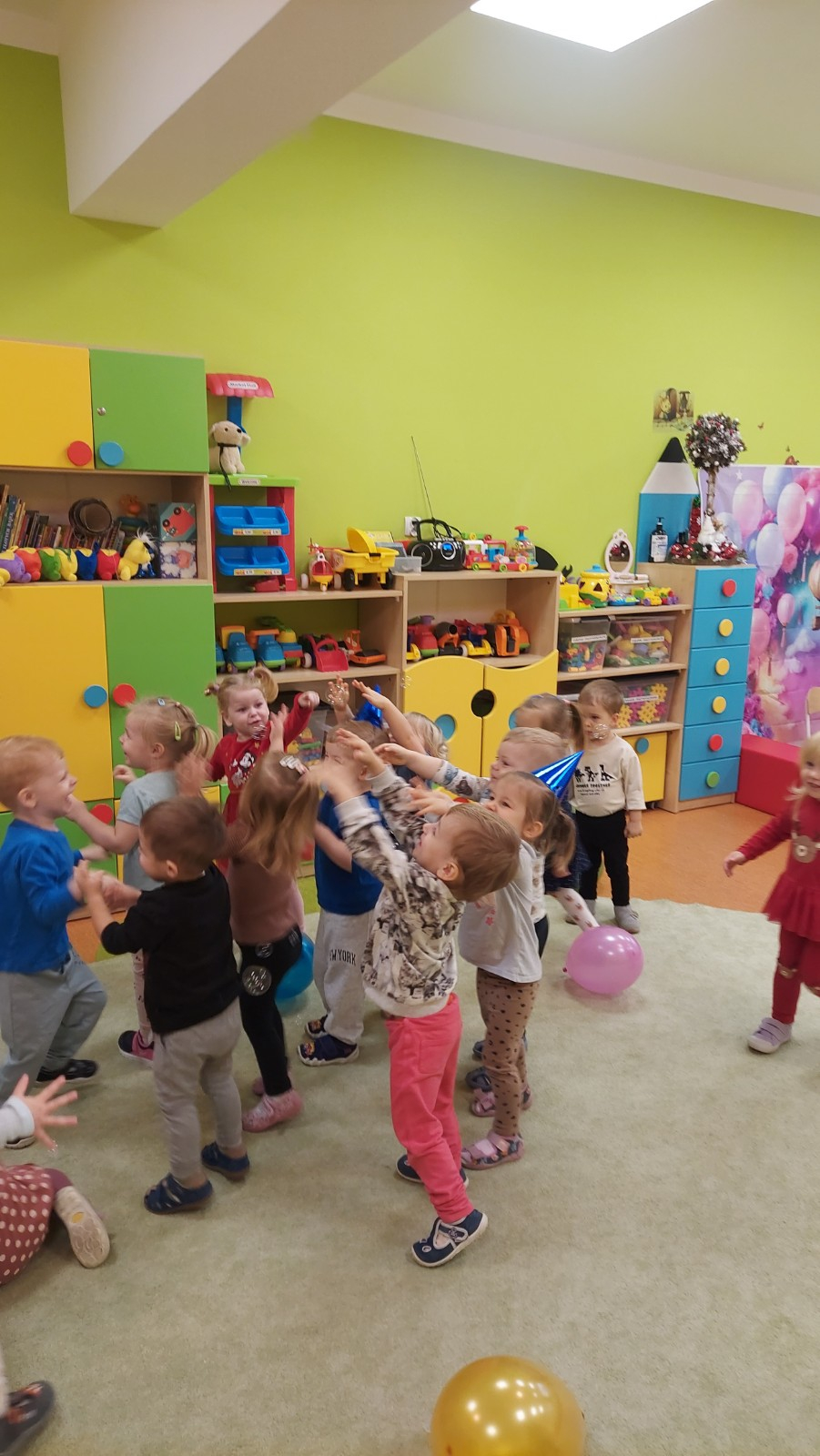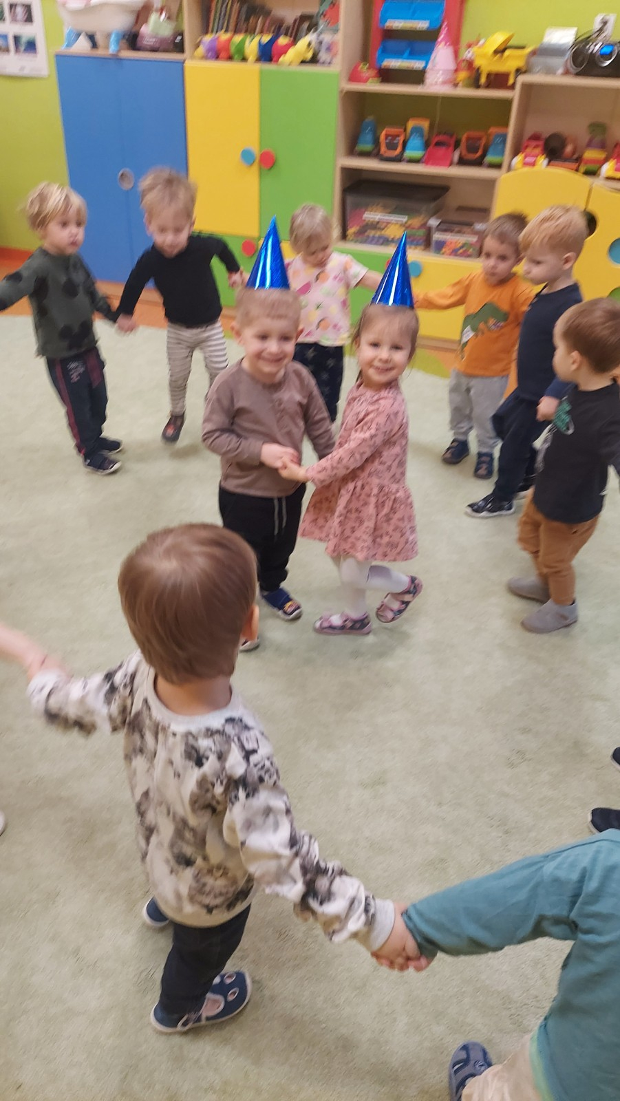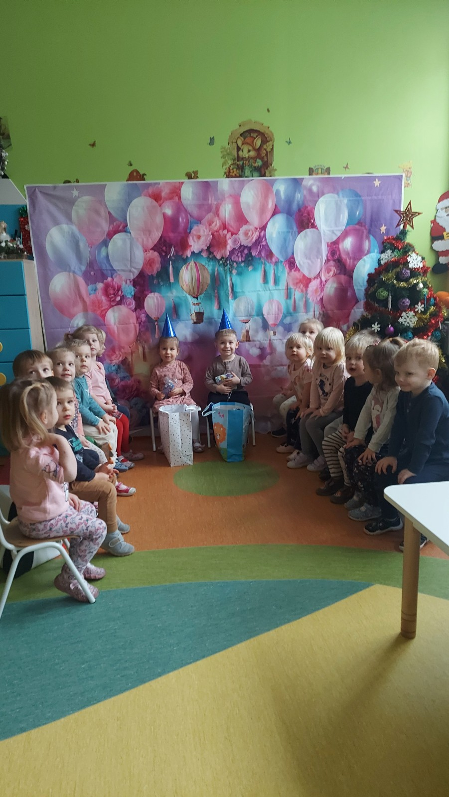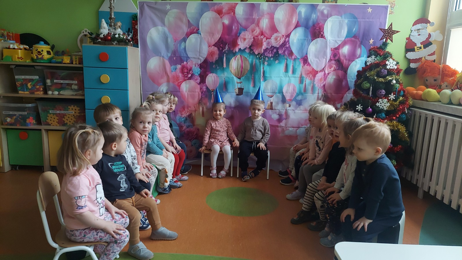 W tym miejscu na grupie Rybki swoje trzecie urodziny obchodzili Ola, Małgosia i Aleksander. Tradycyjnie wszystkie dzieci wraz z paniami odśpiewały solenizantom sto lat , i złożyły życzenia :
