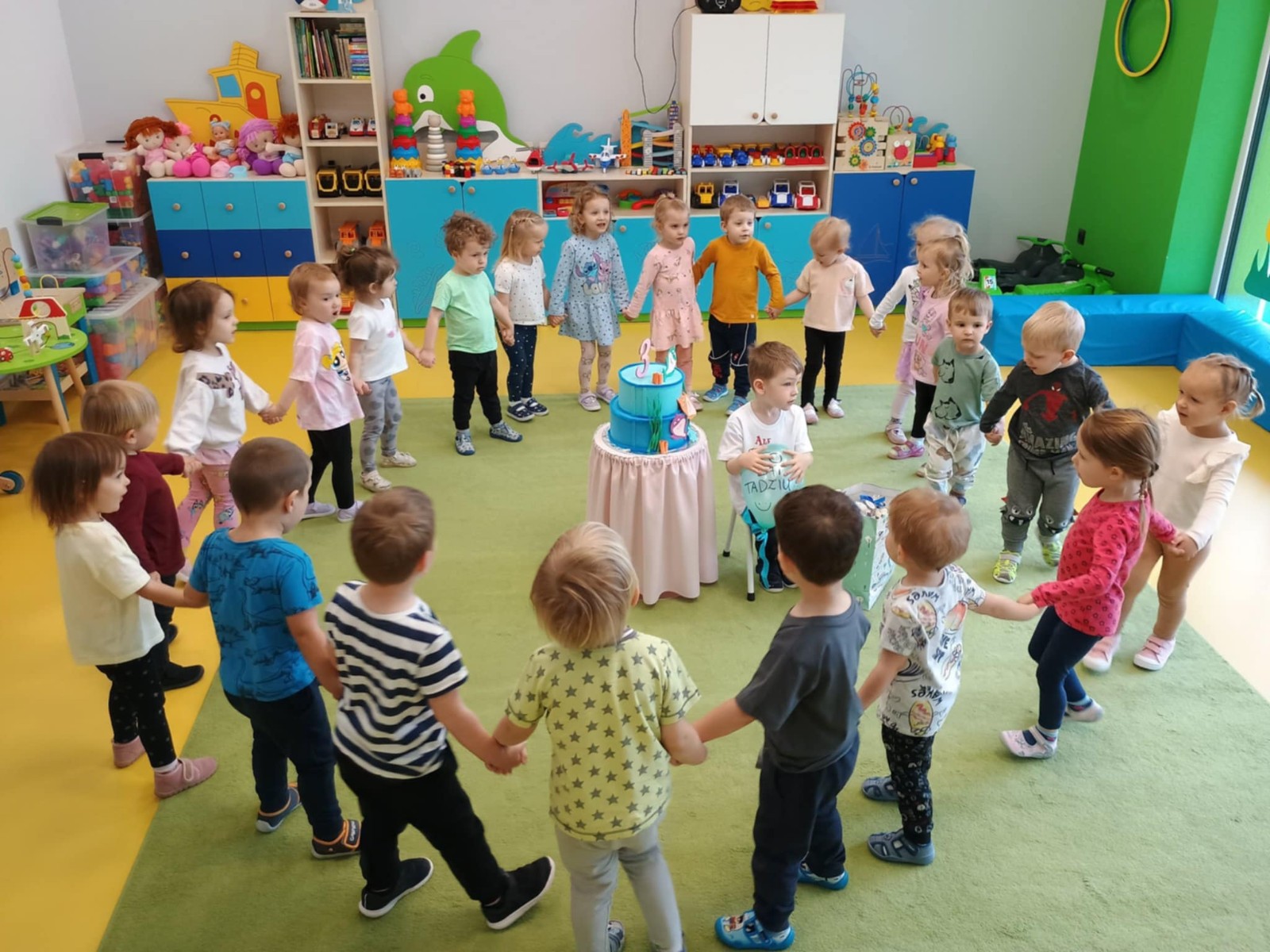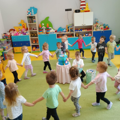 Zdjęcie przedstawia dzieci podczas zabawy urodzinowej kolegi