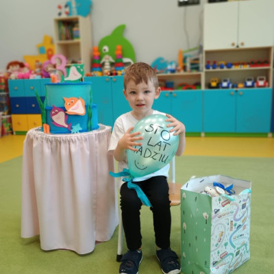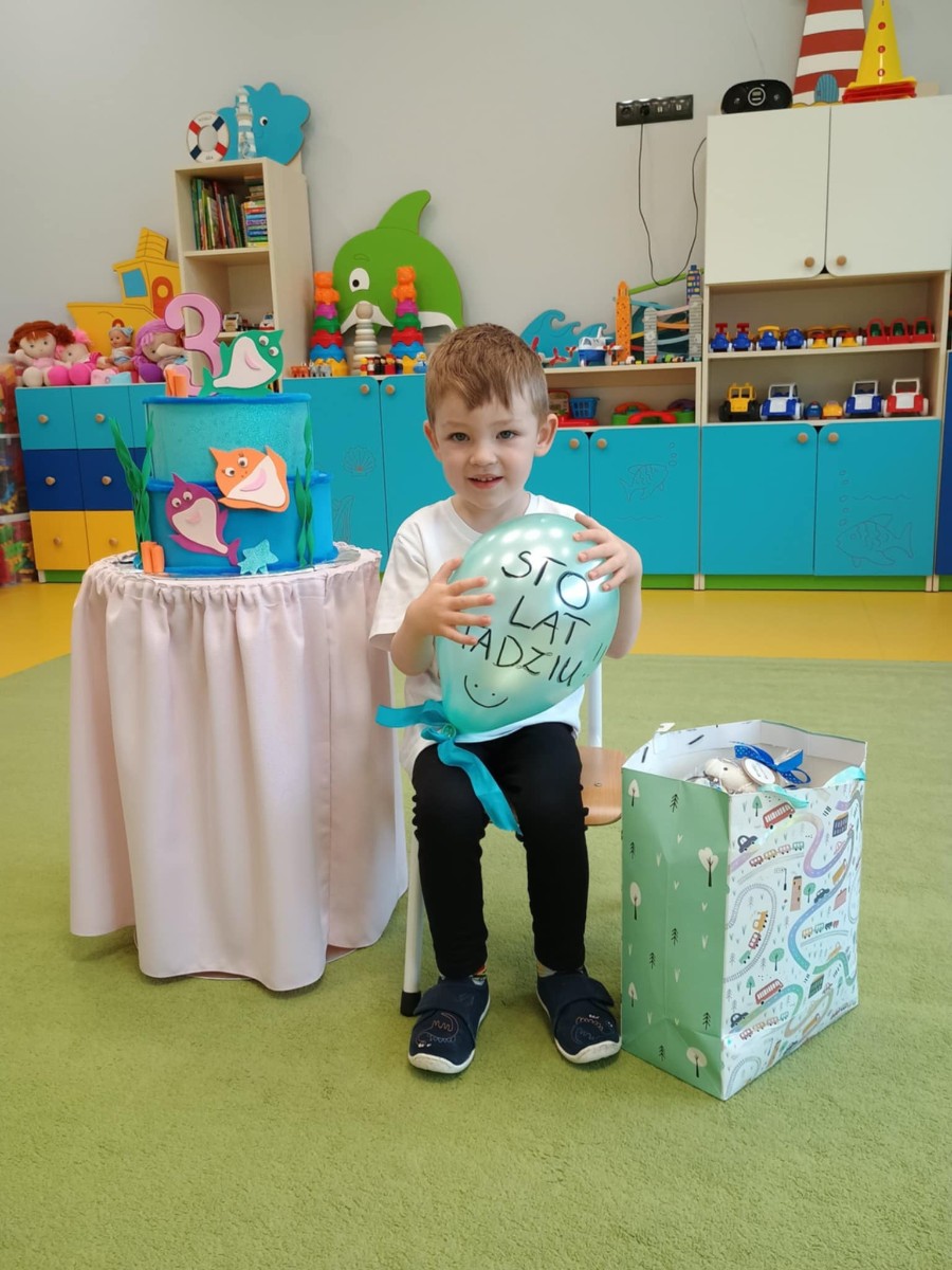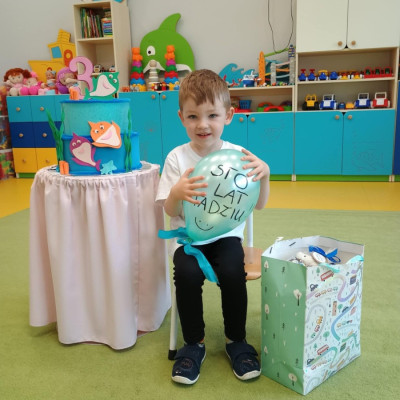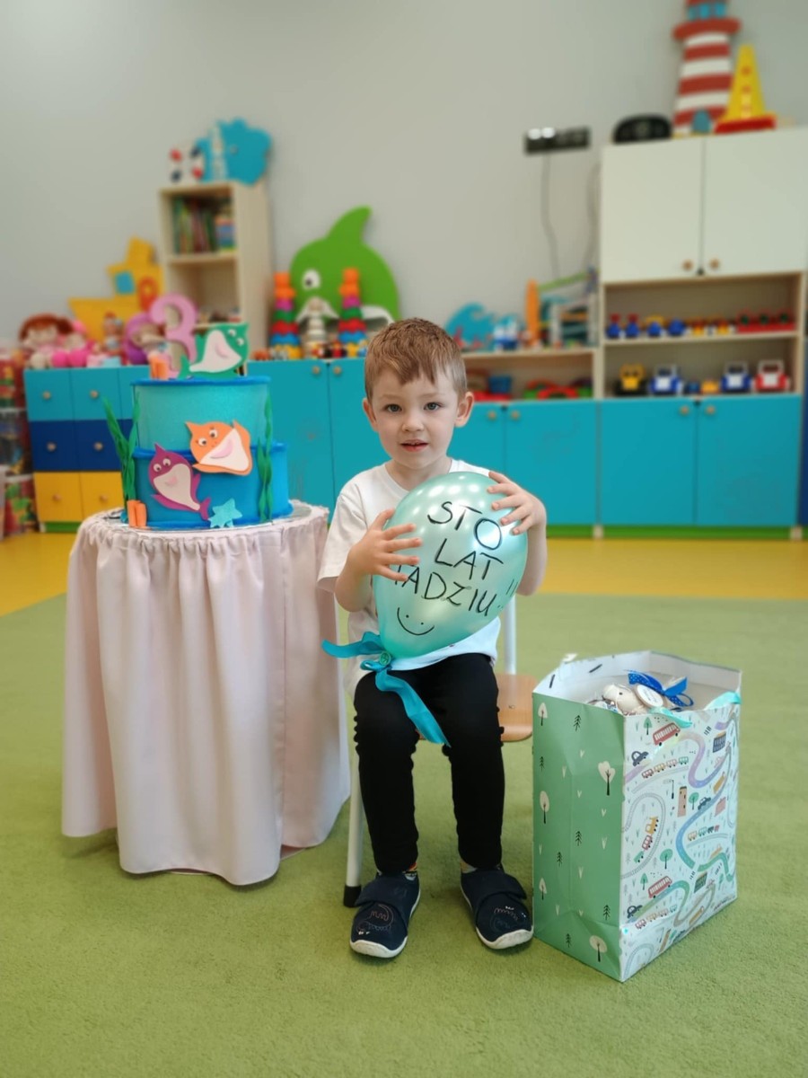 Zdjęcie przedstawia chłopca z balonem i tortem