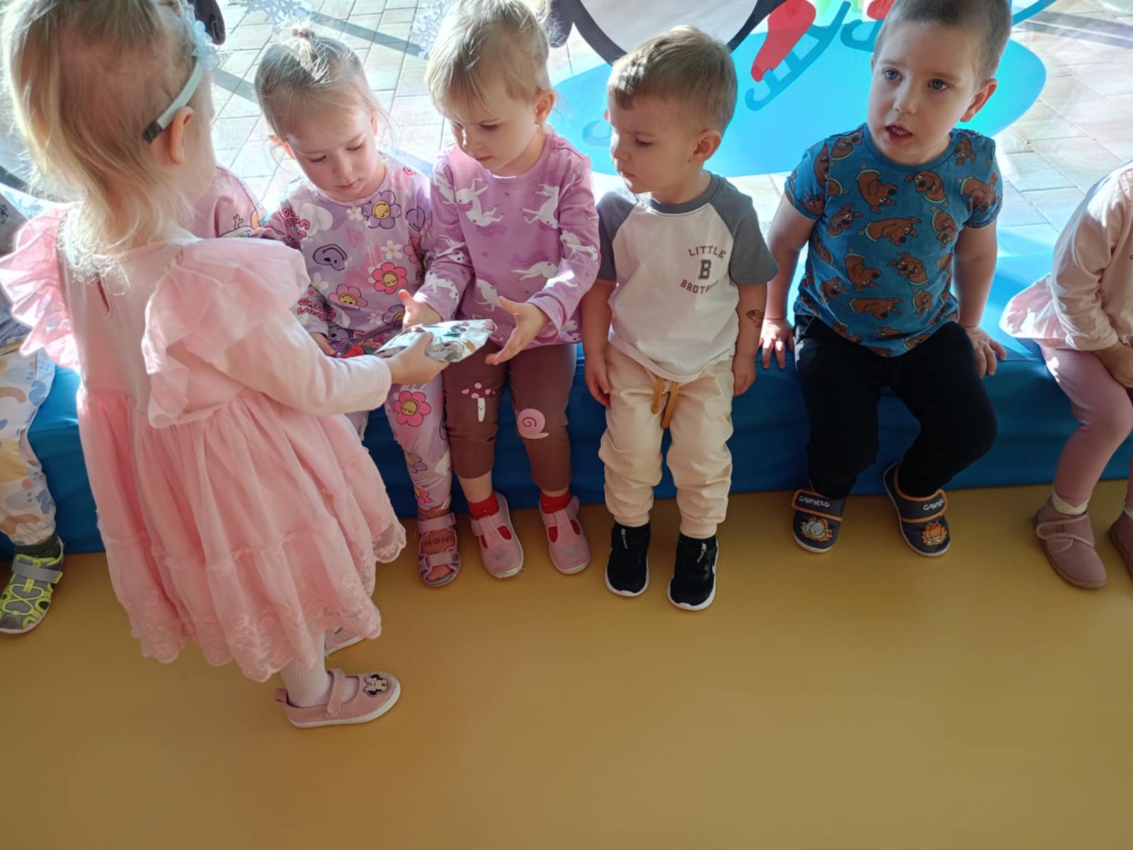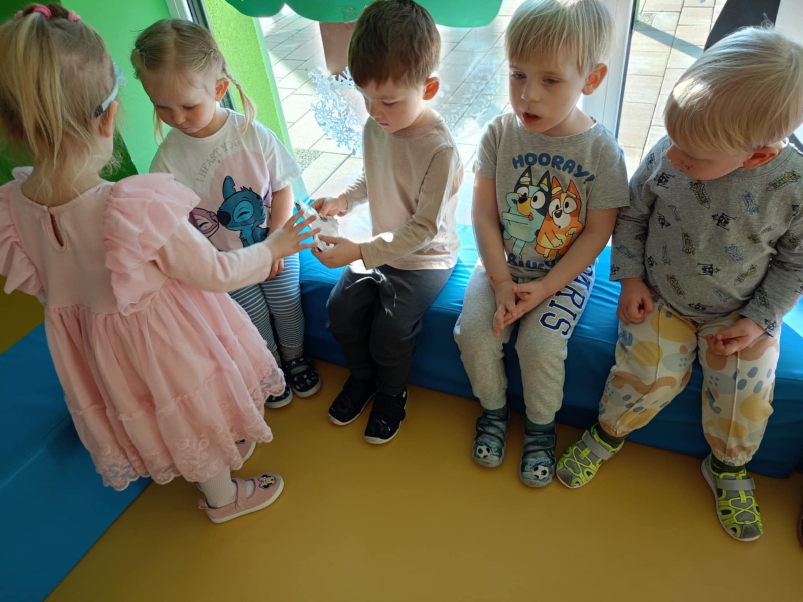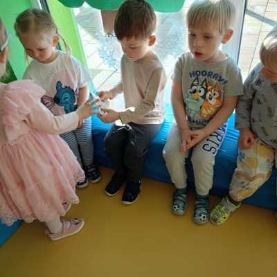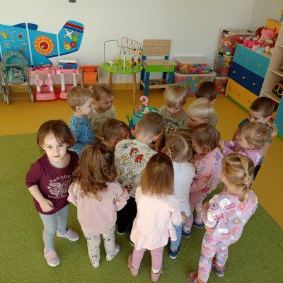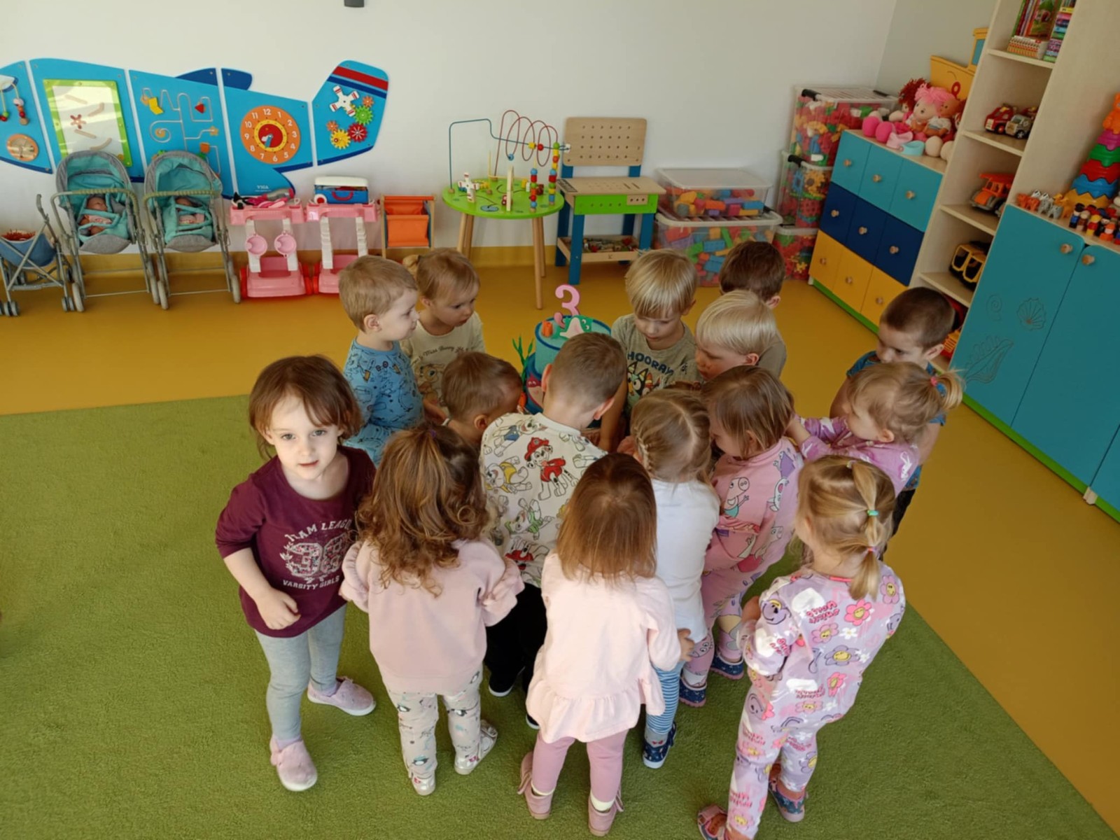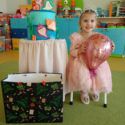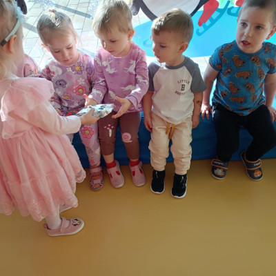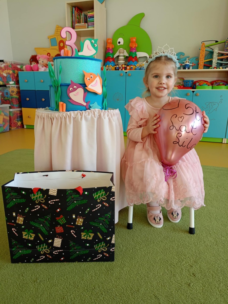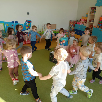 Zdjęcie przedstawia dzieci świętujące urodziny koleżanki z grupy