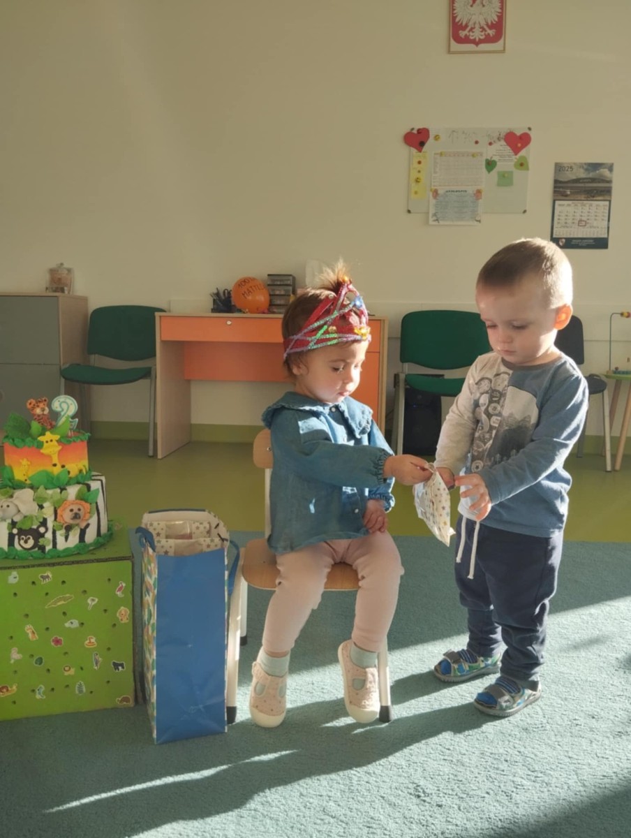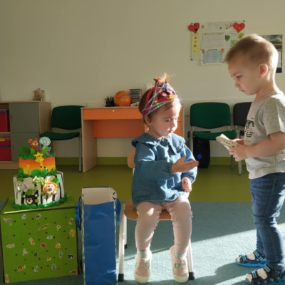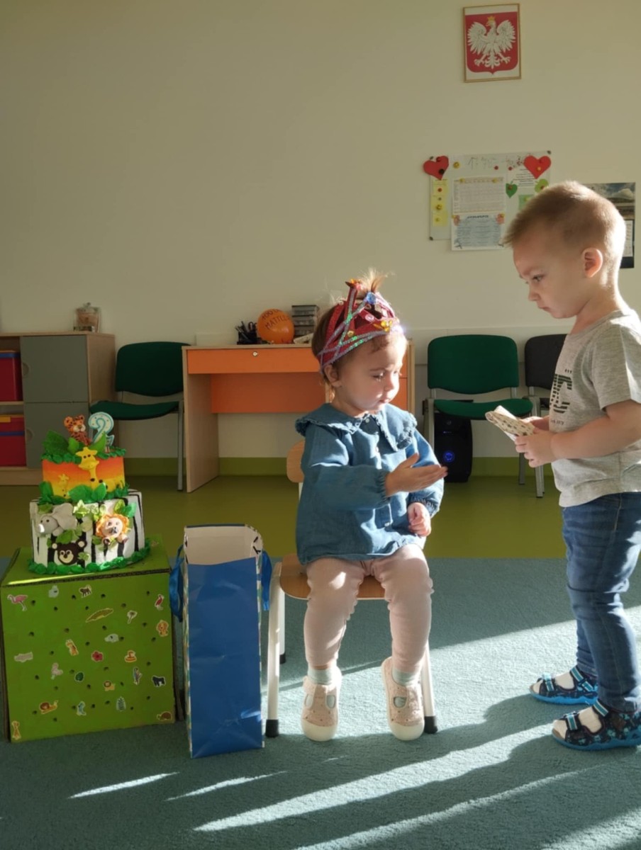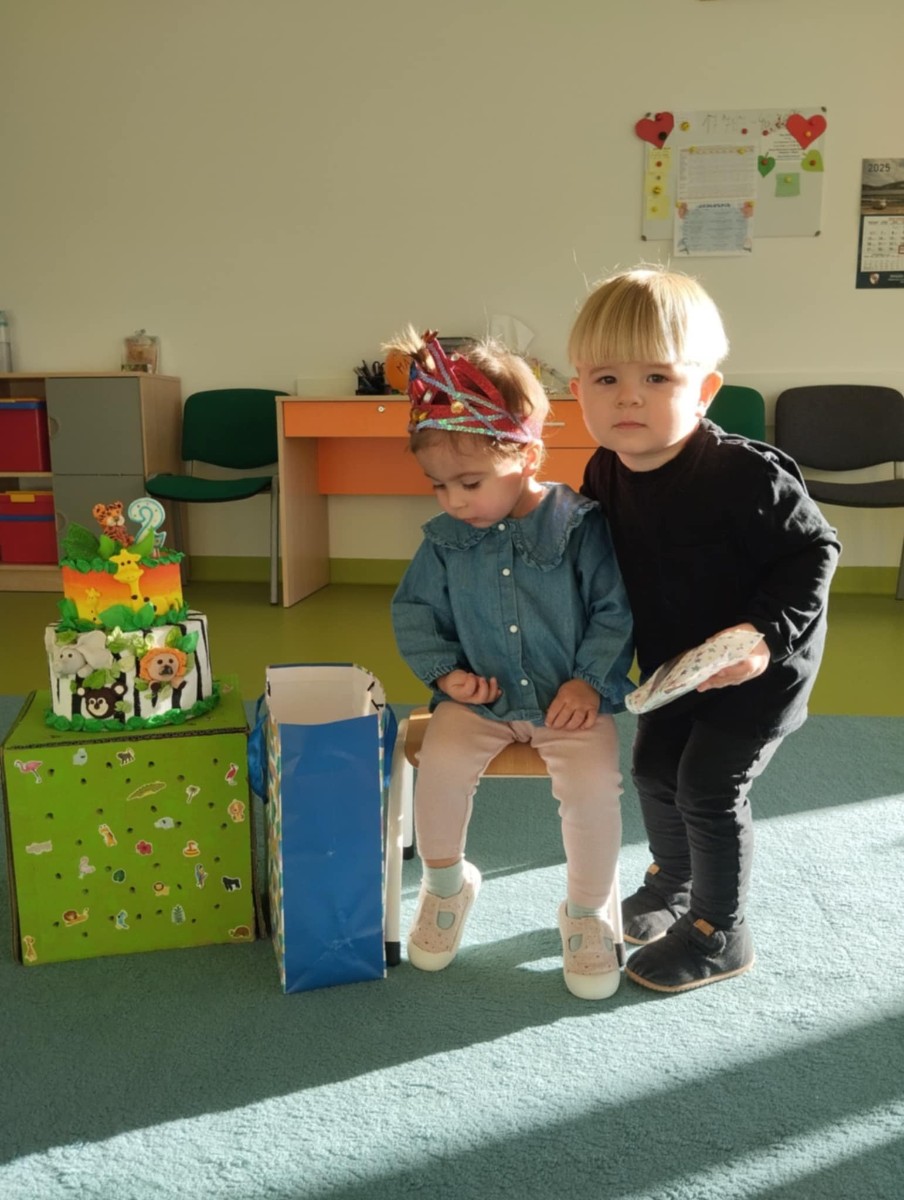 Zdjęcie przedstawia dzieci świętujące urodziny koleżanki z grupy