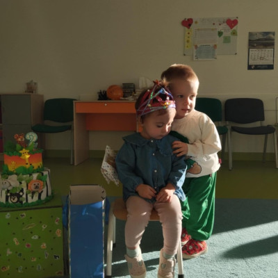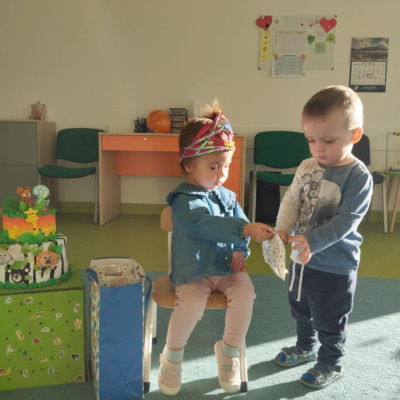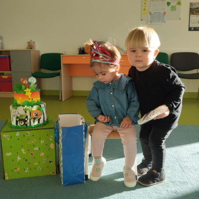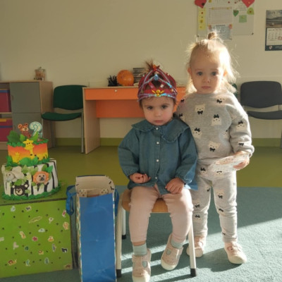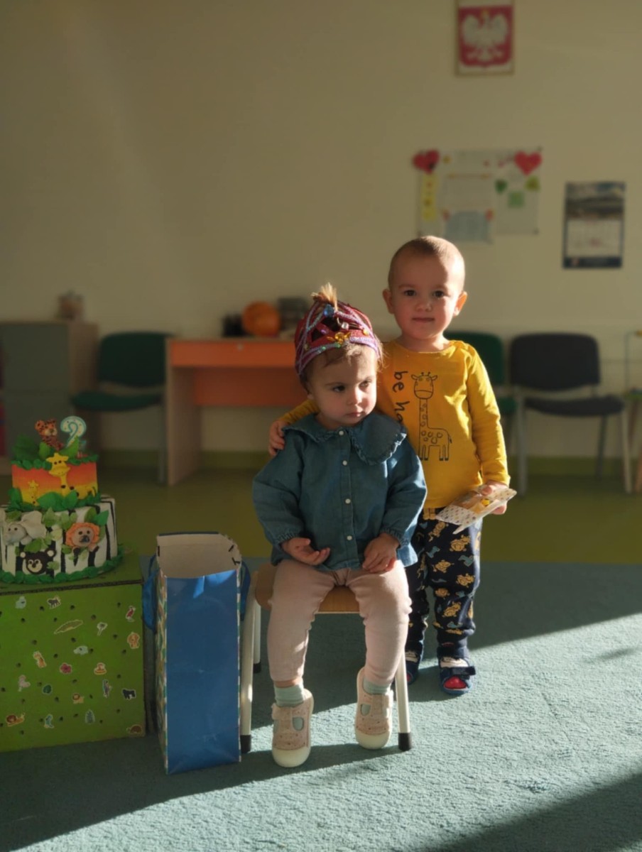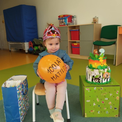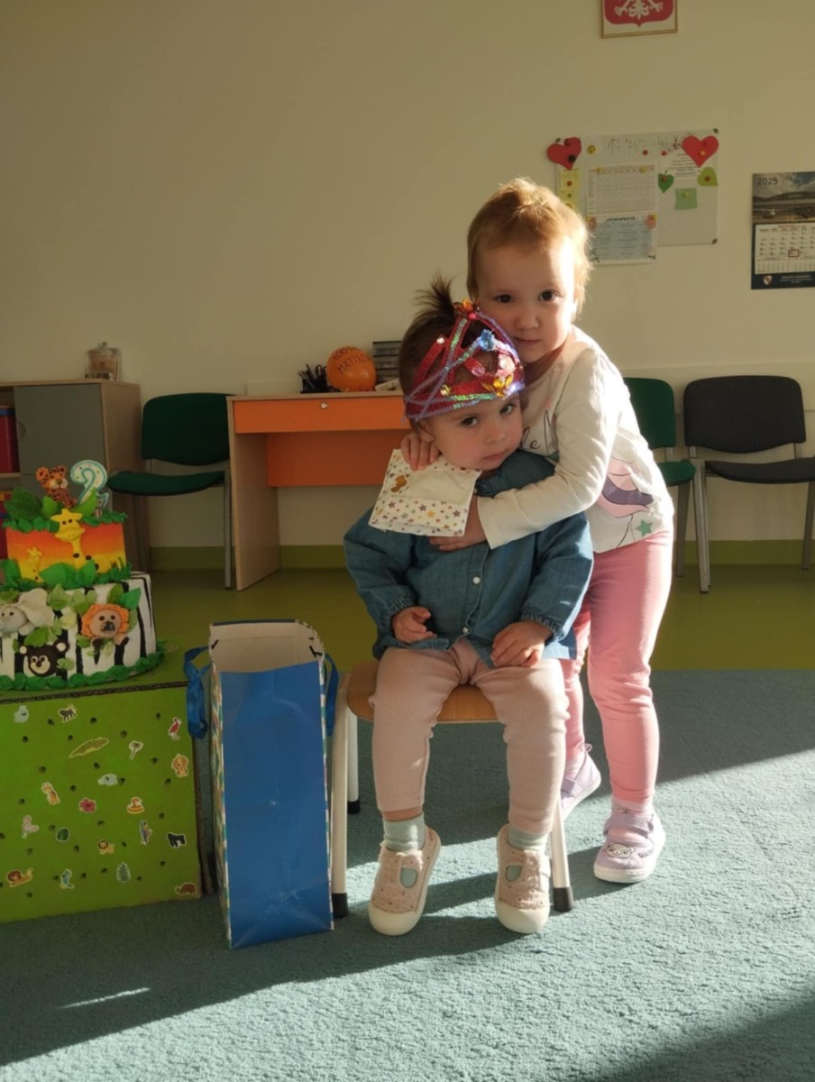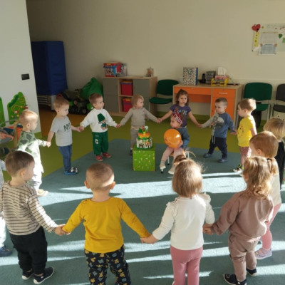 Zdjęcie przedstawia dzieci świętujące urodziny koleżanki z grupy