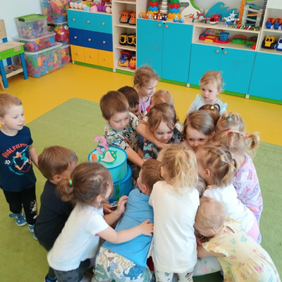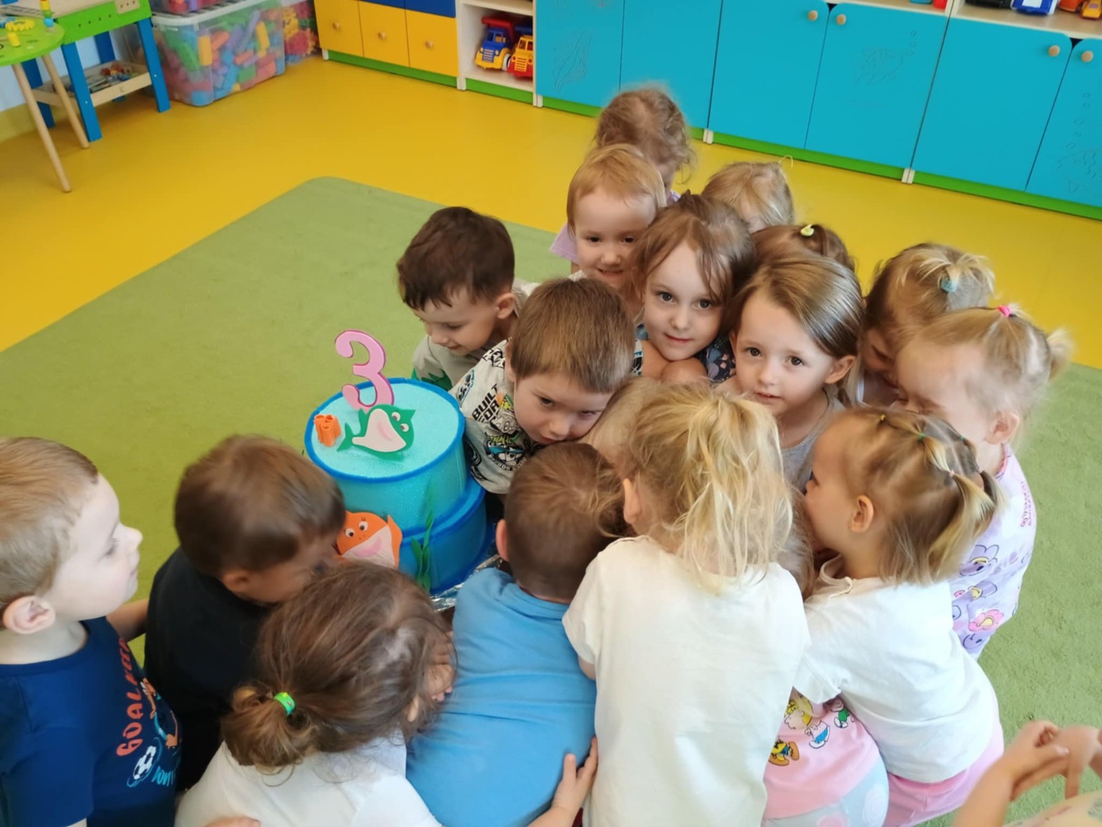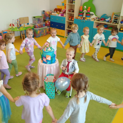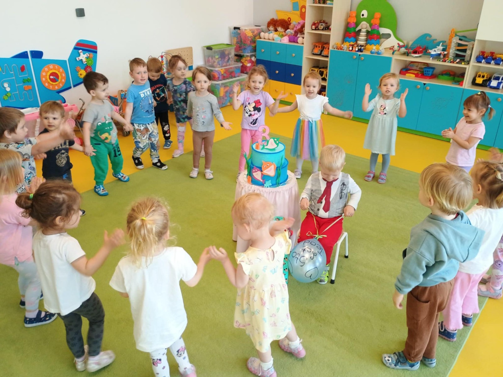 Zdjęcie przedstawia dzieci świętujące urodziny kolegi