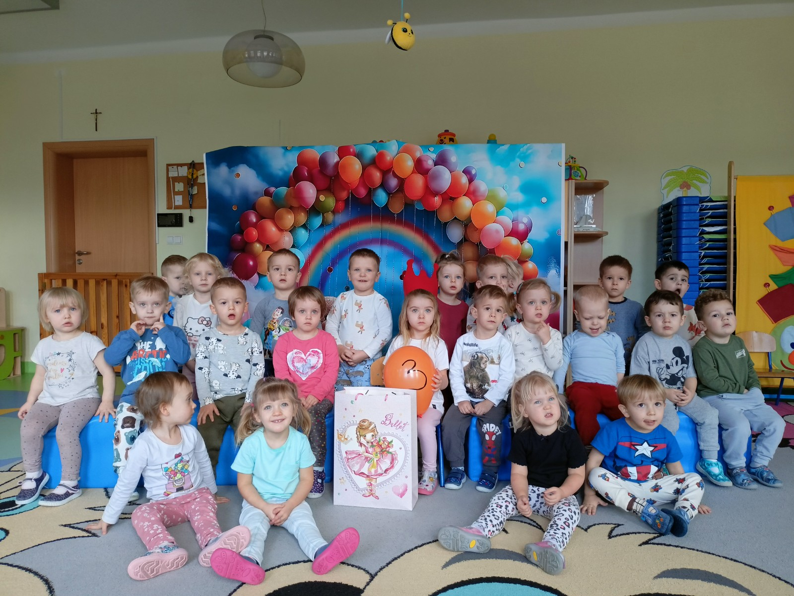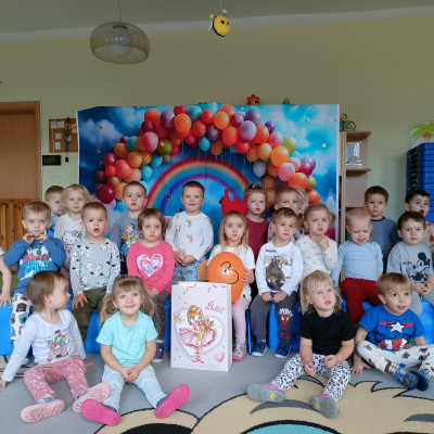 Zdjęcie przedstawia grupę dzieci świętująca urodziny koleżanki