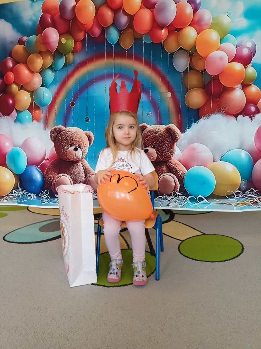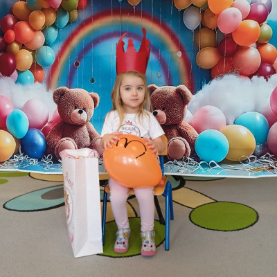 Zdjęcie przedstawia dziewczynkę w koronie na tle balonów