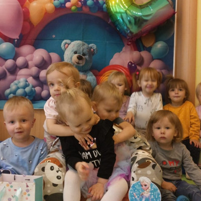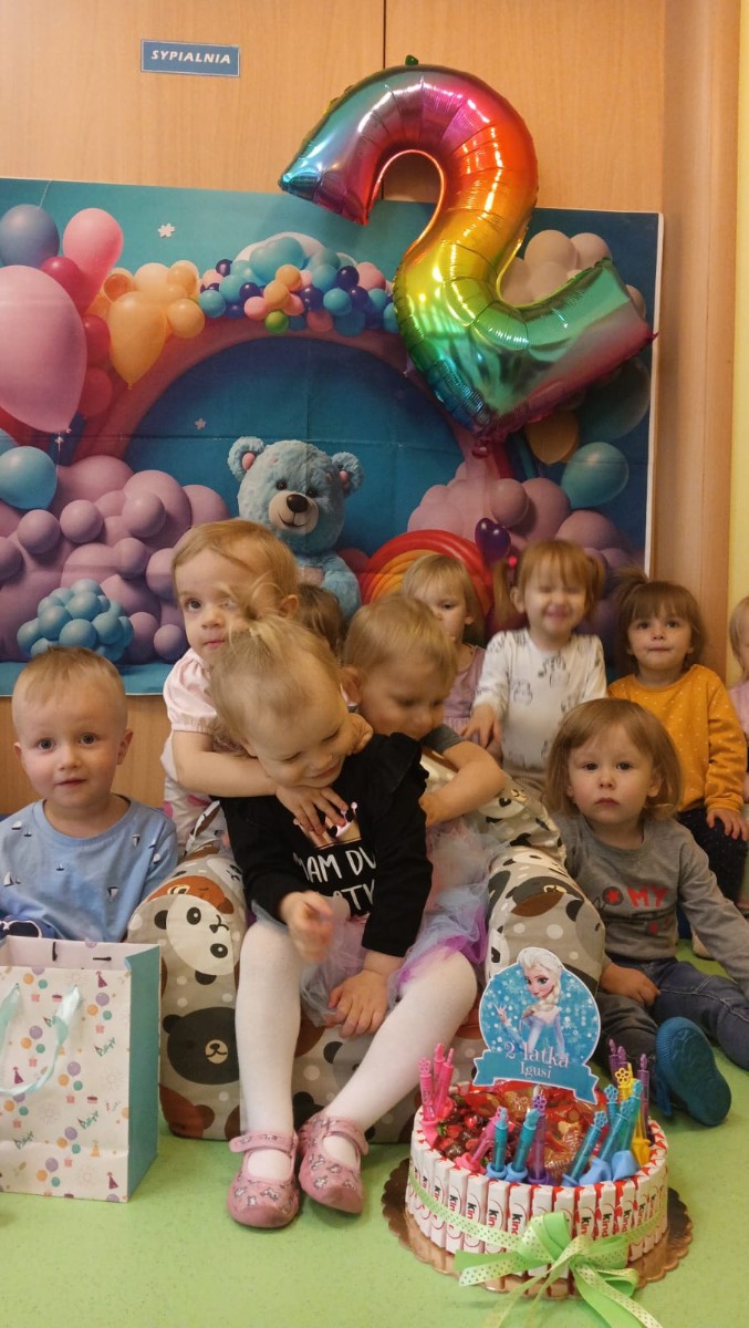 Zdjęcie przedstawia dzieci świętujące urodziny koleżanki z grupy Biedronki