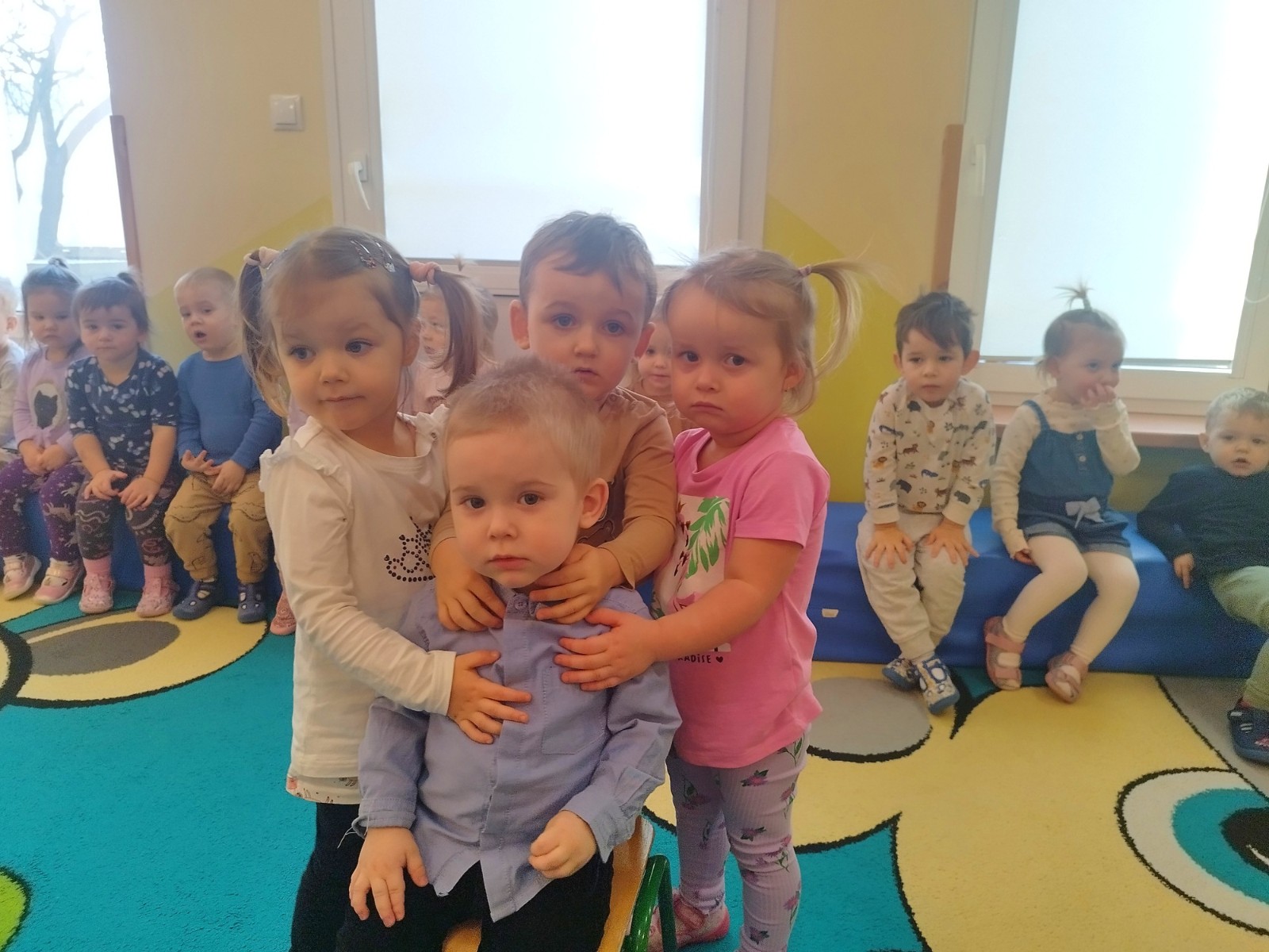 Zdjęcie przedstawia dzieci świętujące urodziny kolegi z grupy Muchomorki