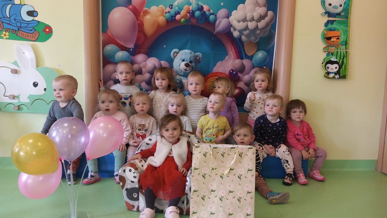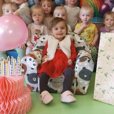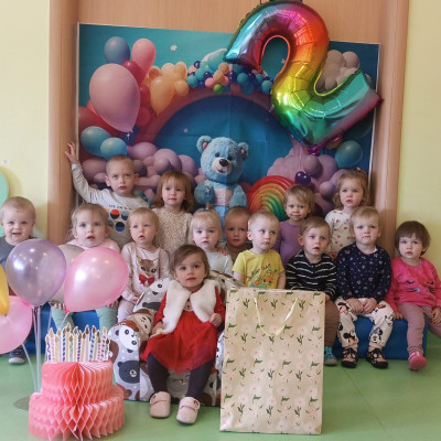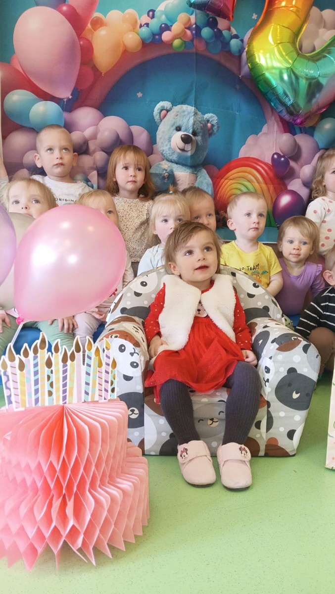 Zdjęcie przedstawia dzieci świętujące urodziny koleżanki z grupy Biedronki