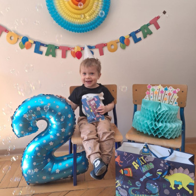 Zdjęcie przedstawia dziecko z balonem i tortem