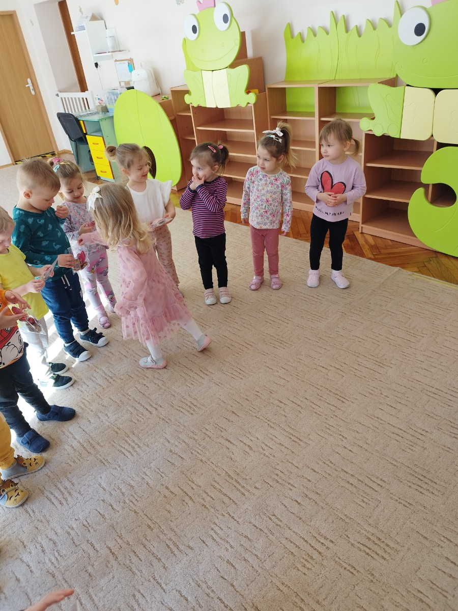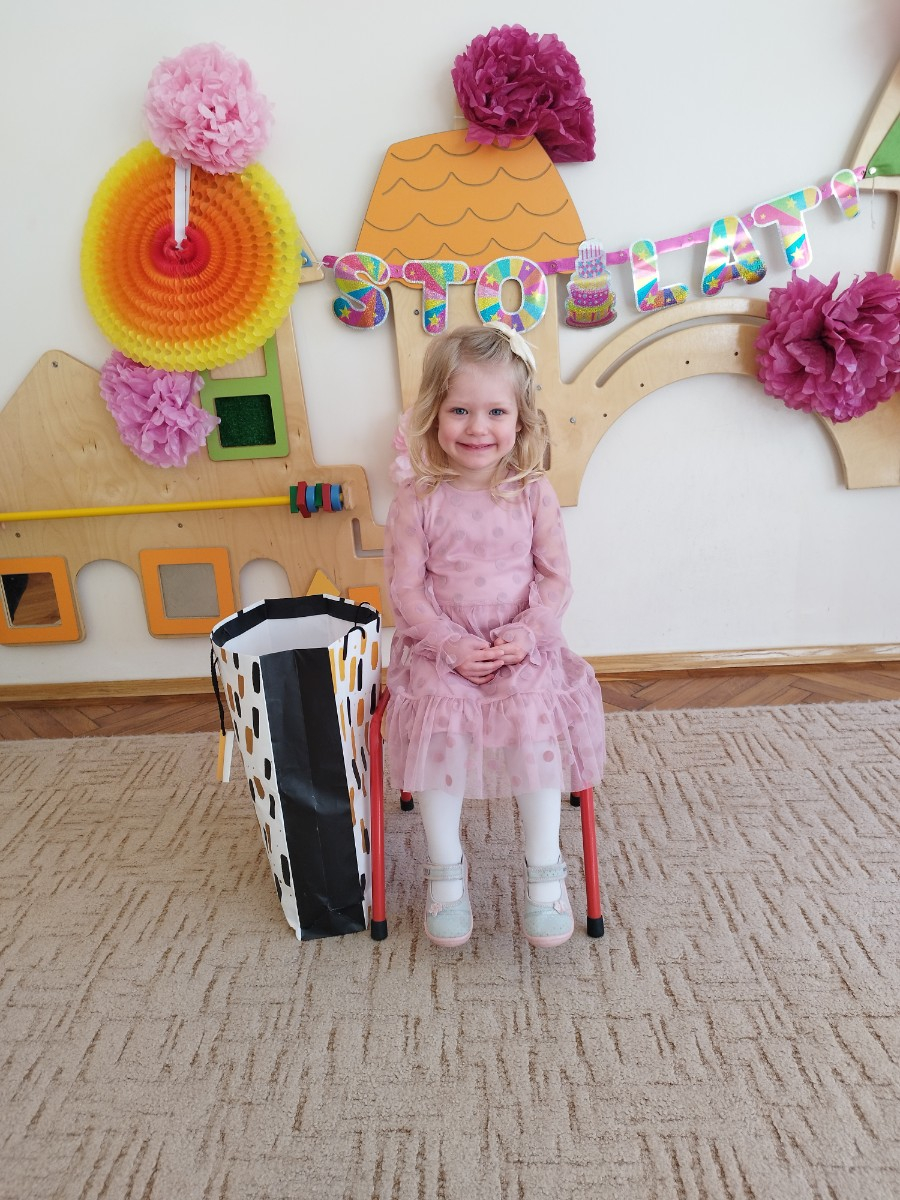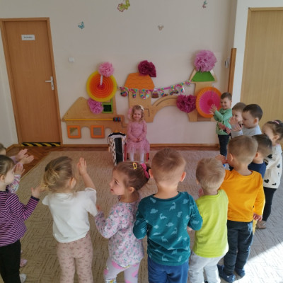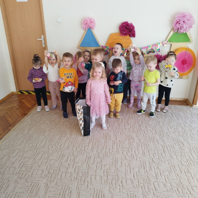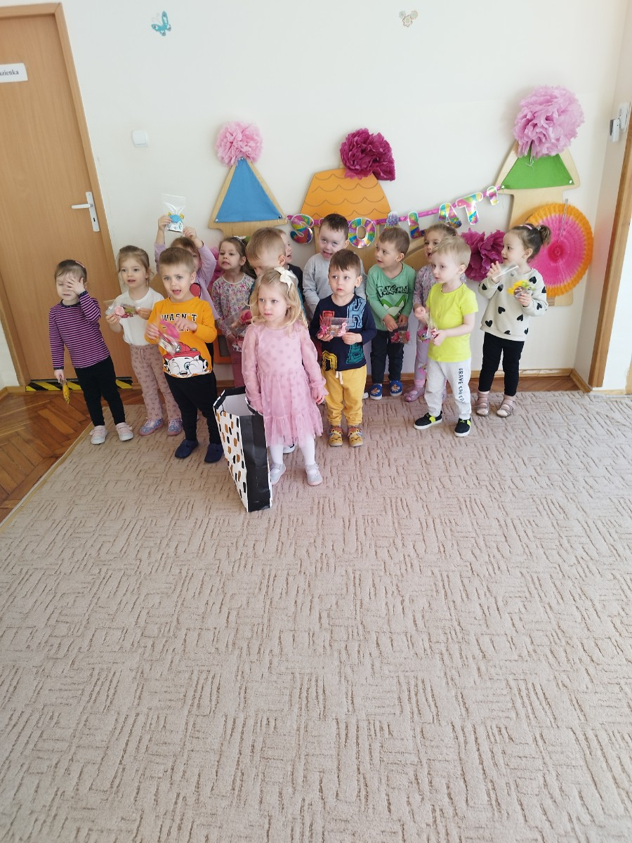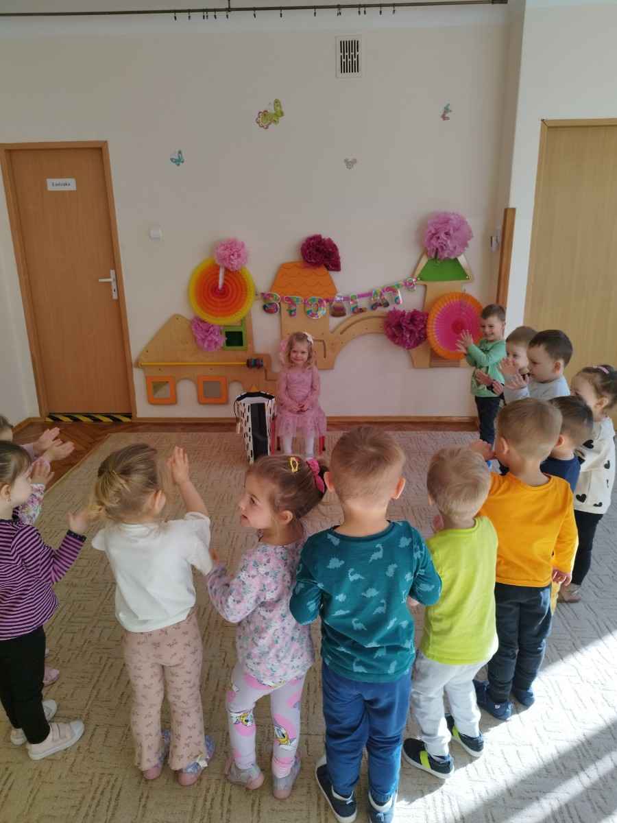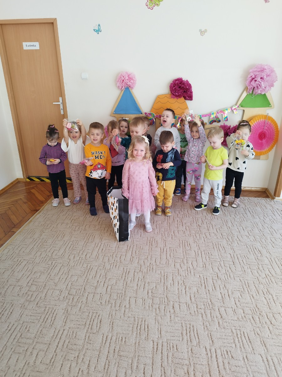 Zdjęcie przedstawia dzieci świętujace urodziny koleżanki z grupy