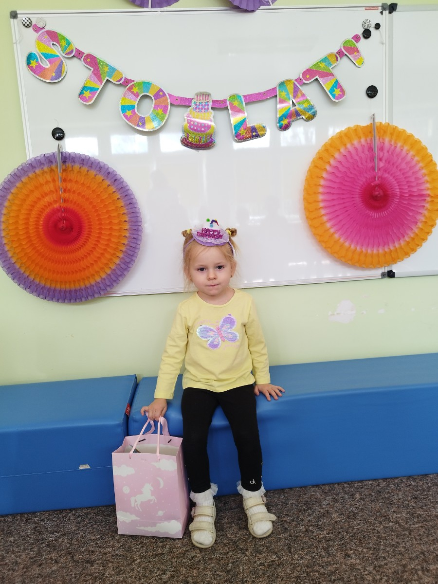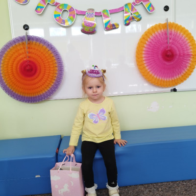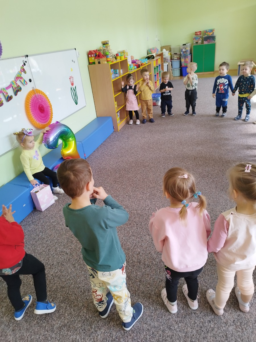 Zdjęcie przedstawia dzieci świętujące urodziny koleżanki