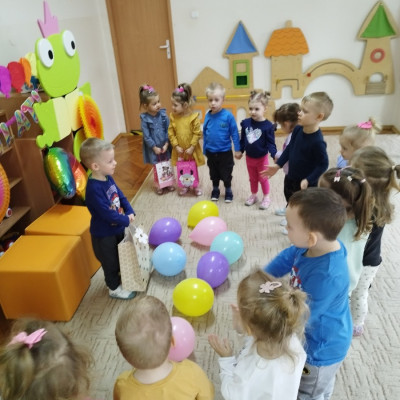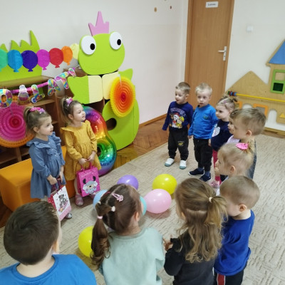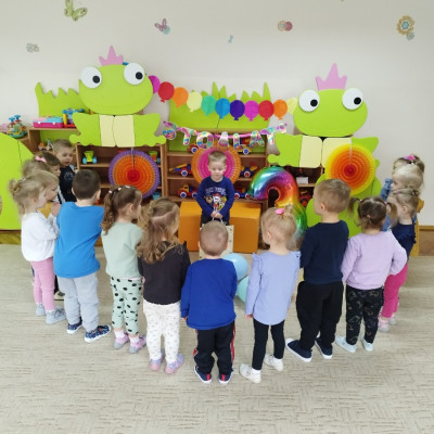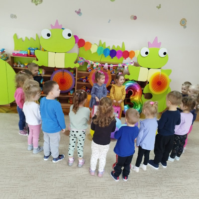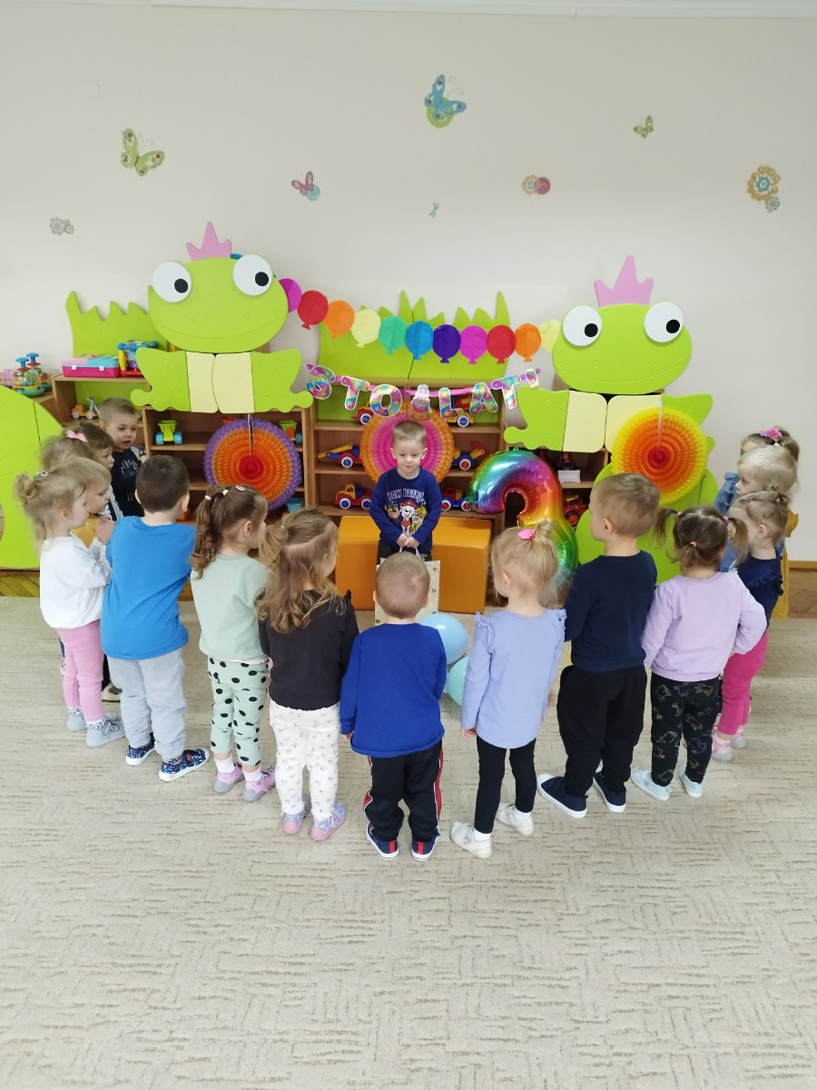 Zdjęcie przedstawia dzieci świętujące urodziny na grupie