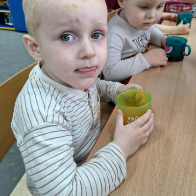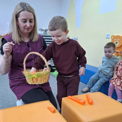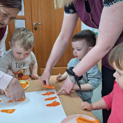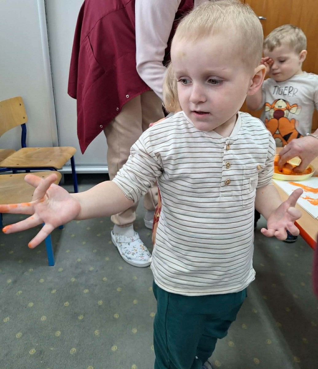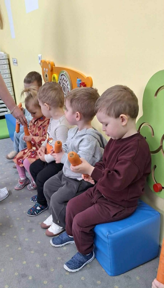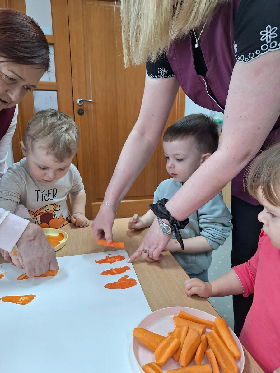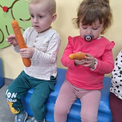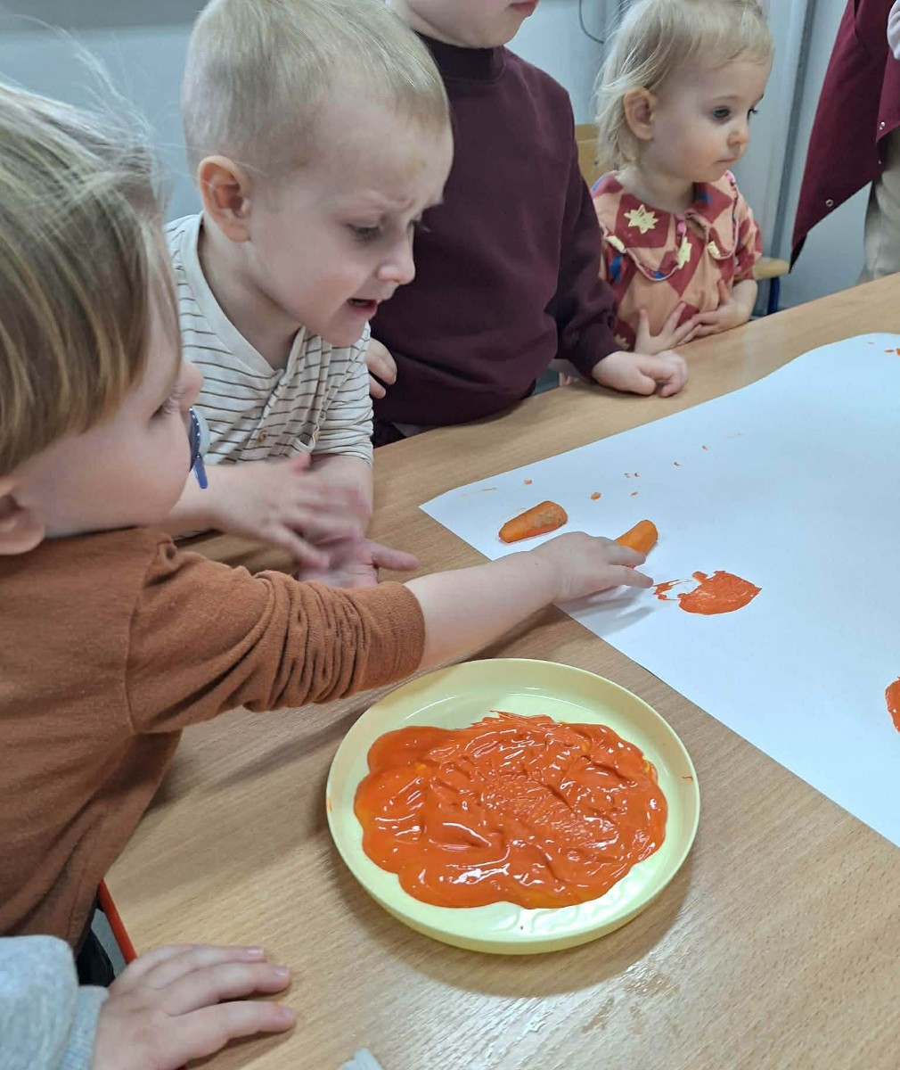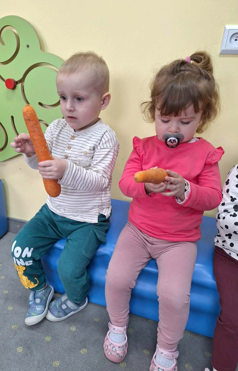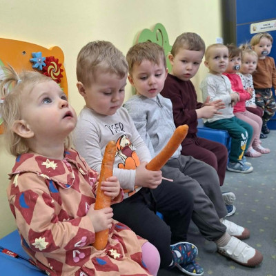 Grupa Pszczółek obchodziła „Dzień Marchewki”, oczywiście królowało to bardzo zdrowe warzywo. Były tańce i zabawy ruchowe, oglądanie, dotykanie i poznawanie właściwości zdrowotnych marchewki, porównywanie wielkości i tworzenie pracy z marchewkowych pieczątek. Na koniec odbyła się degustacja pysznego soku.