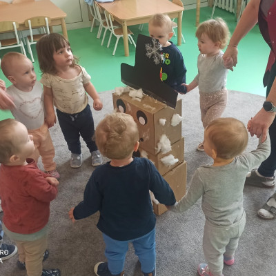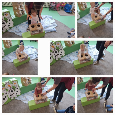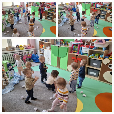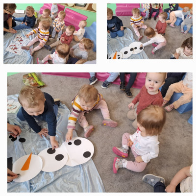 Zima to magiczny czas, a jednym z jej symboli jest bałwan-uśmiechnięty, śnieżny towarzysz dziecięcych zabaw. Podczas zajęć dzieci z naszej grupy z wielkim zainteresowaniem wysłuchały bajki "Bałwankowy maluszek" a następnie wyszukiwały w magicznym pudelku gadzetów ktore zazwyczaj posiada bałwanek oraz układały proste puzle.Dzieci wykonały także pracę plastyczną polegającą doklejaniu waty do sylwetki bałwana. Na zakończenie zajęć nasze Misie brały udział w bitwie śnieżkowej podczas której obrzucały się papierowymi śnieżkami oraz tańczyły do piosenki ,, Ulepiła Hanka małego bałwanka"'.