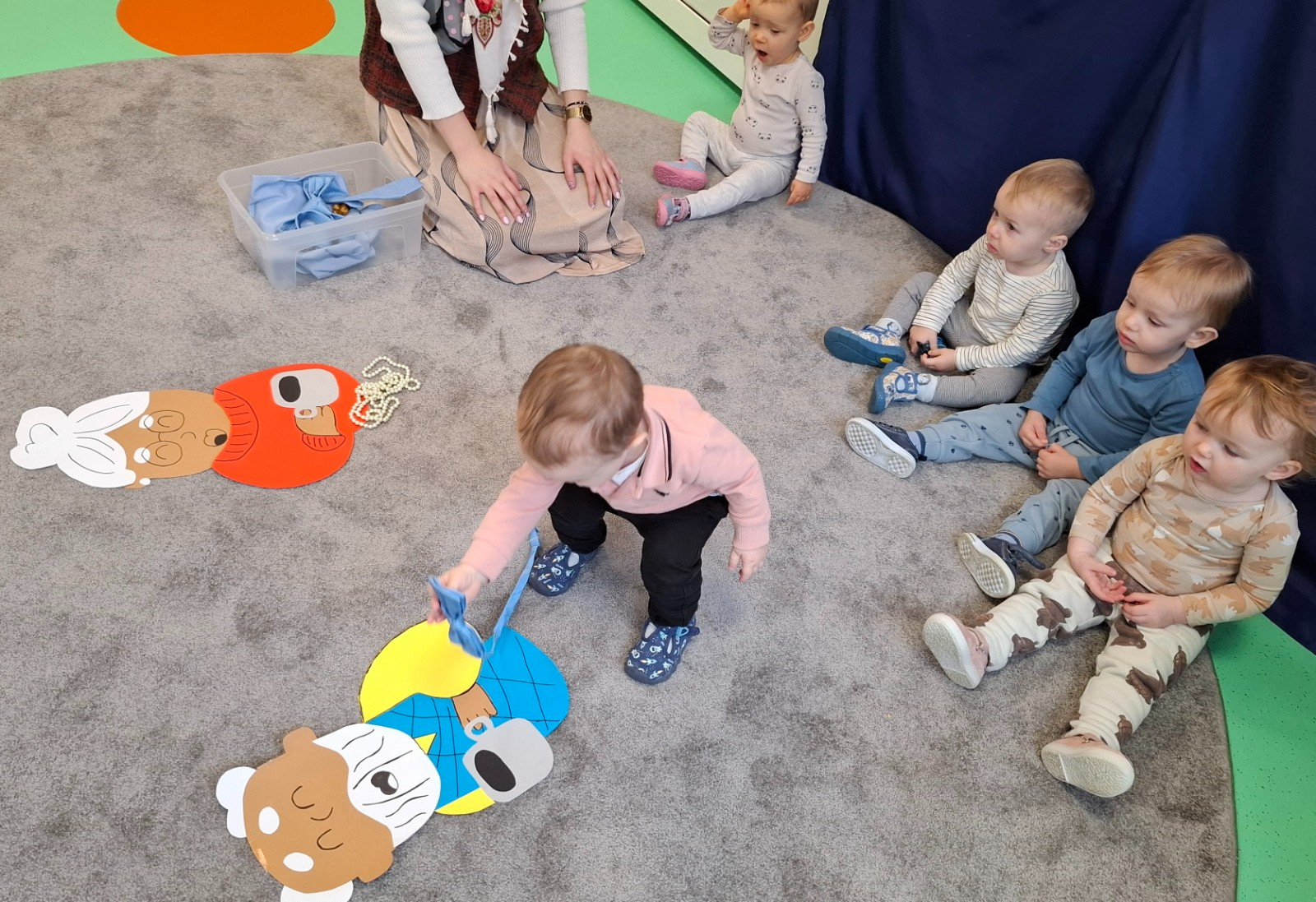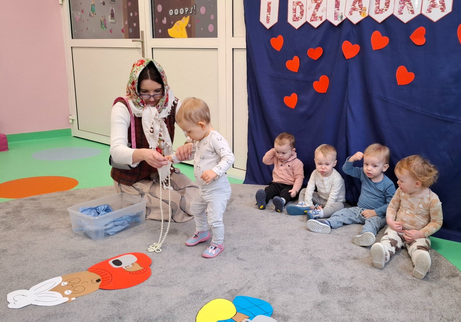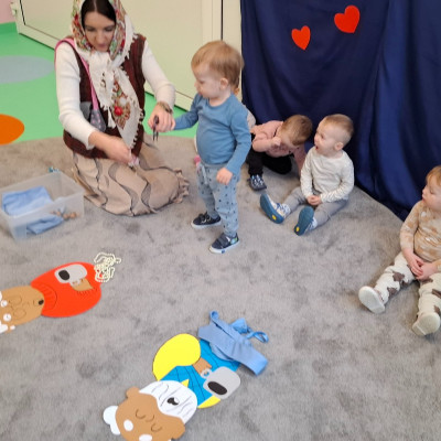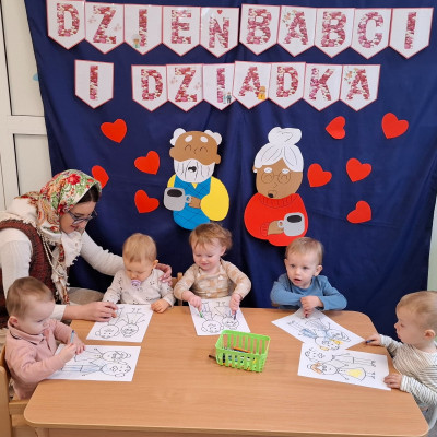 Babcia i dziadek to osoby zajmujące szczególne miejsce w serduszku małego dziecka . Z tej okazji w piątek na grupie misie obchodziliśmy ich święto a kilka dni wcześniej w ramach przygotowań dzieci wspólnie z paniami opiekunkami wykonały piękne kalendarze dla swoich dziadków. W tym dniu naszą grupę odwiedziła szczególna osoba a mianowicie przyszywana babcia która przeczytała naszym dzieciom bajkę o czerwonym kapturku. Nieco póżniej nasze maluszki segregowały gadżety które należą do babć i dziadków oraz malowały kredkami ich postacie. Wykonując te zadania ćwiczyły spostrzegawczość oraz usprawniały motorykę małą. Na zakończenie zajęć wspólnie bawiły się przy piosenkach Babciu droga babciu , Moja babcia i mój dziadek..itp.