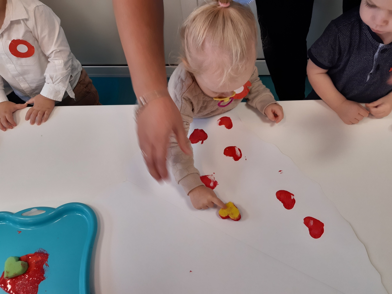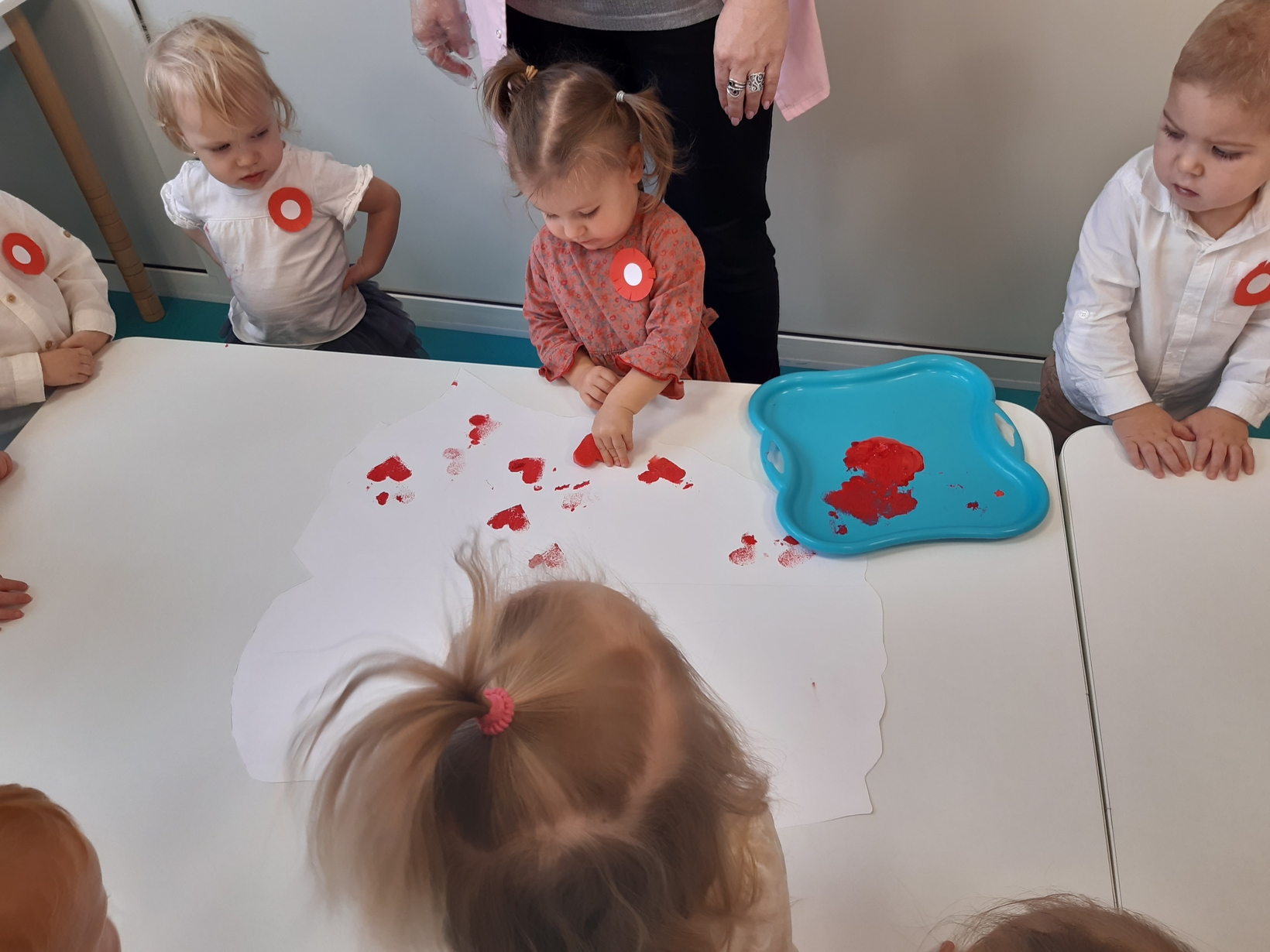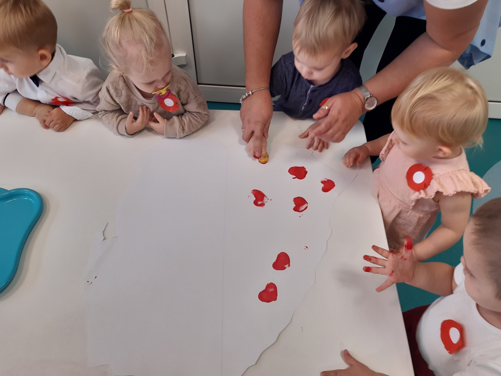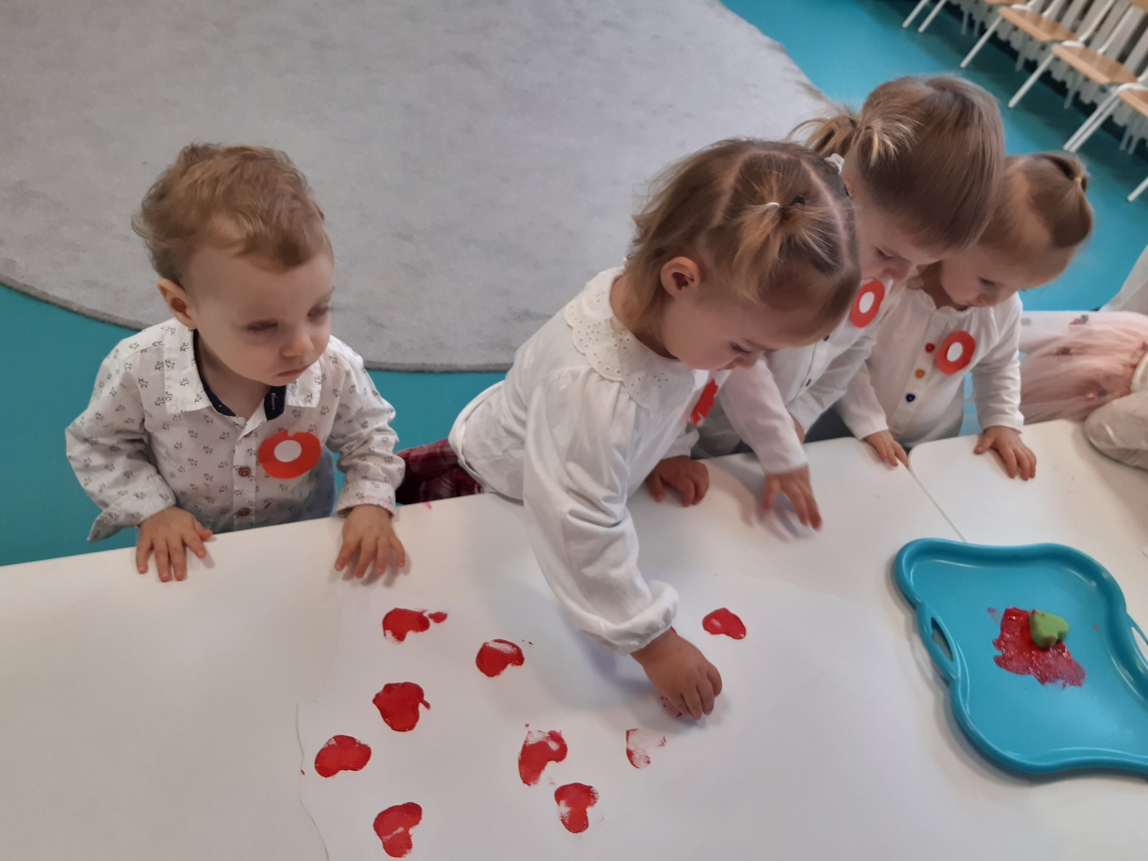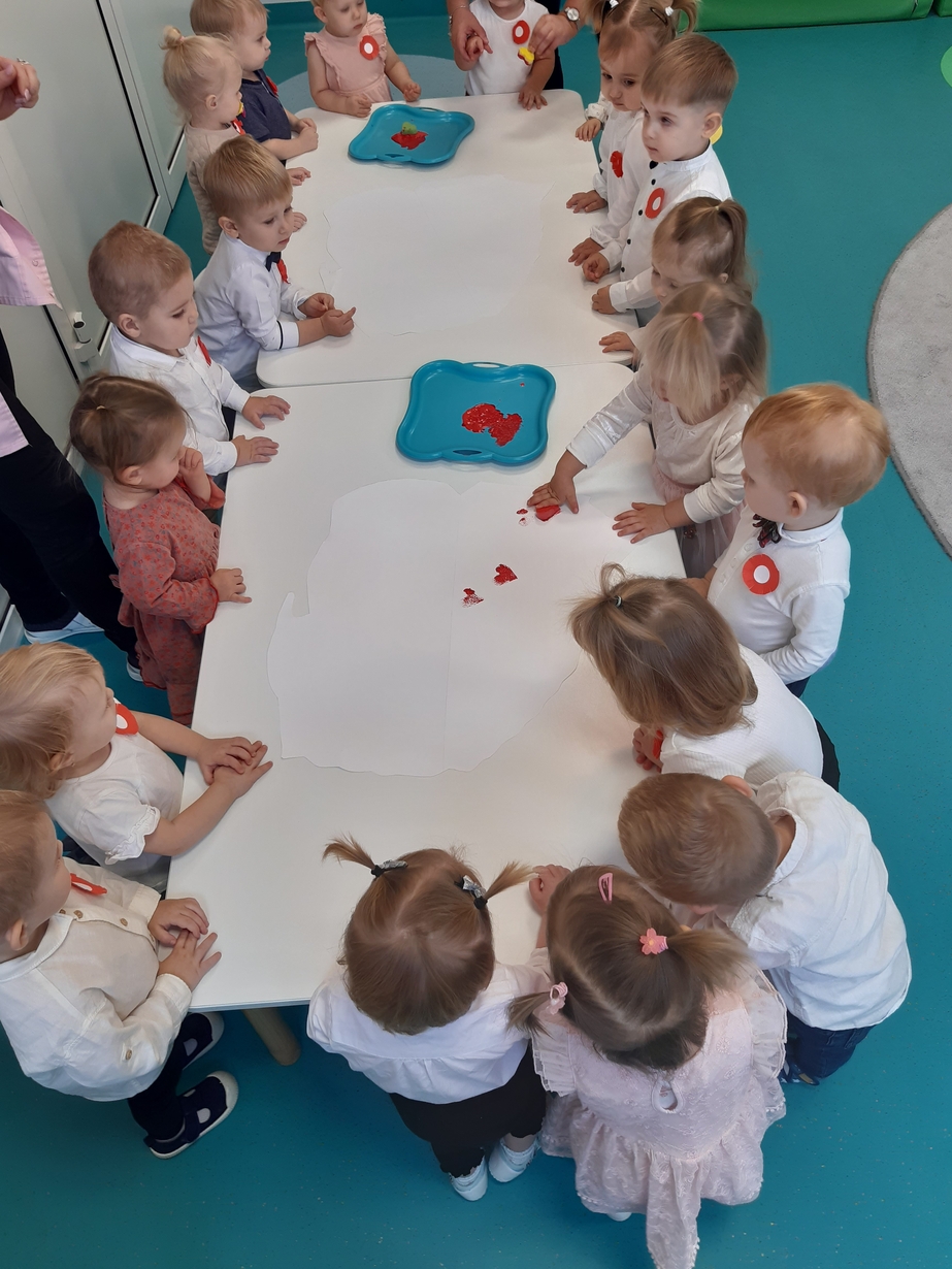 Na koniec zajęć Żabki wykonały prace plastyczne grupowe do wykonania których wykorzystały  czerwoną farbę oraz gąbki kuchenne za pomocą których odbijały czerone pieczątki na przygotowanej z papieru mapie Polski.