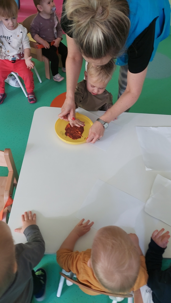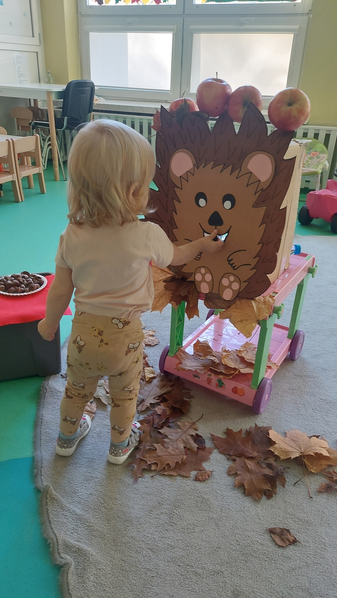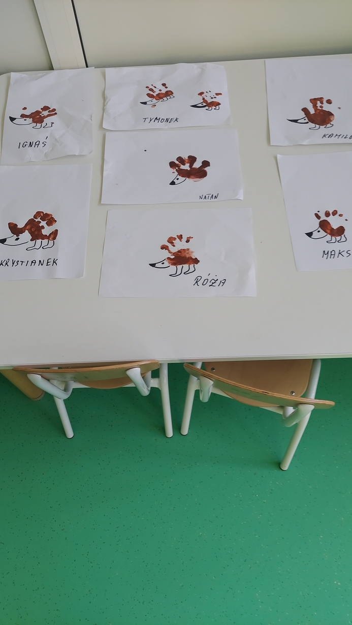 Nasze Misie podczas dzisiejszych zajęć świętowały Dzień Jeża. Na początku dowiedzieli się wielu ciekawostek o tym zimowym śpiochu. Później przy pomocy pań opiekunek wykonały prace plastyczną, odbijając małe rączki na kartce papieru, z których powstały piękne jeżyki. Następnie wszyscy uczestniczyli w wesołej zabawie, a mianowicie karmiły wesołego jeża kasztanami i żołędziami. Na zakończenie ćwiczyliście motorykę dużą przy zabawie ,, na dywanie siedzi jeż " oraz śpiewaliśmy piosenki o tym kolczastym zwierzaku.
