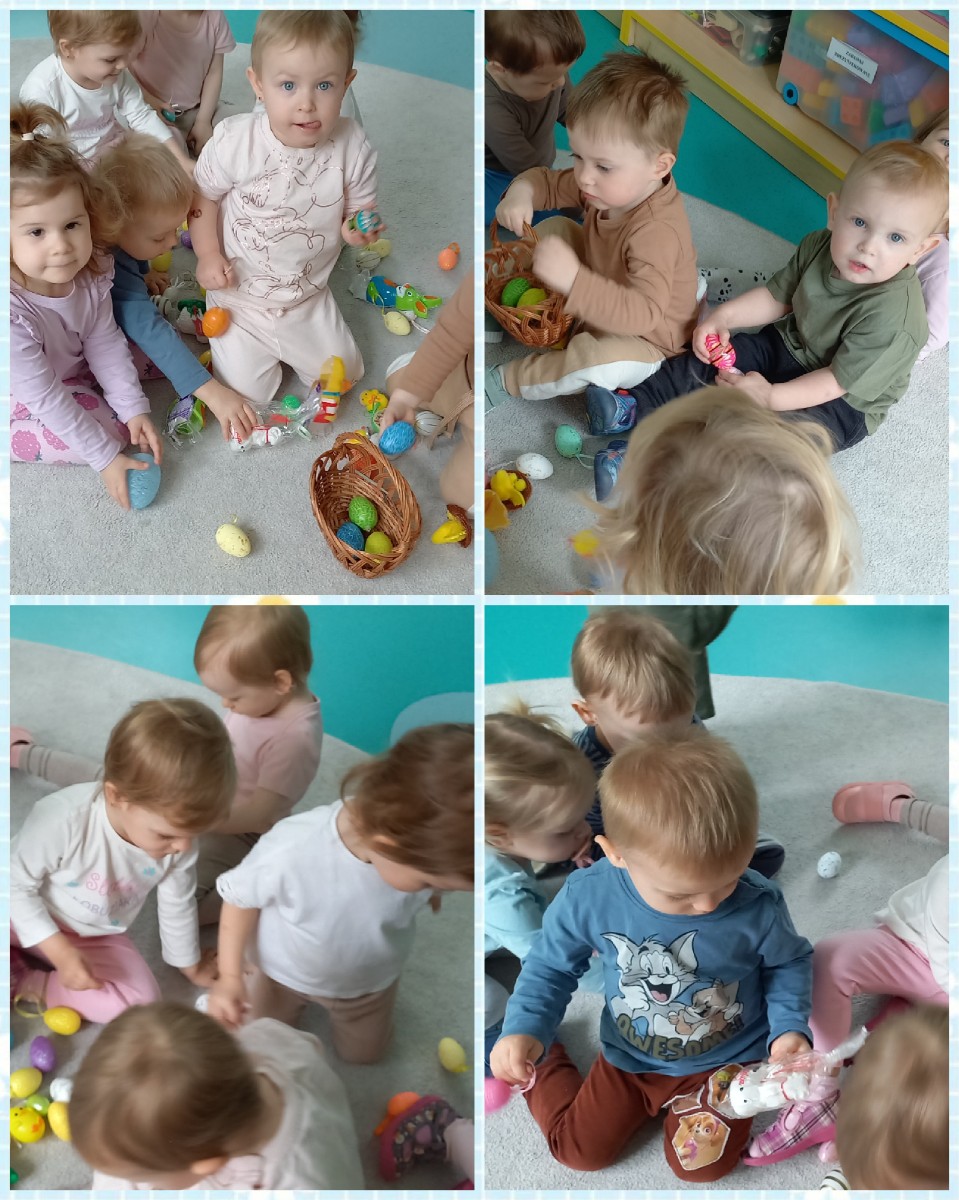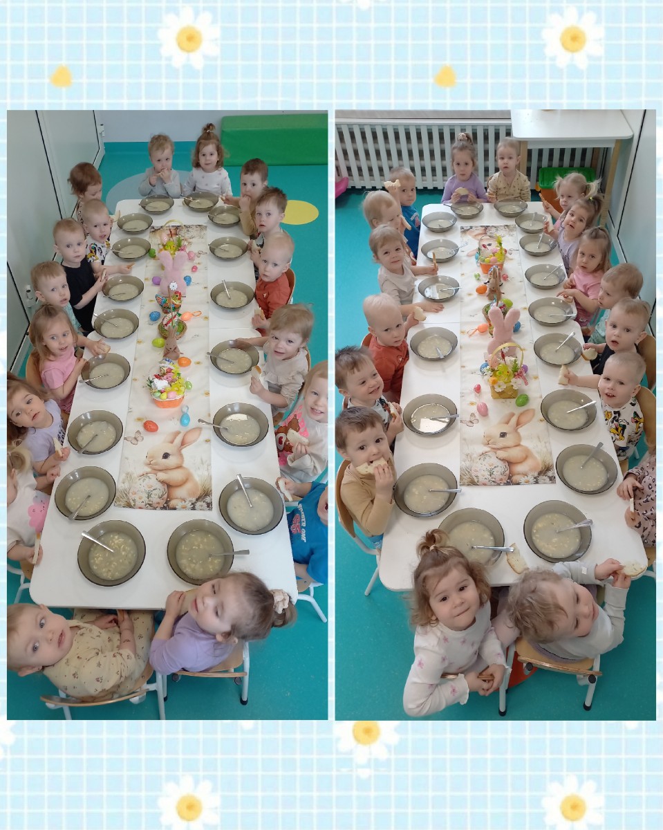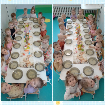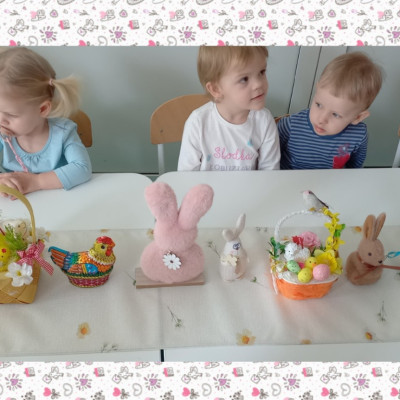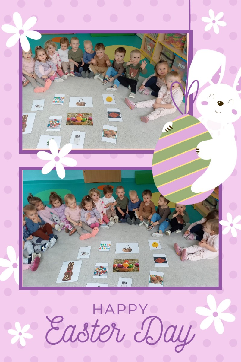 dzieci poznały symbole tych świąt ,dowiedziały się co powinno znajdować się w koszyczku wielkanocnym oraz o tradycji lanego poniedziałku. Dzieci wspólnie przy jednym stole zjadły wielkanocne śniadanie.