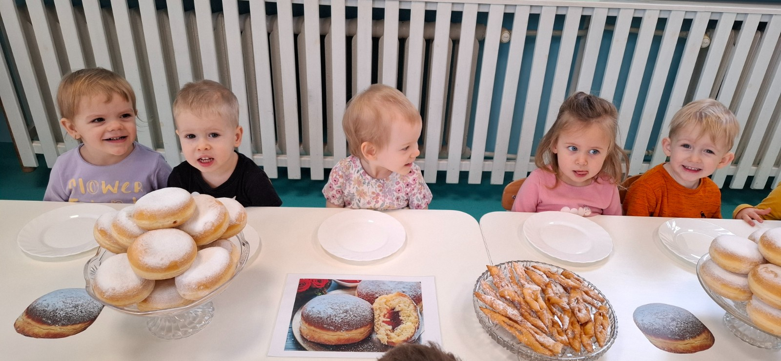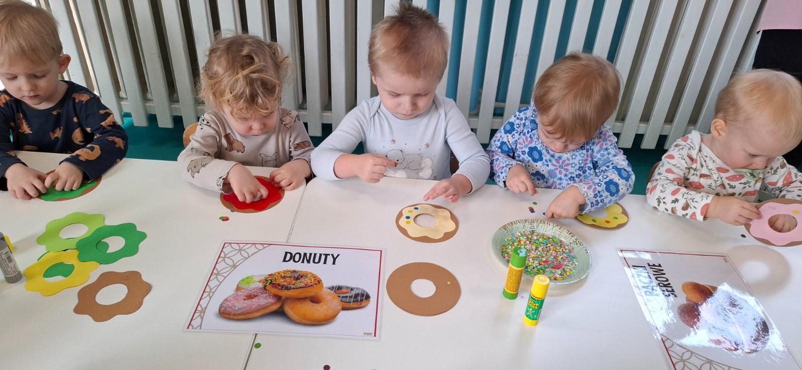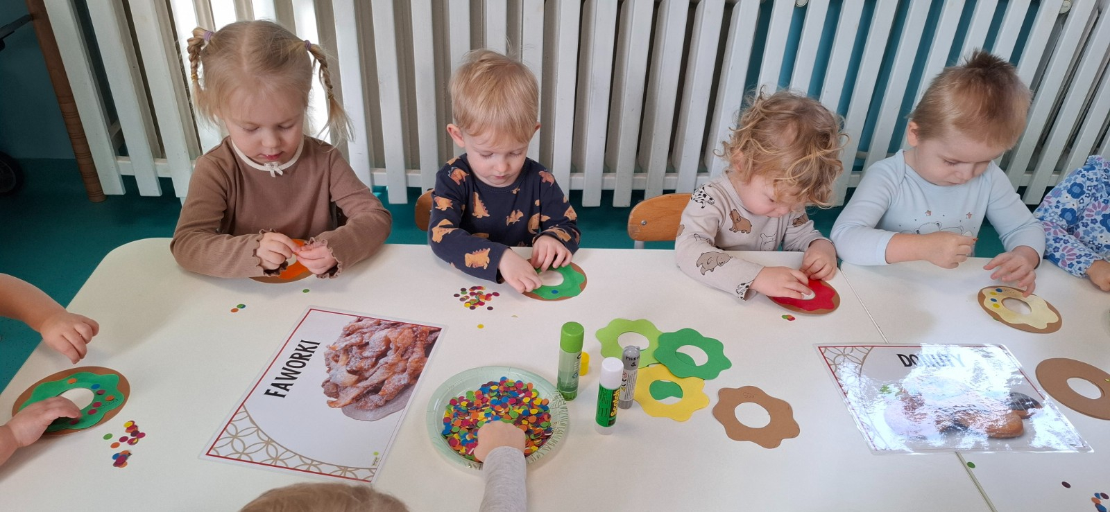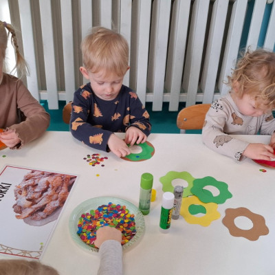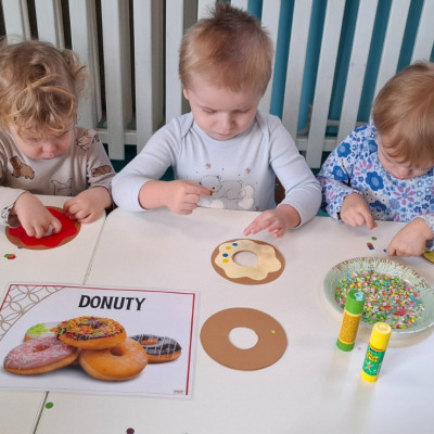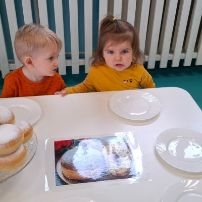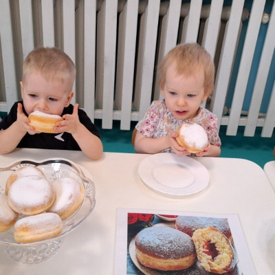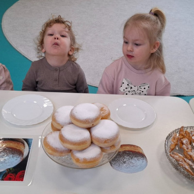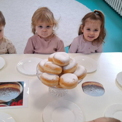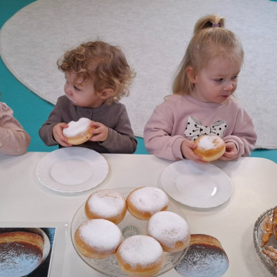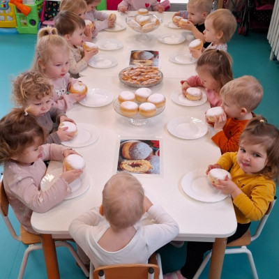 W dniu 27 Lutego dzieci z Grupy ,,Żabki" obchodziły,,Tłusty Czwartek".Najważniejszym akcentem w tym dniu były oczywiście pączki oraz faworki.Podczas obchodów tego dnia dzieci poznały tradycje i obrzędy związane z tym zwyczajem.Uczestniczyły w różnych zabawach z pączkami,faworkami i donutami w roli głównej.W ramach zajęć plastycznych dzieci wykonały apetycznie wyglądające donuty. Dzieci dowiedziały się również z czego i jak wypieka się pączki oraz faworki.Wszyscy z wielkim apetytem zajadali smaczne pączki.Były pyszne co widać było po uśmiechniętych buziach naszych dzieciaczków.