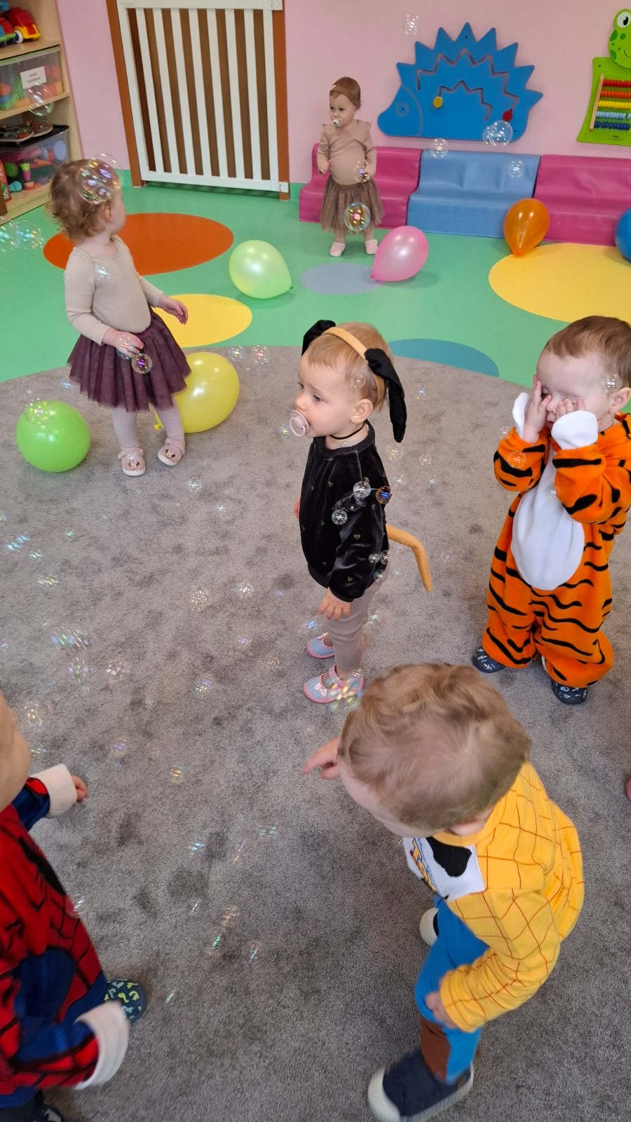 Zdjęcie przedstawia dzieci biorące udział w zabawie karnawałowej.