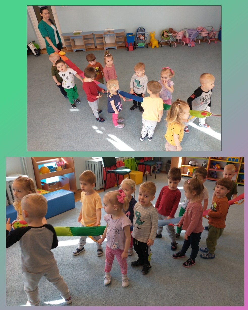 Dzieci ćwiczyły również swoją koordynacje ruchową gdy szły na spacer z materiałowym wężem.