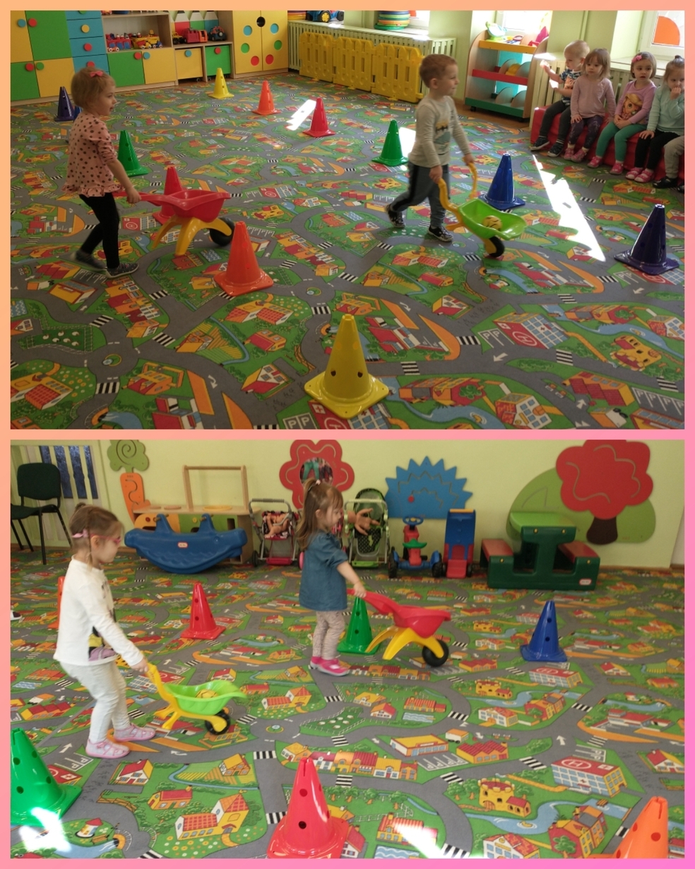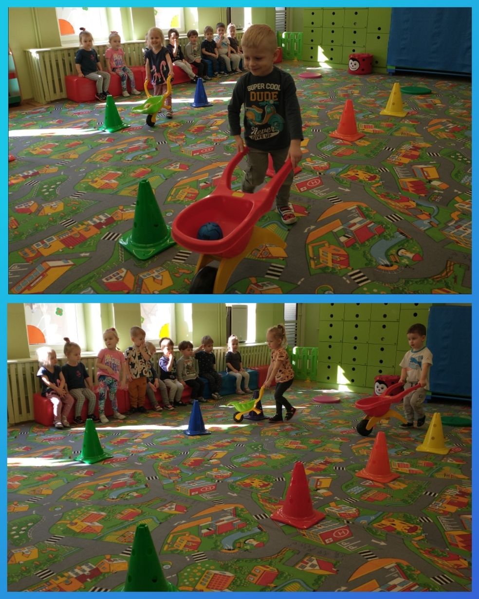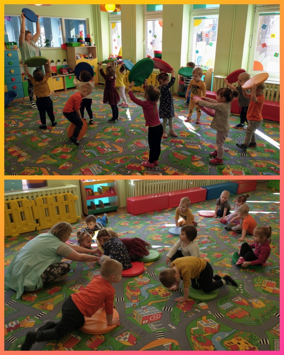 Zabawa z kółeczkami gimnastycznymi, chustą animacyjną oraz pokonywanie toru przeszkód pomagały ćwiczyć sprawność motoryczną.