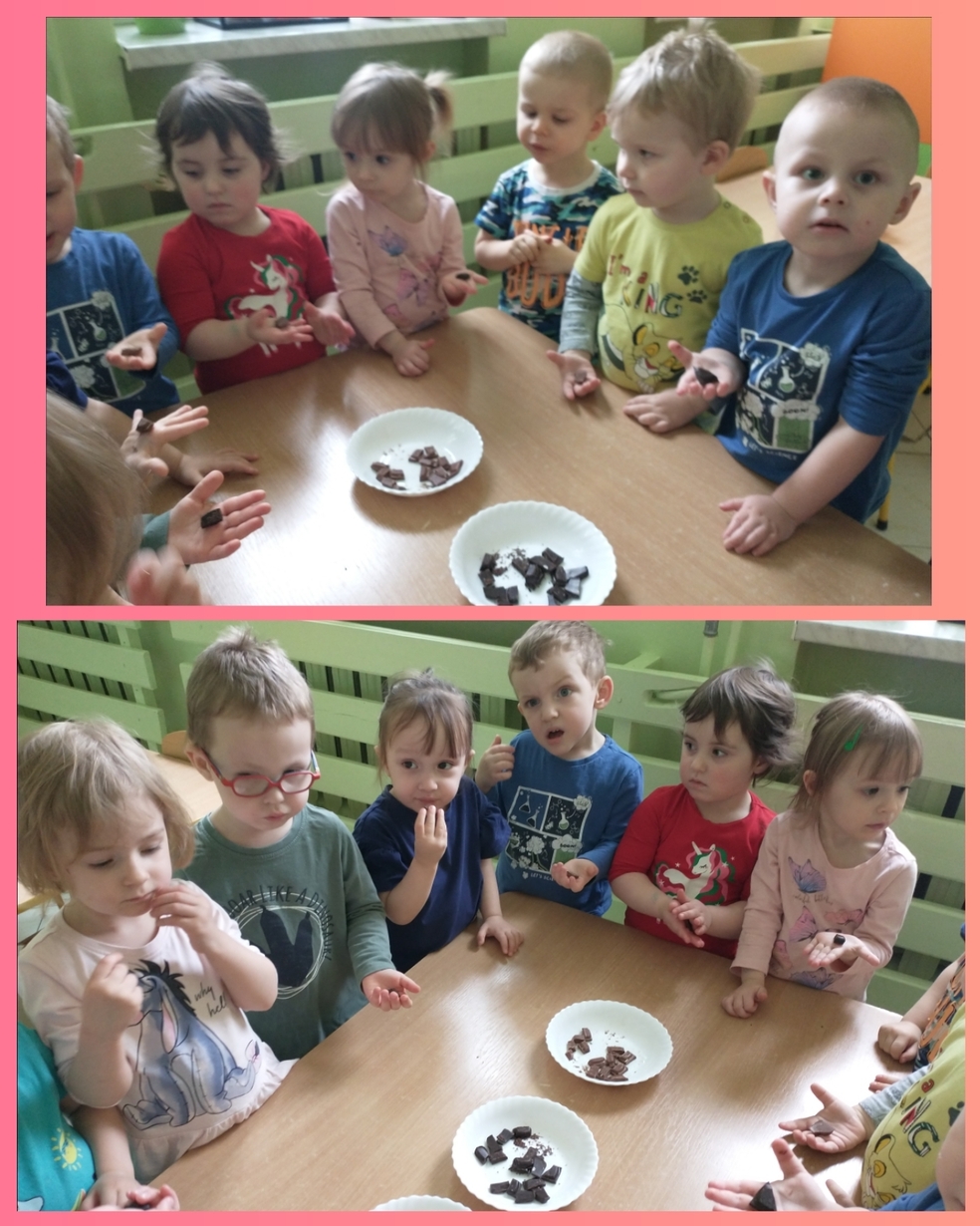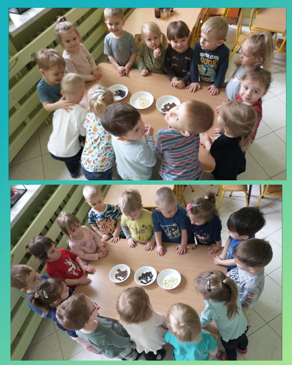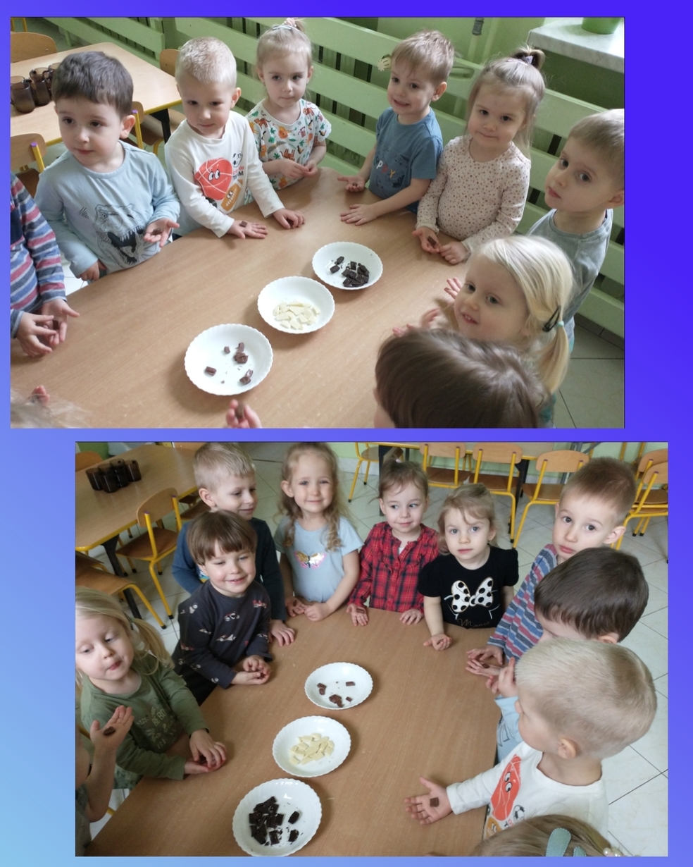 Żabki z 3 grupy miały w tym dniu okazję spróbować 3 odmian czekolady: gorzką, mleczną i białą.