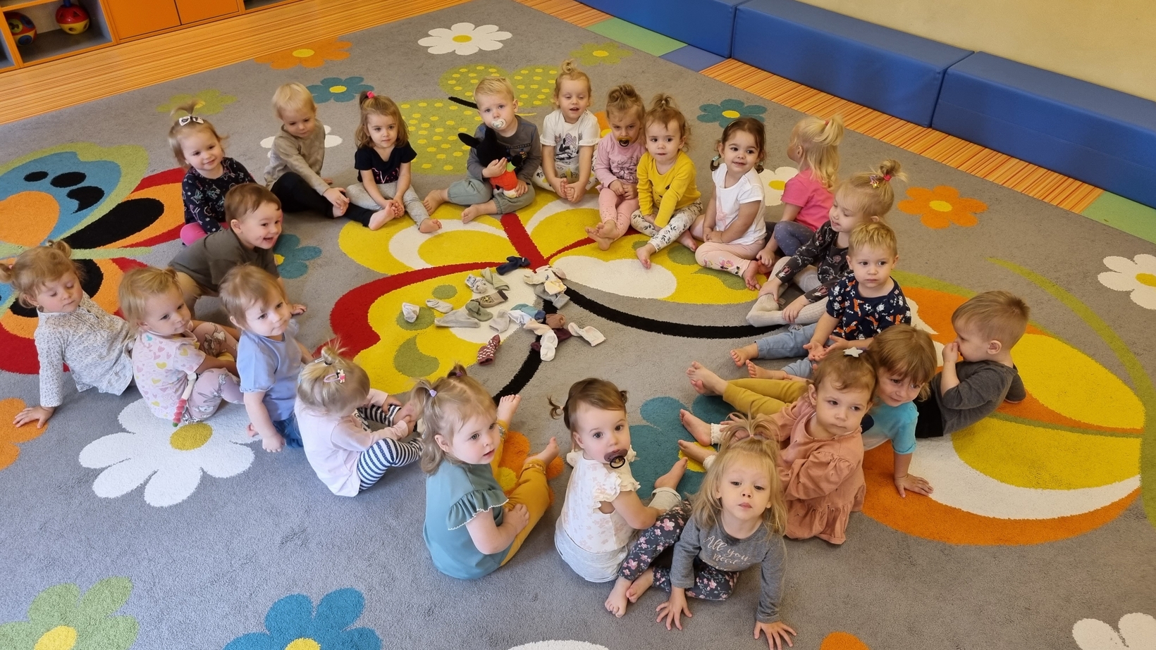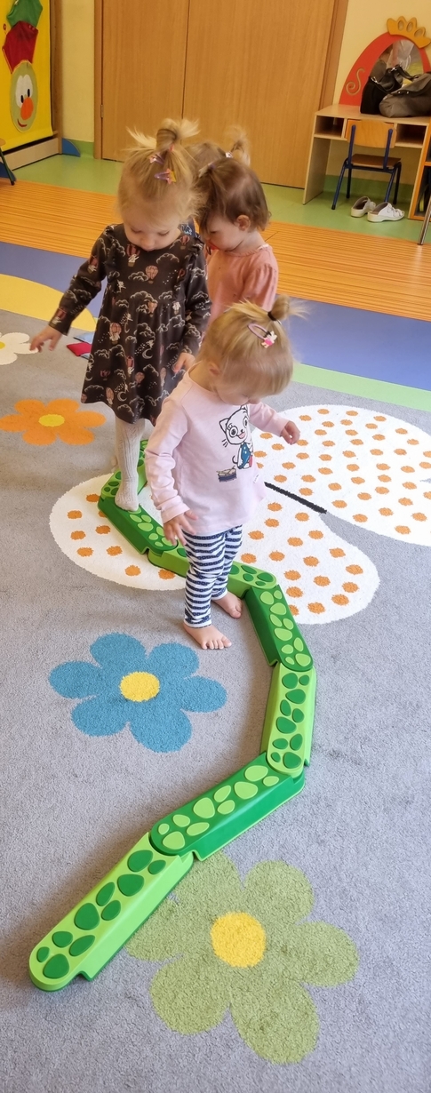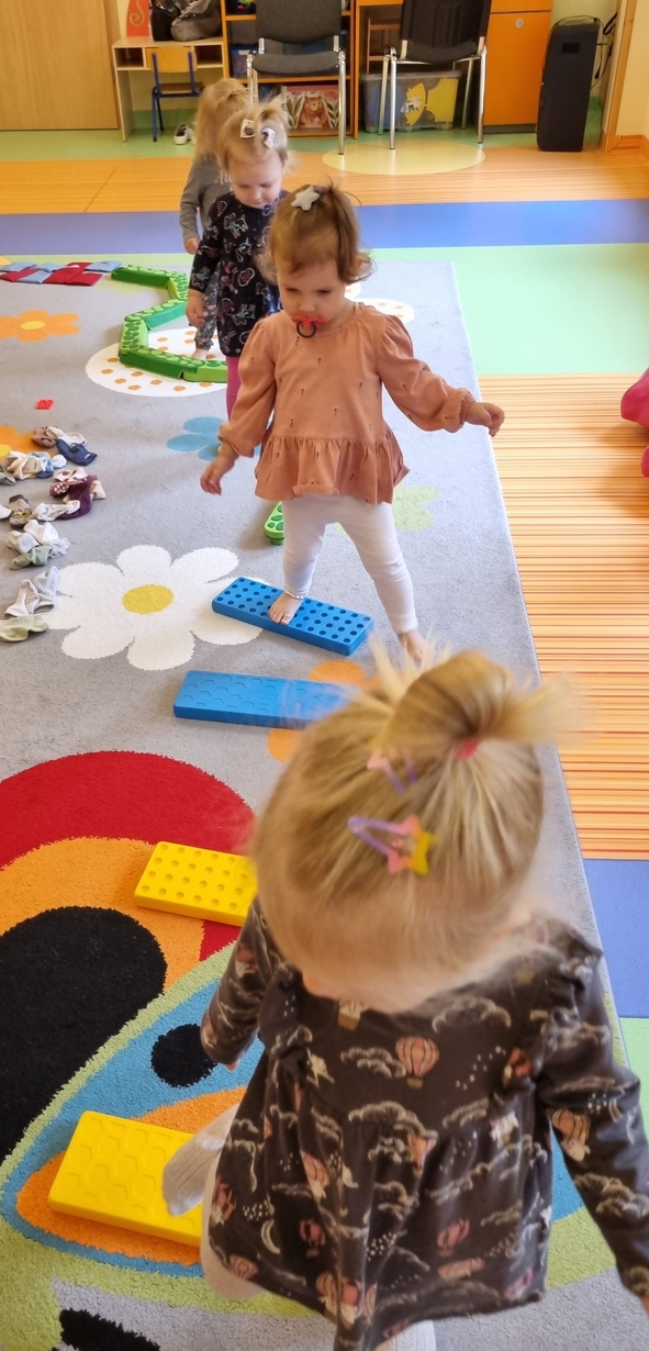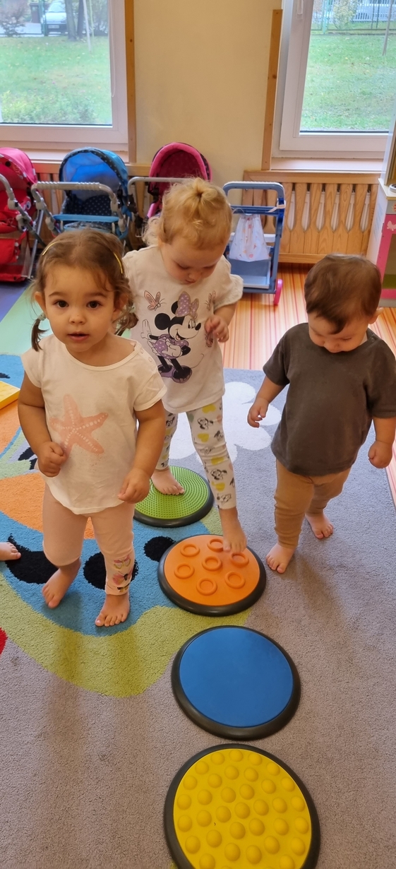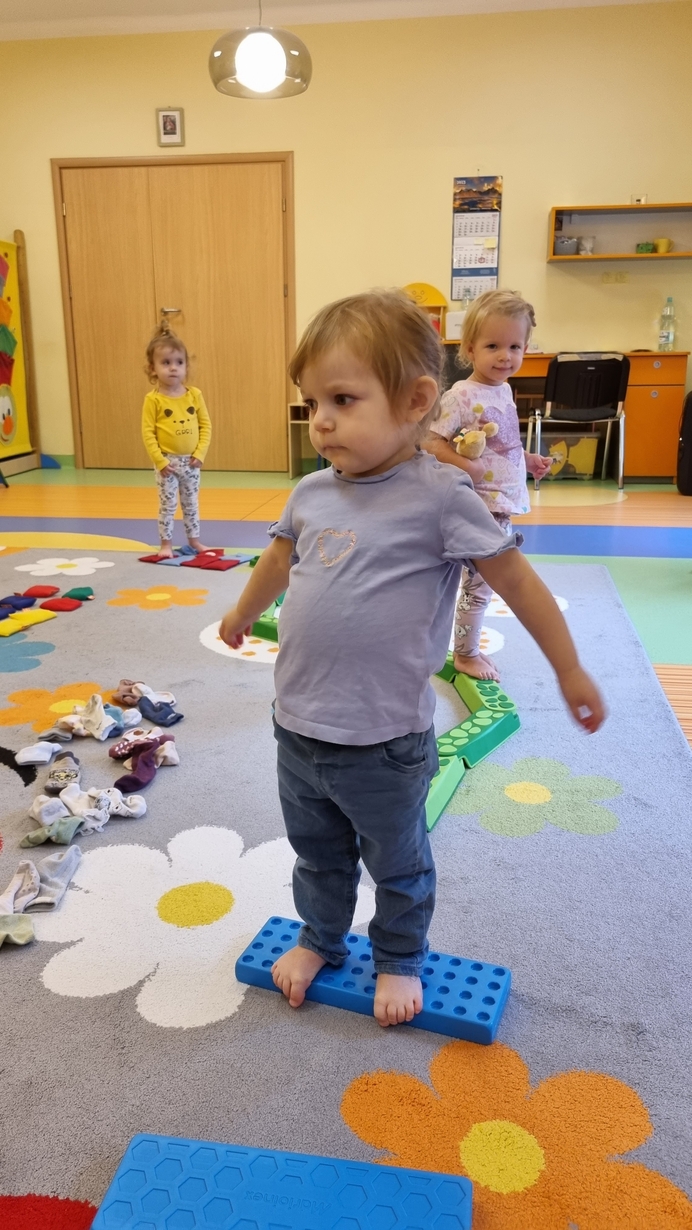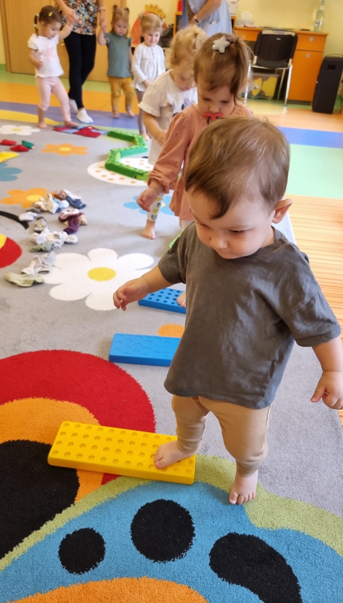 W dniu dzisiejszym "Muchomorki" obchodziły Dzień bez Skarpetek. Nosimy je na co dzień do spodni, legginsów, krótkich spodenek, a nawet do klapek i sandałów ale w tym dniu można było z nich zrezygnować. Korzystając z tej okazji Muchomorki miały możliwość wzięcia udziału w sensorycznych zabawach gołymi stópkami. Doświadczenia sensoryczne zapewnił nam tor przeszkód. Jednym z etapów naszej zabawy było także samodzielne zdjęcie bucików i skarpetek a potem założenie ich na nóżki.