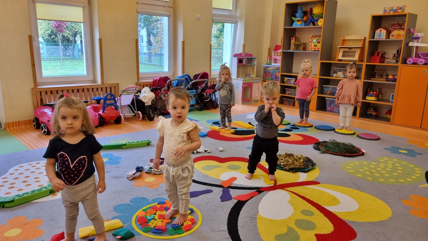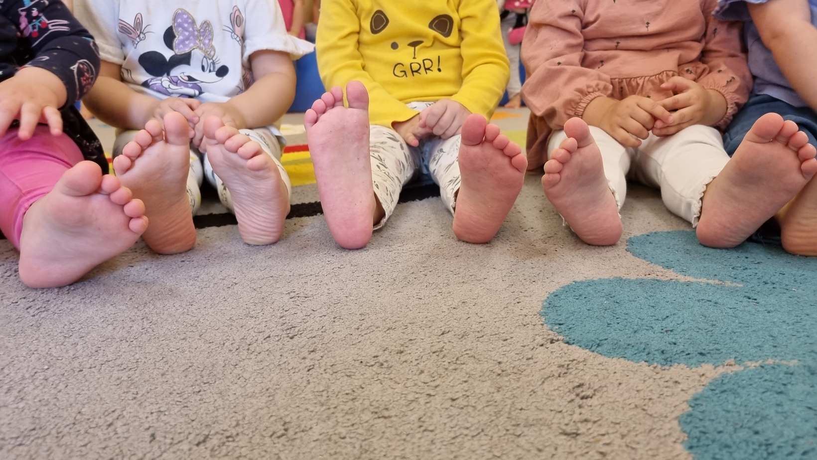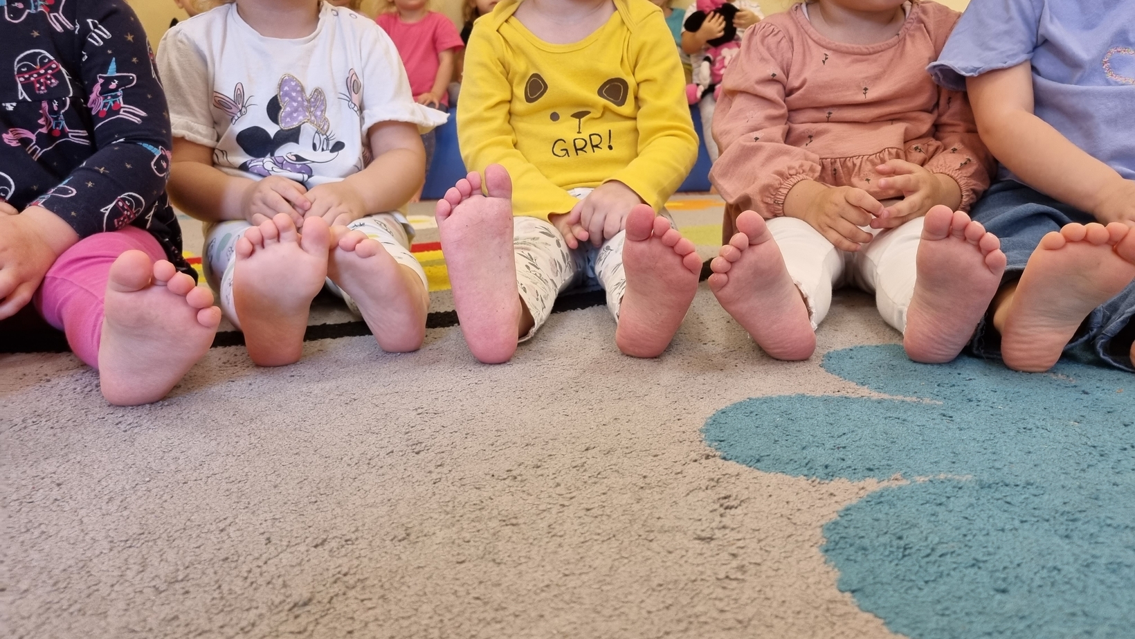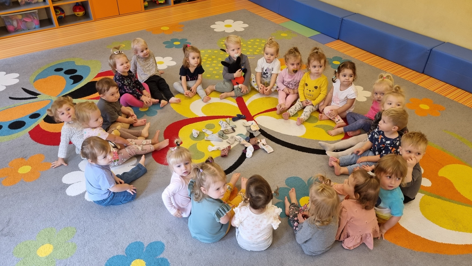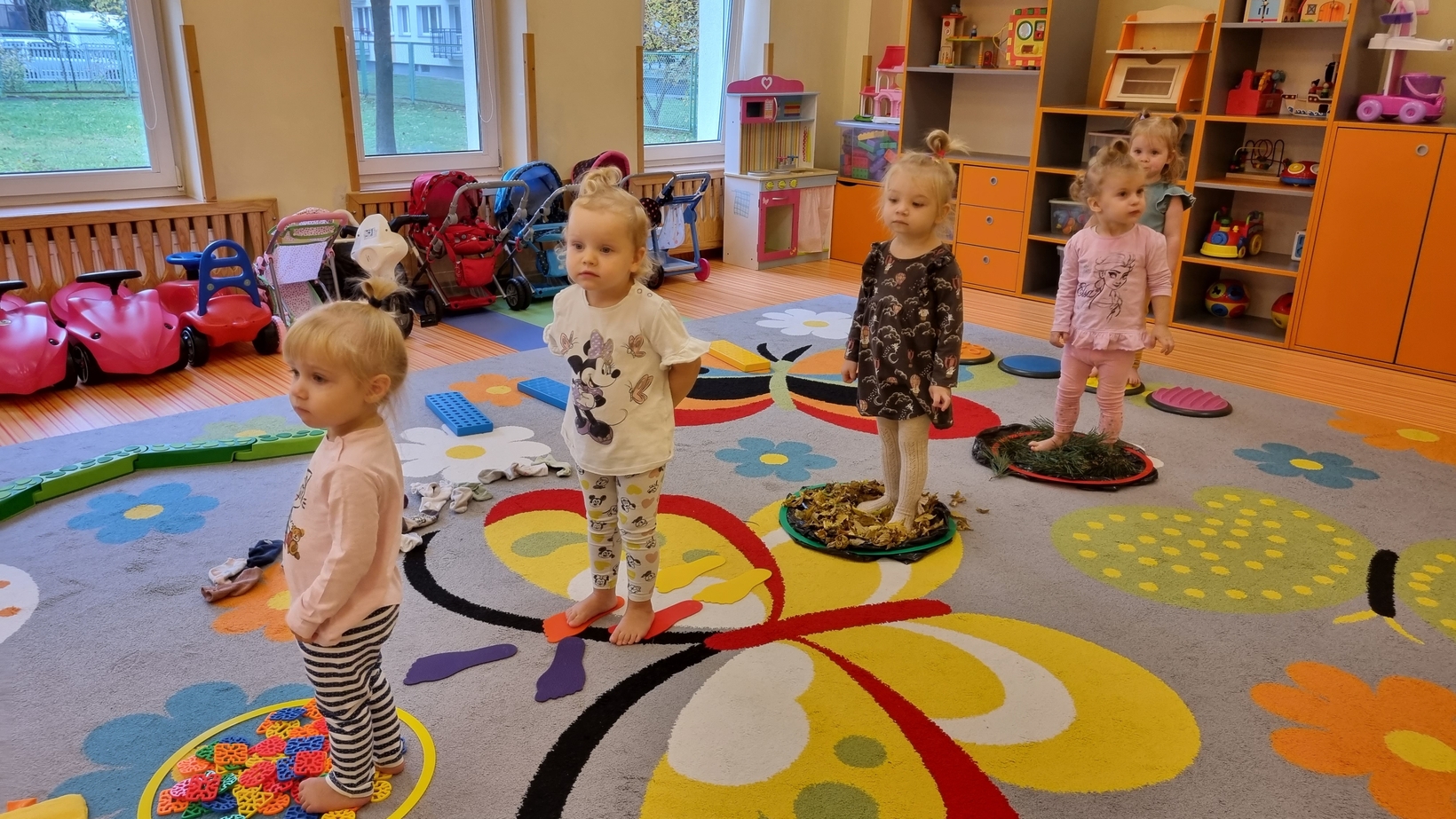 W dniu dzisiejszym "Muchomorki" obchodziły Dzień bez Skarpetek. Nosimy je na co dzień do spodni, legginsów, krótkich spodenek, a nawet do klapek i sandałów ale w tym dniu można było z nich zrezygnować. Korzystając z tej okazji Muchomorki miały możliwość wzięcia udziału w sensorycznych zabawach gołymi stópkami. Doświadczenia sensoryczne zapewnił nam tor przeszkód. Jednym z etapów naszej zabawy było także samodzielne zdjęcie bucików i skarpetek a potem założenie ich na nóżki.