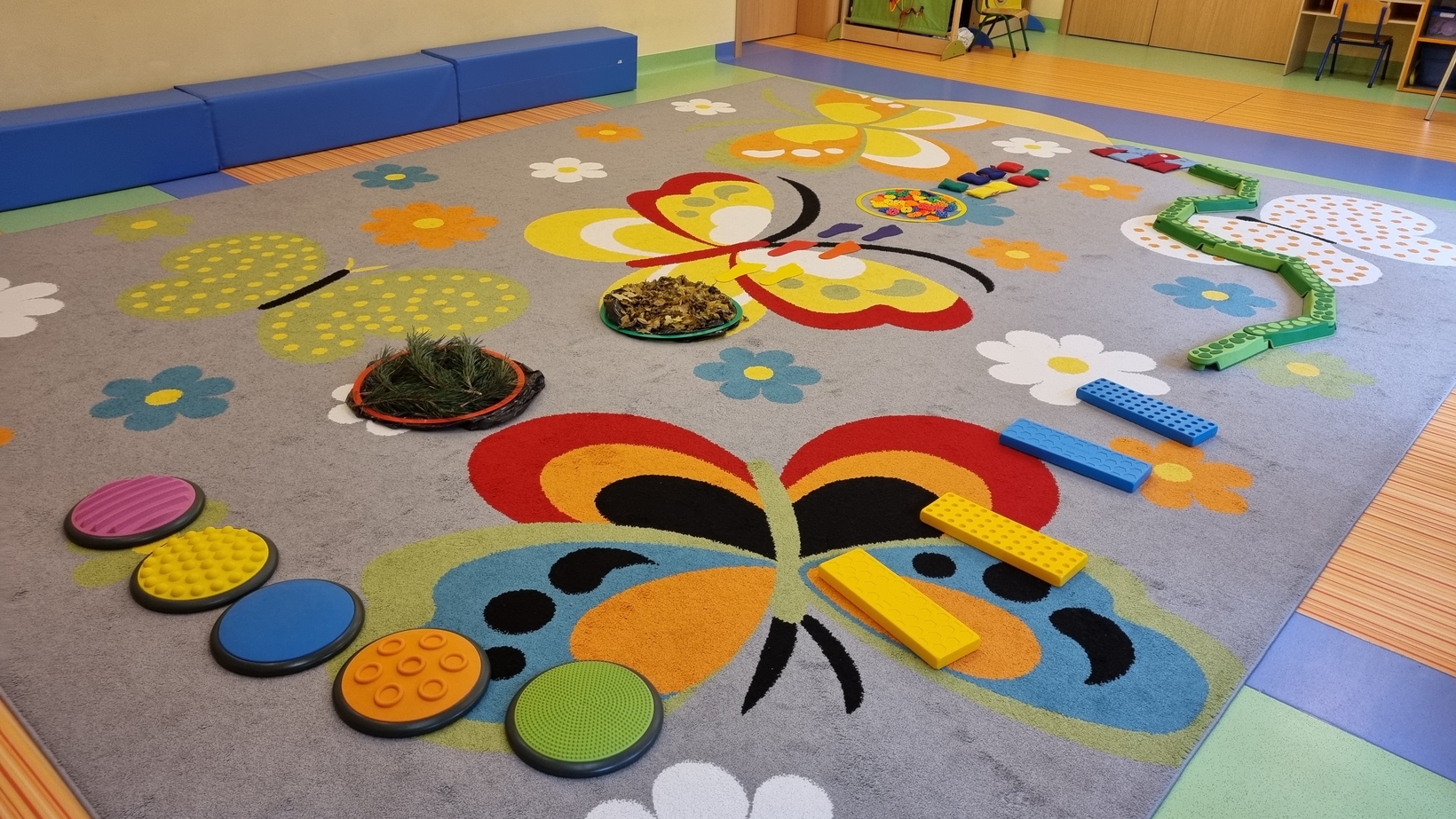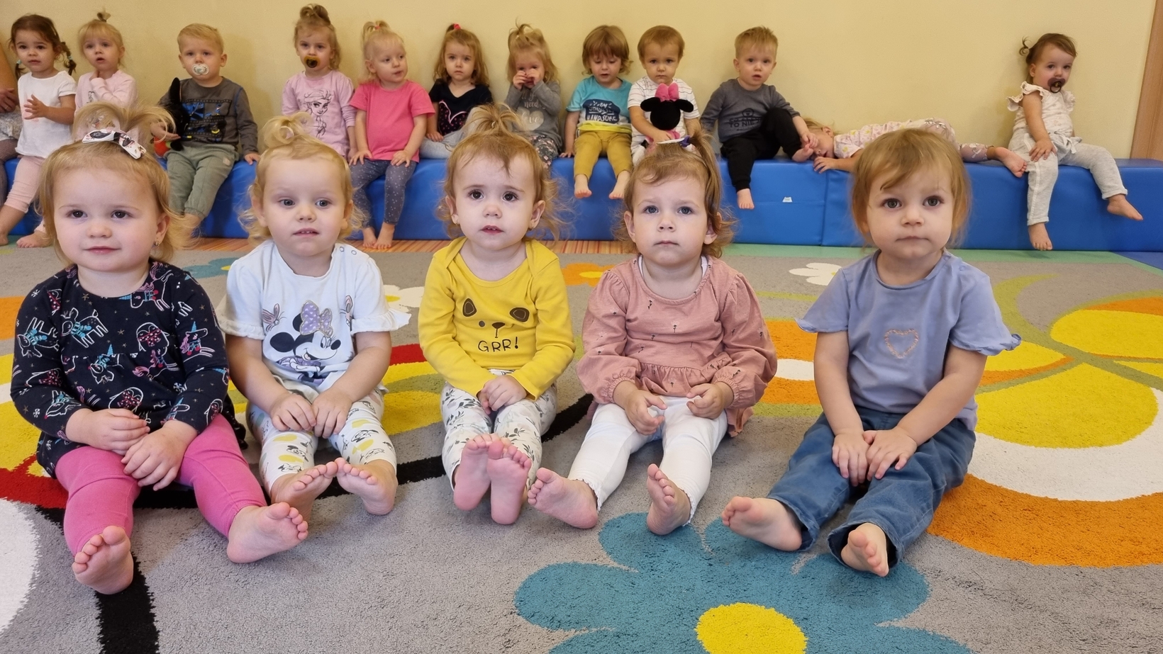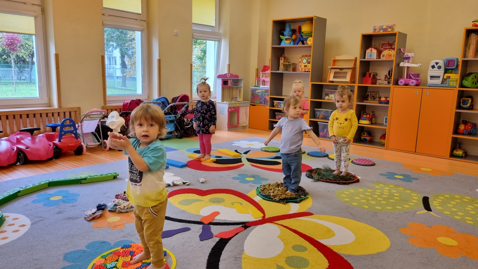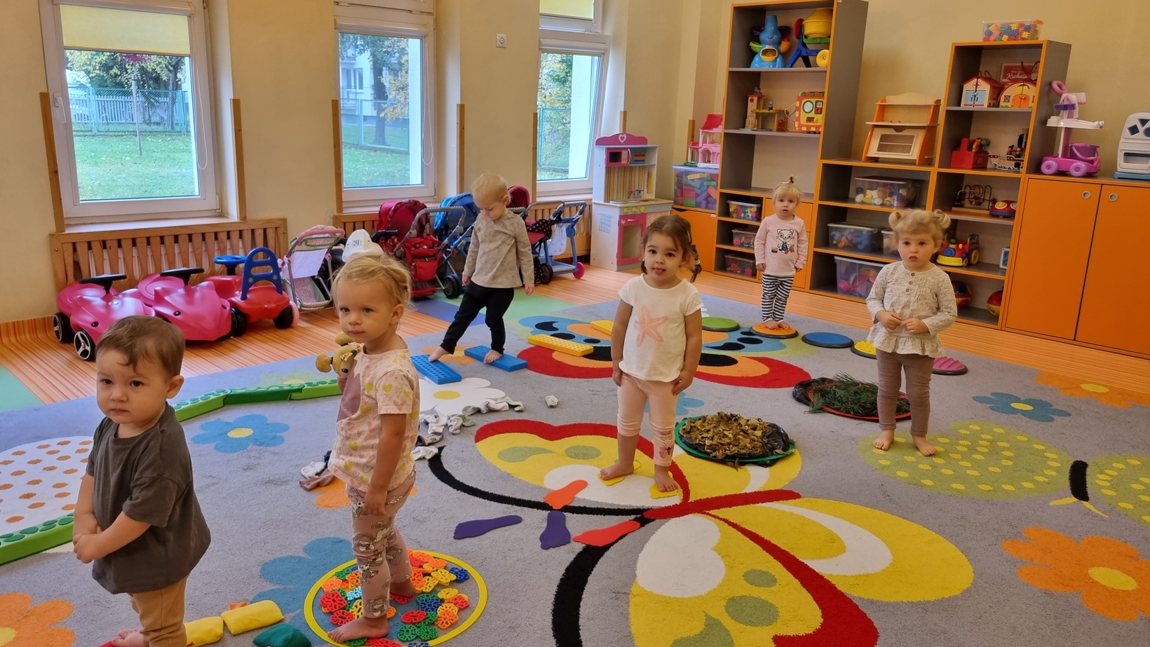 W dniu dzisiejszym "Muchomorki" obchodziły Dzień bez Skarpetek. Nosimy je na co dzień do spodni, legginsów, krótkich spodenek, a nawet do klapek i sandałów ale w tym dniu można było z nich zrezygnować. Korzystając z tej okazji Muchomorki miały możliwość wzięcia udziału w sensorycznych zabawach gołymi stópkami. Doświadczenia sensoryczne zapewnił nam tor przeszkód. Jednym z etapów naszej zabawy było także samodzielne zdjęcie bucików i skarpetek a potem założenie ich na nóżki.