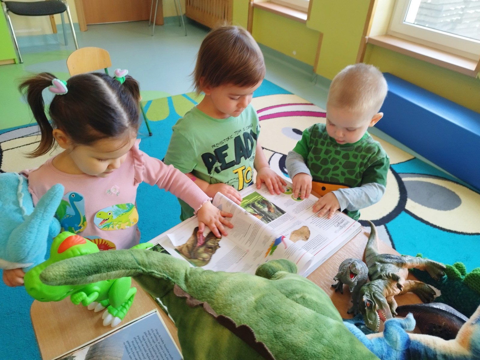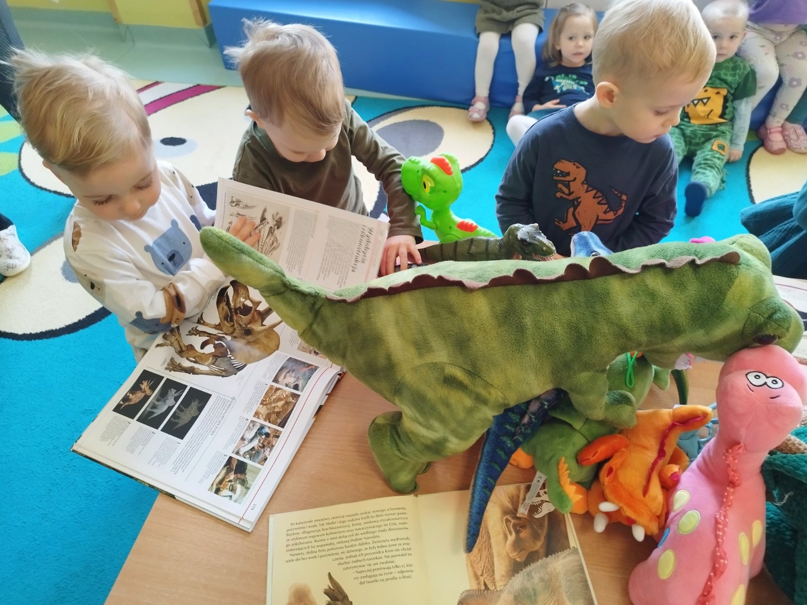 Zdjęcie przedstawia dzieci podczas zajęć tematycznych o dinozaurach.